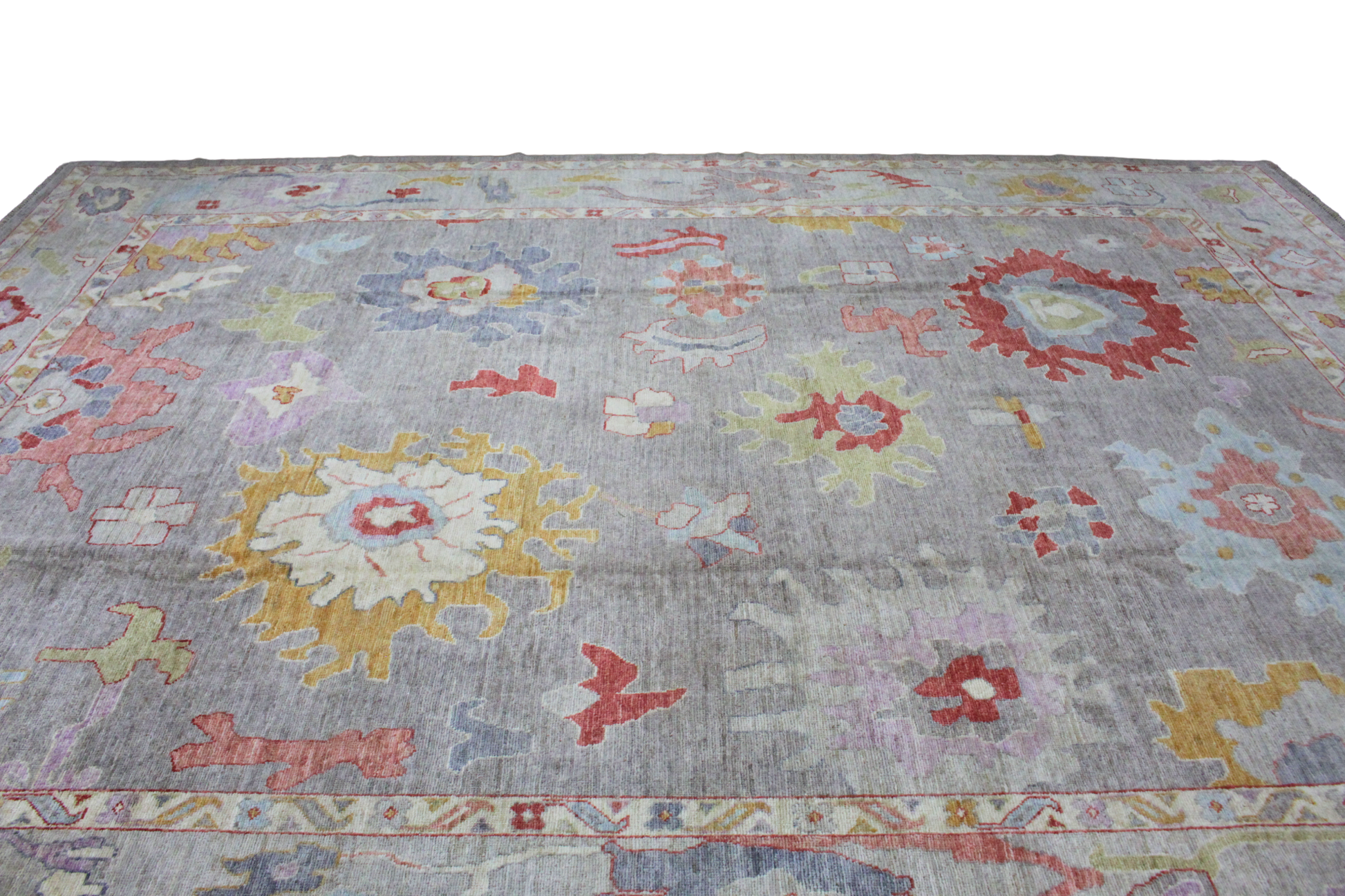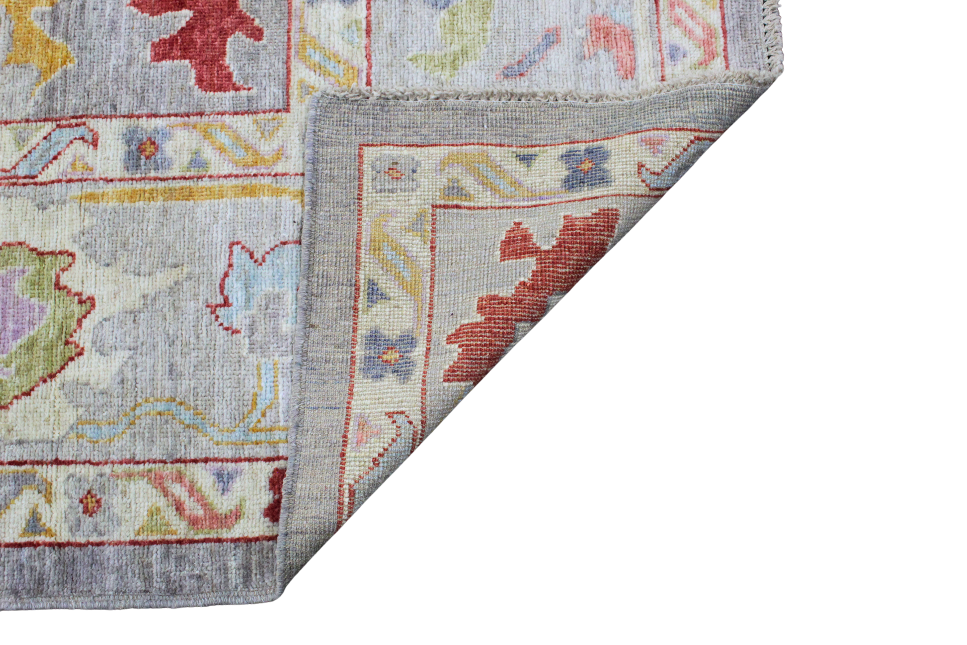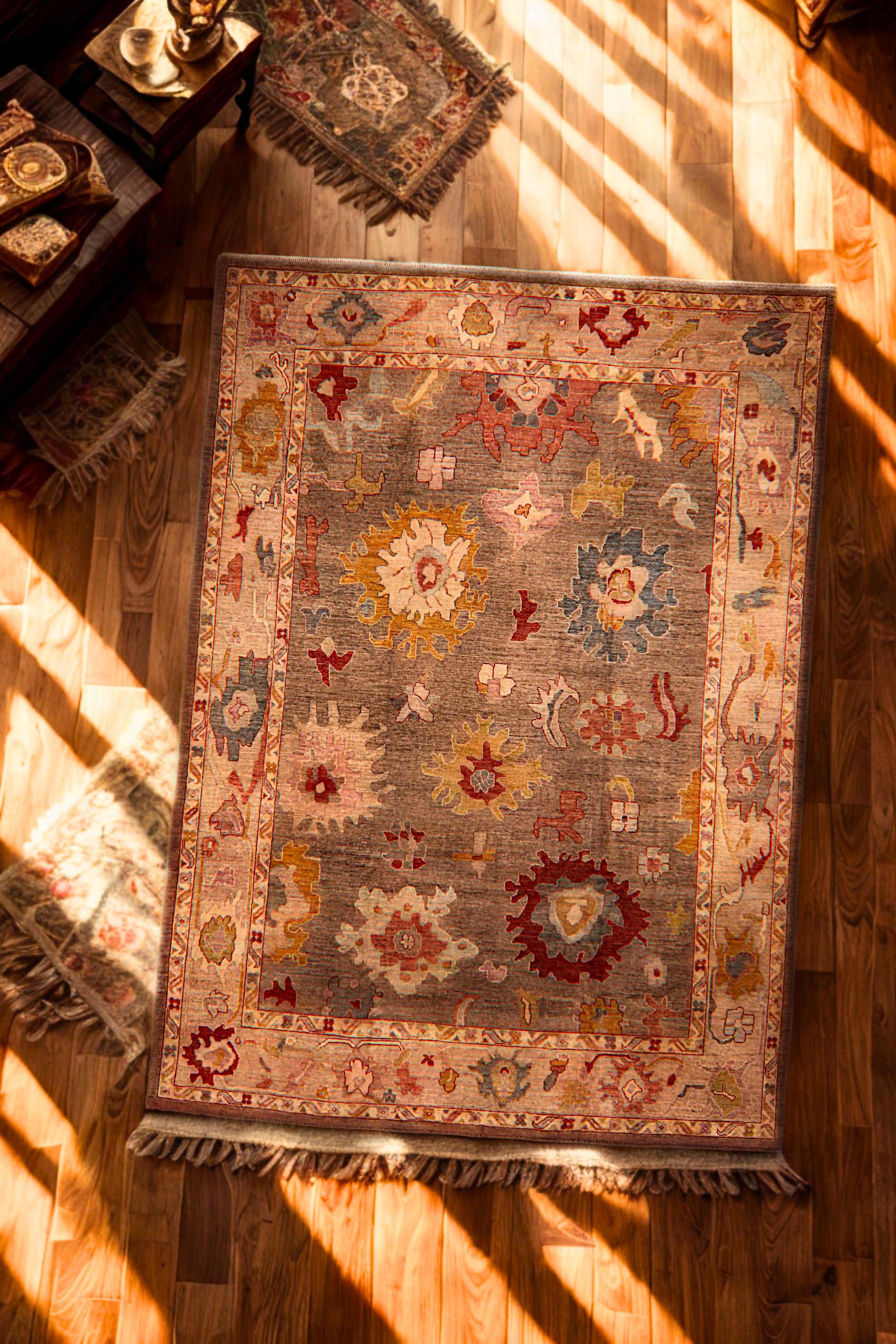 True to the Oushak weaving tradition, the rug features a spacious design layout with generous negative space that allows each motif to breathe. The border carries a meandering vine and blossom design, delicately framing the exuberant central field.