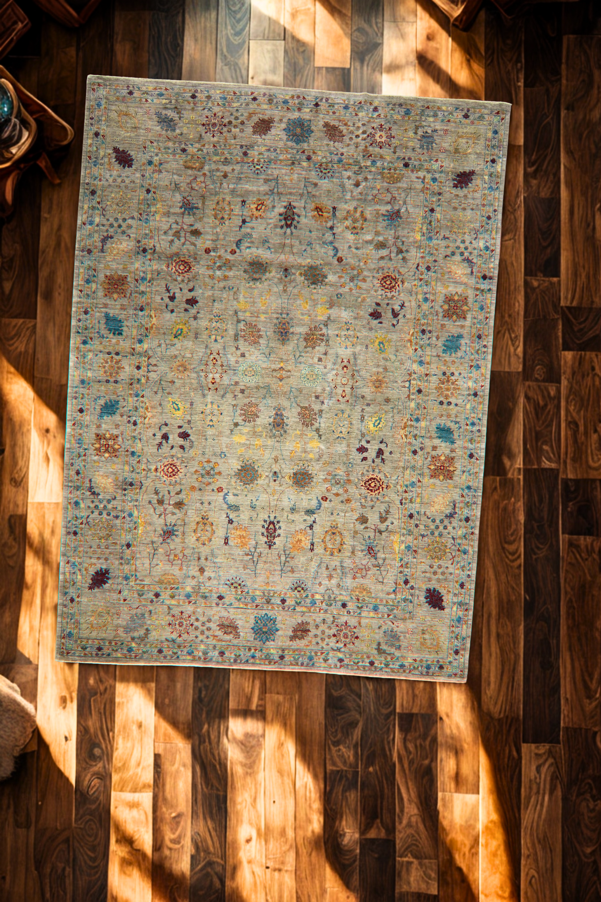 The rug’s gentle abrash (natural variation in dye tone) and intricate detailing are hallmarks of the Ariana weaving tradition—renowned for combining Persian precision with Afghan craftsmanship. Ideal for formal living spaces or refined dining rooms, this piece brings classic artistry into a timeless setting.