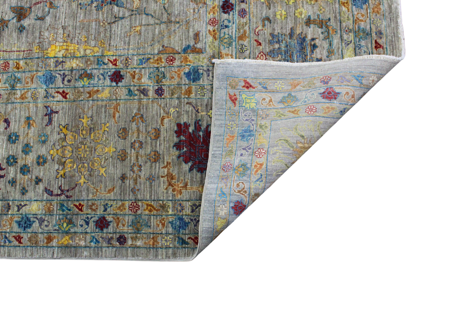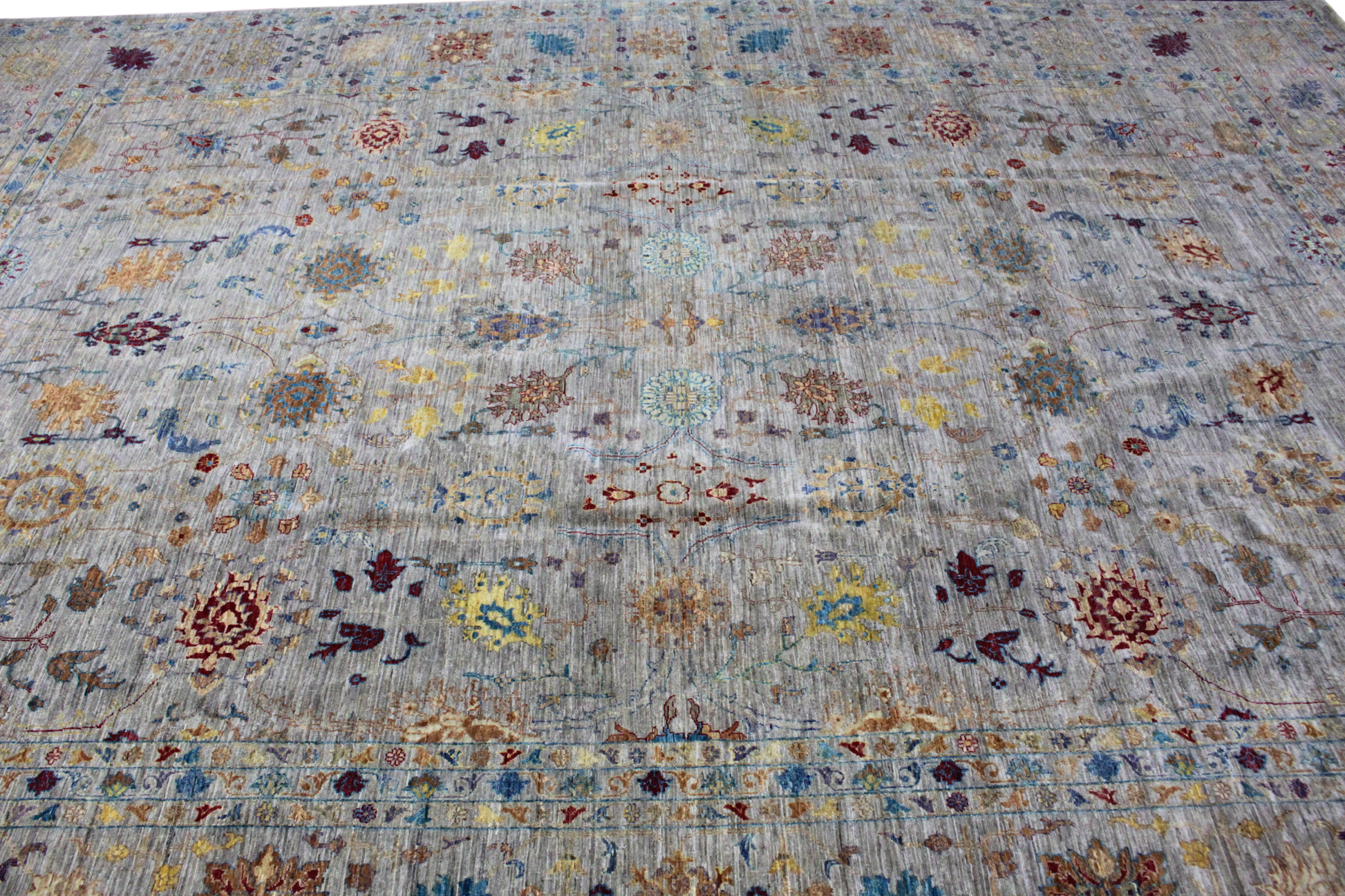 Richly detailed and full of elegance, this Ariana Fine Afghan rug (10 × 13.7 ft) exudes warmth and grandeur with a garden-inspired design spread across a soft, antiqued field. The layout is symmetrically balanced with blossoming florals, graceful tendrils, and stylized palmettes, all hand-knotted in a refined palette of muted gold, turquoise, saffron, coral, maroon, and hints of teal.
