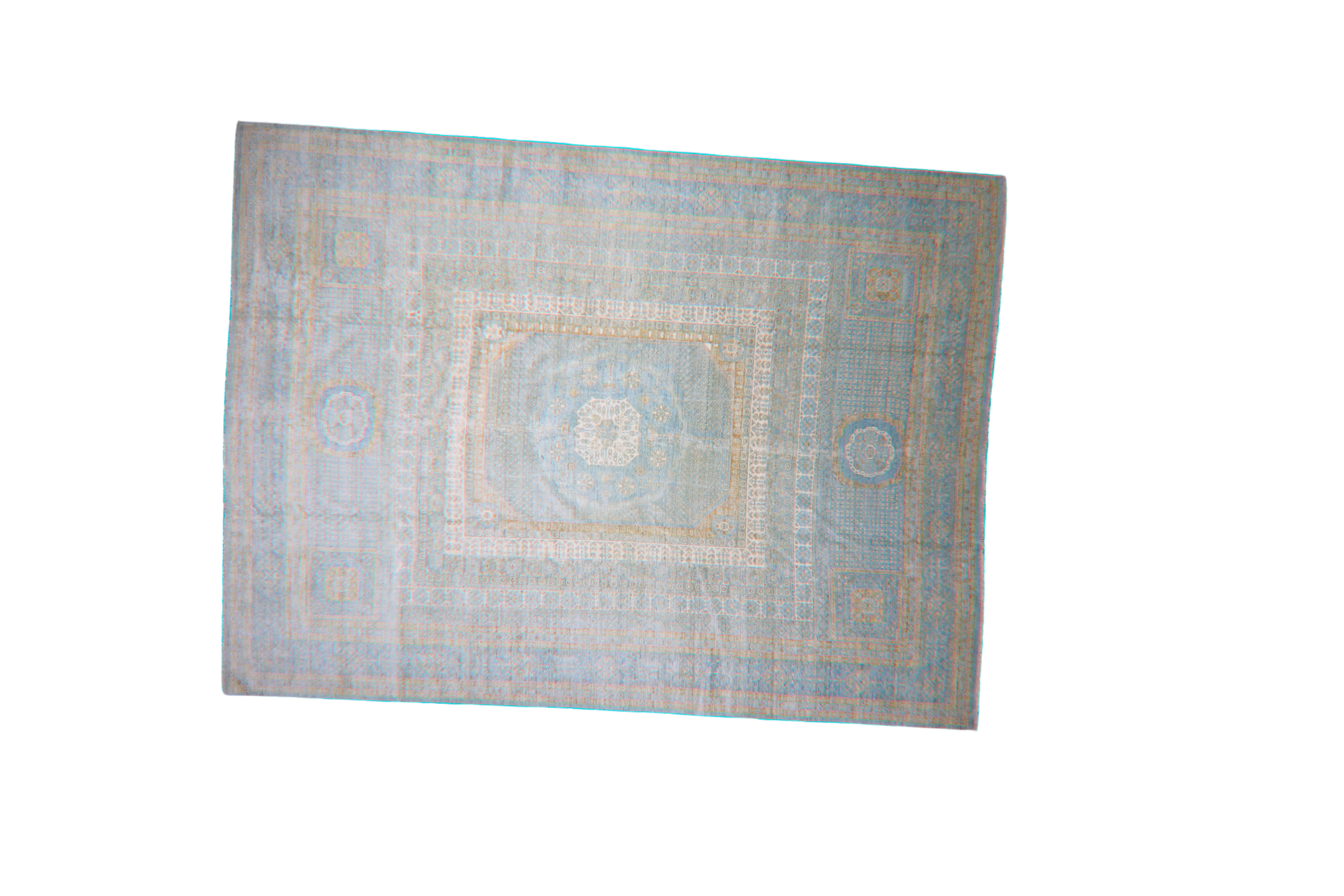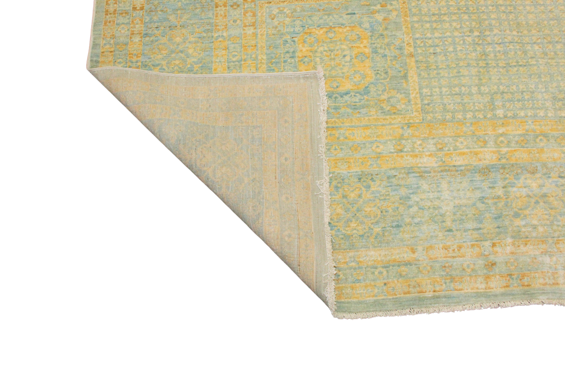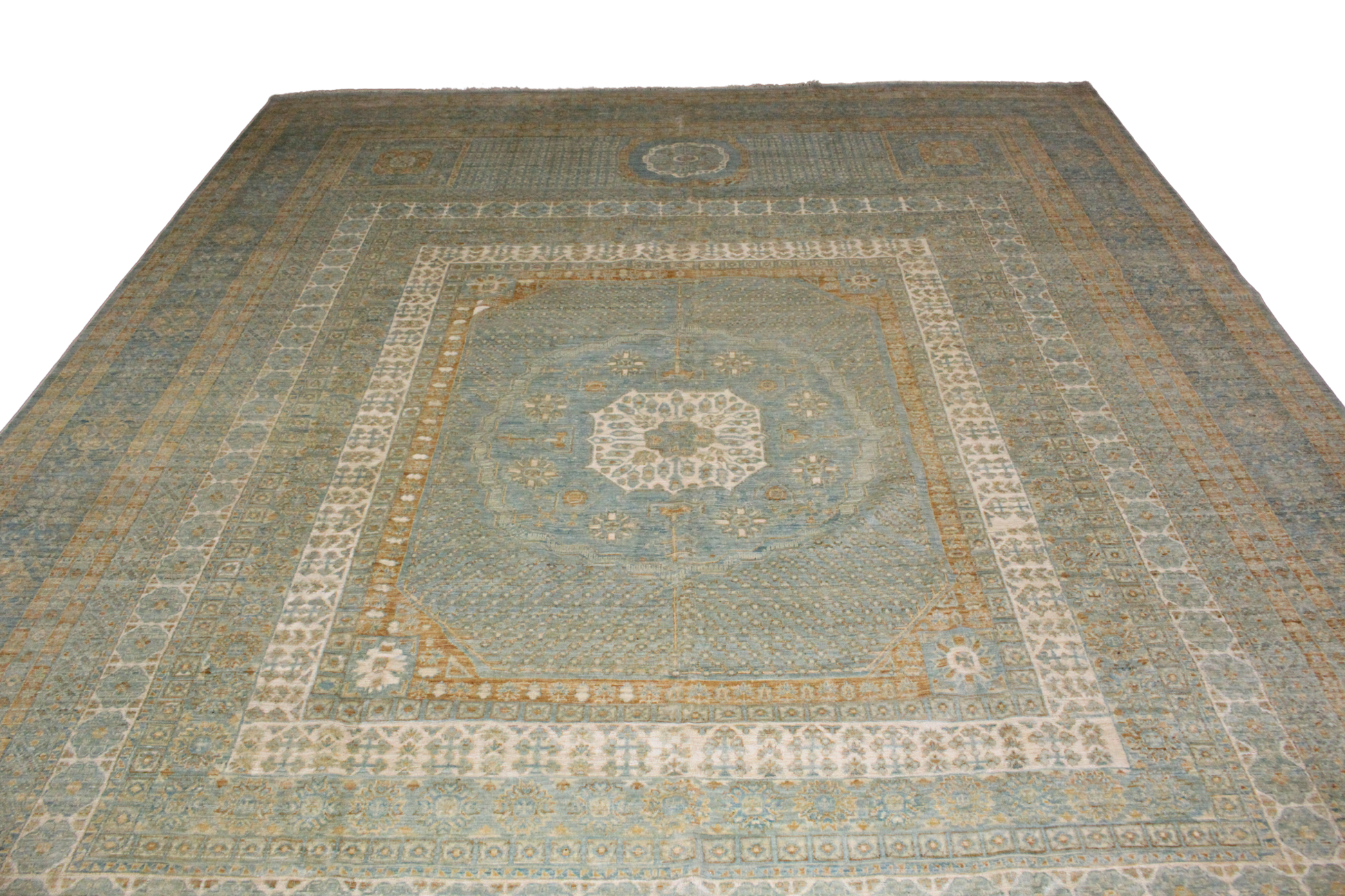 This striking Mamluk rug from Afghanistan is a rare fusion of ancient symmetry and ethereal softness. Rendered in pale celadon and misty aqua tones, its layout revolves around a radiating central medallion enclosed by layered geometric frames and rosette-filled panels — all hallmarks of classical Mamluk design originating from 15th-century Cairo.