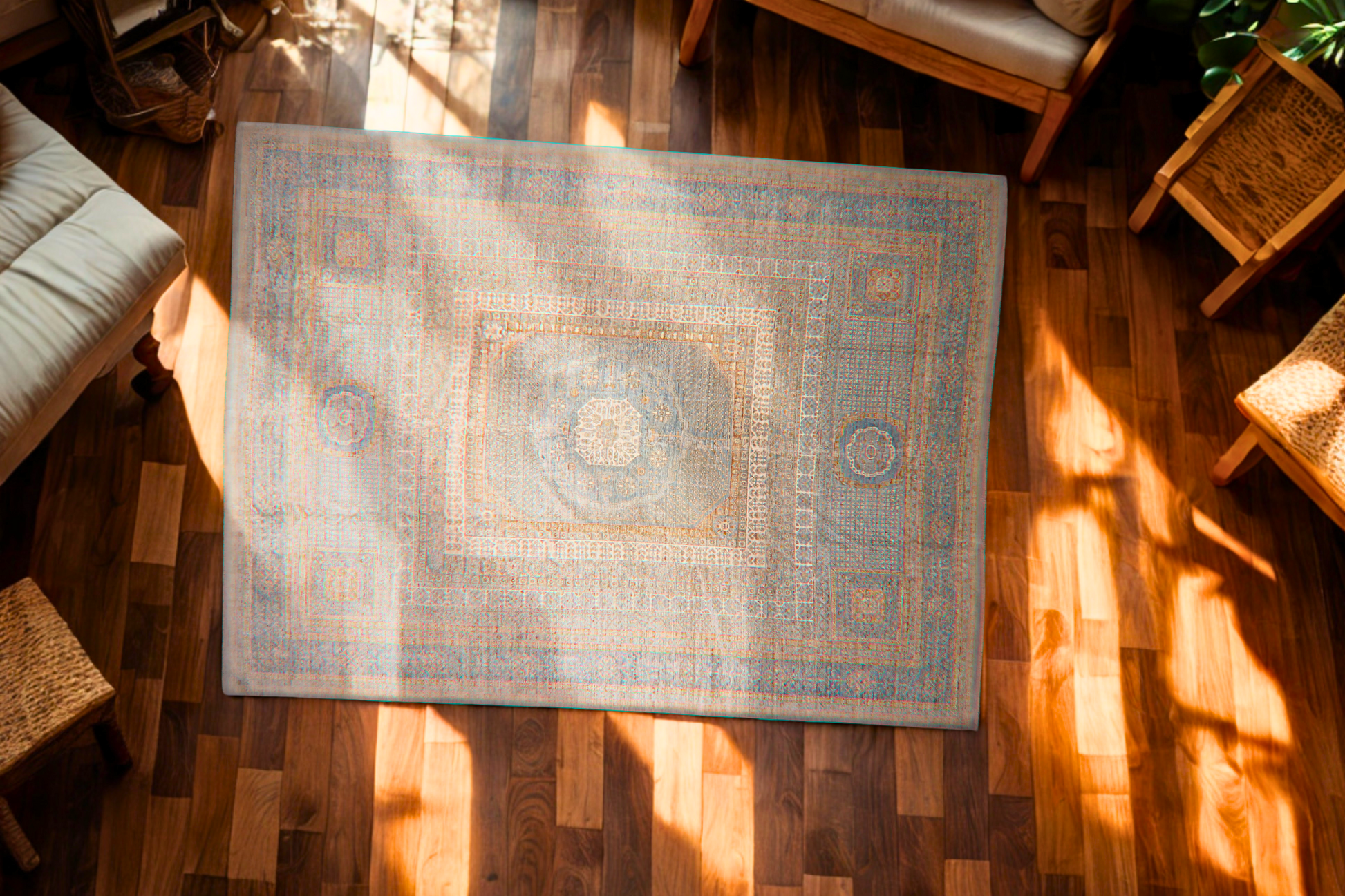The rug’s refined color palette gives the complex architecture of the pattern a tranquil, almost translucent presence, perfect for interiors that crave subtle drama. It invites closer inspection with its delicate detailing and whisper-soft abrash, making it a standout choice for elegant living rooms or serene studies.