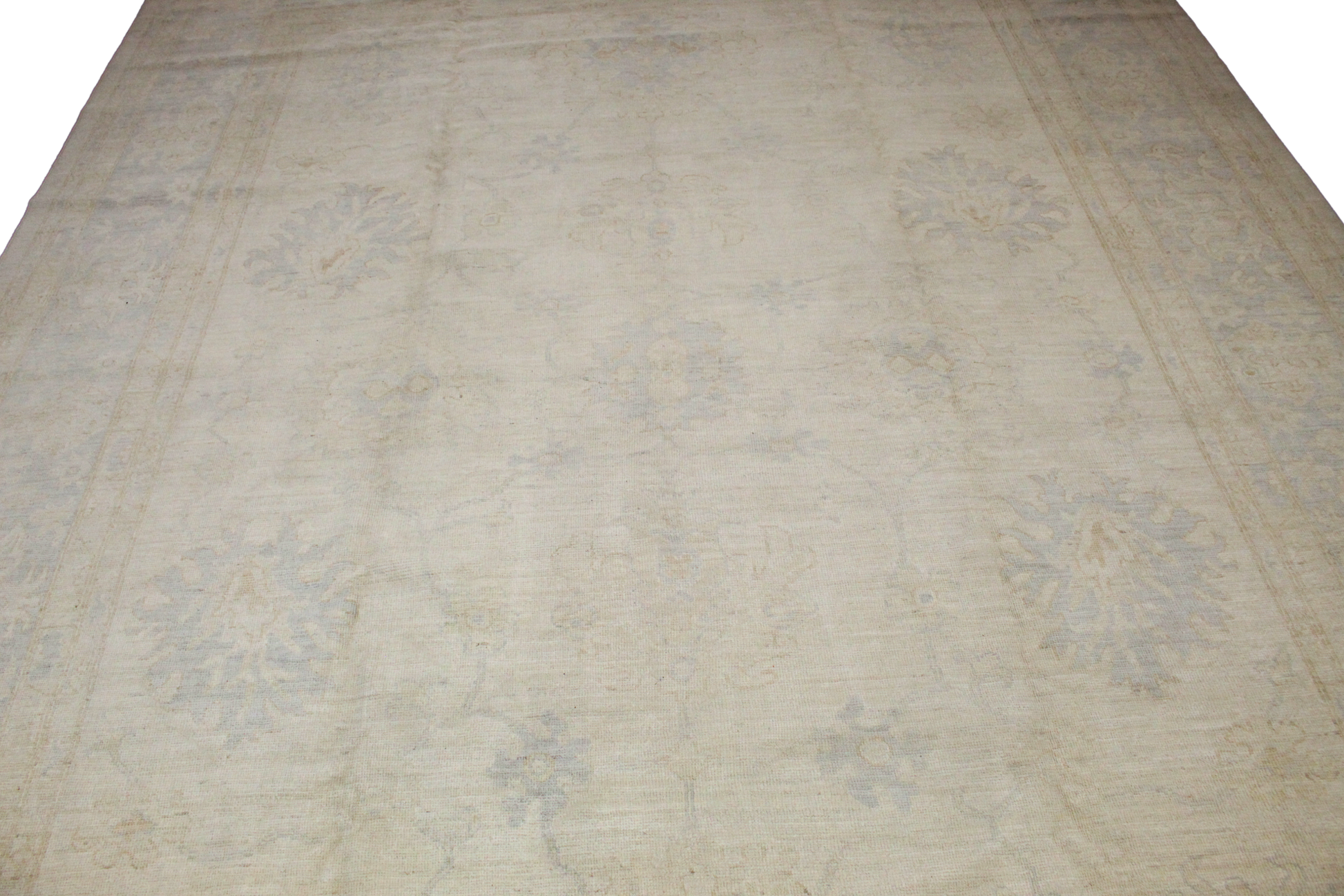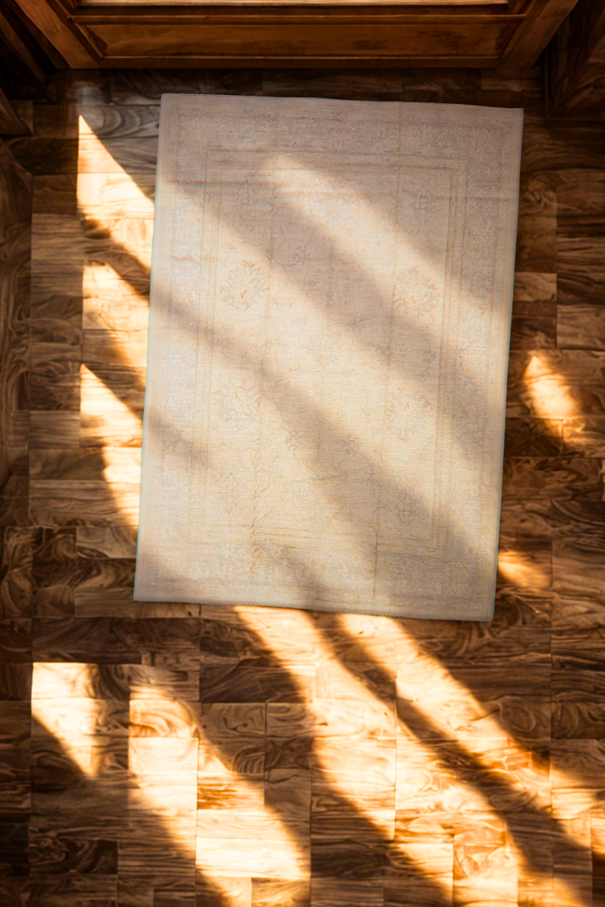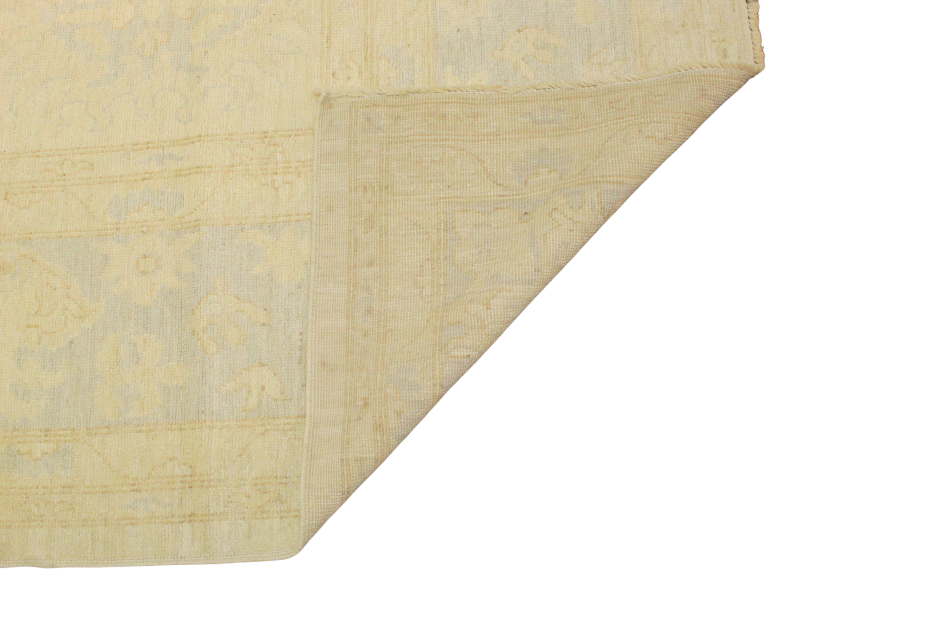 This soft-spoken Khotan rug from Afghanistan exudes refined understatement through its whisper-light color palette and classic East Turkestan design. The pale ivory field is gently adorned with faded botanical medallions and scrolling vine motifs, all rendered in barely-there tones of powder blue and muted sand. Its faded patina and ghostlike symmetry lend the rug an antique air, even though it is newly hand-knotted.