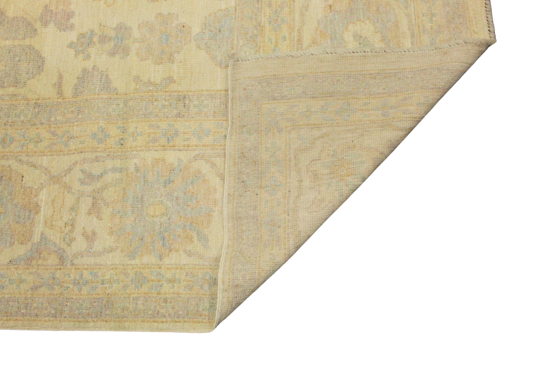 Elegant and serene, this 9.9 × 13.10 ft Afghan Khotan rug evokes the subtle majesty of Central Asian weaving with its intricate floral medallions and gently scrolling vines. The muted ivory base is kissed with ethereal tones of pale blue, misty taupe, and sandstone, forming a harmonious balance that feels both timeless and tailored. Its refined border architecture frames the lush garden of motifs within, while the slightly faded, distressed finish adds a layer of vintage charm.