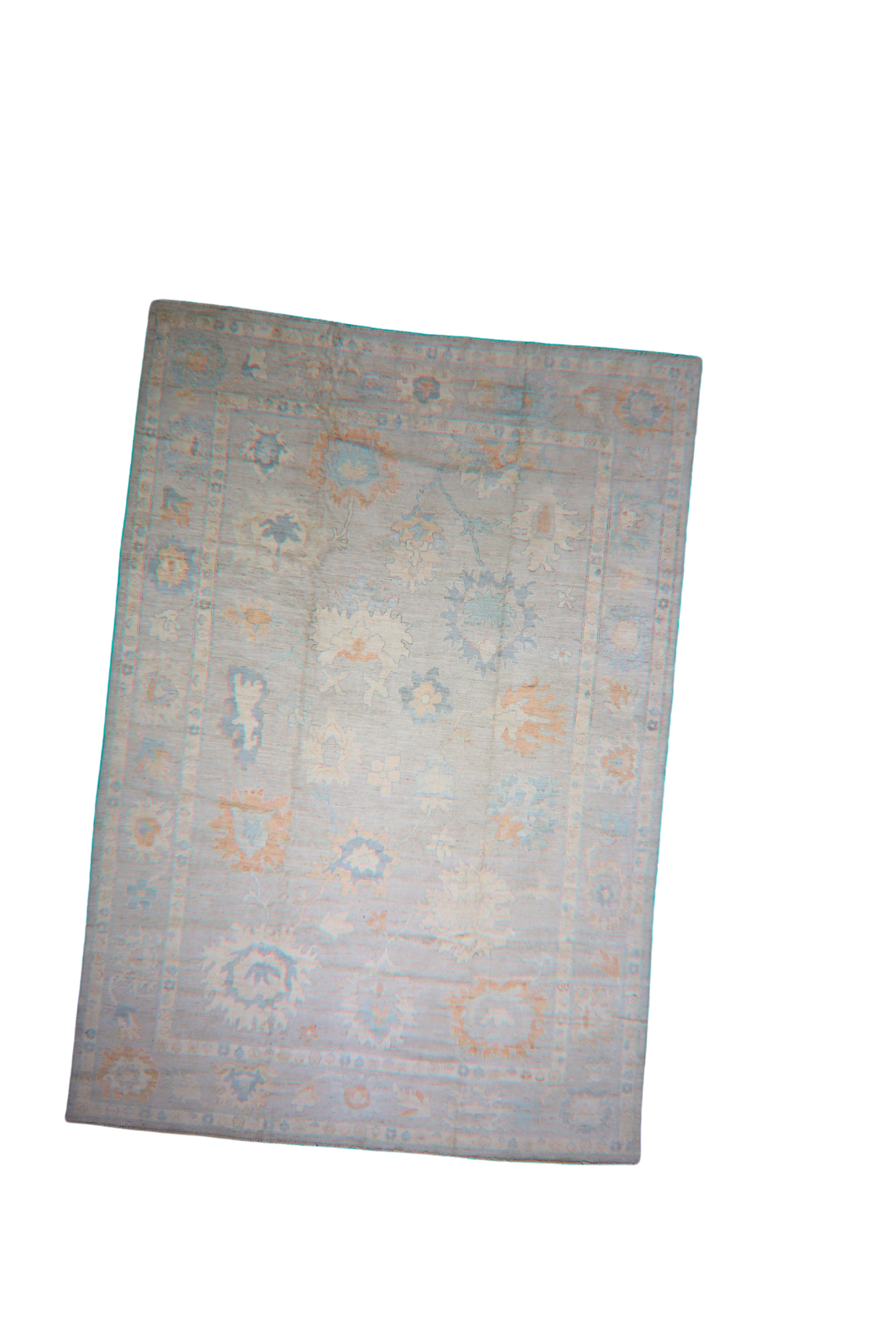 With its gently sun-faded palette and airy floral motifs, this hand-knotted Oushak rug from Afghanistan captures the timeless charm of Anatolian design in soft, modern tones. The pale sandstone field is scattered with oversized palmettes and rosettes in muted hues of peach, powder blue, ivory, and cloud grey — giving the composition a weathered, almost watercolor-like quality.