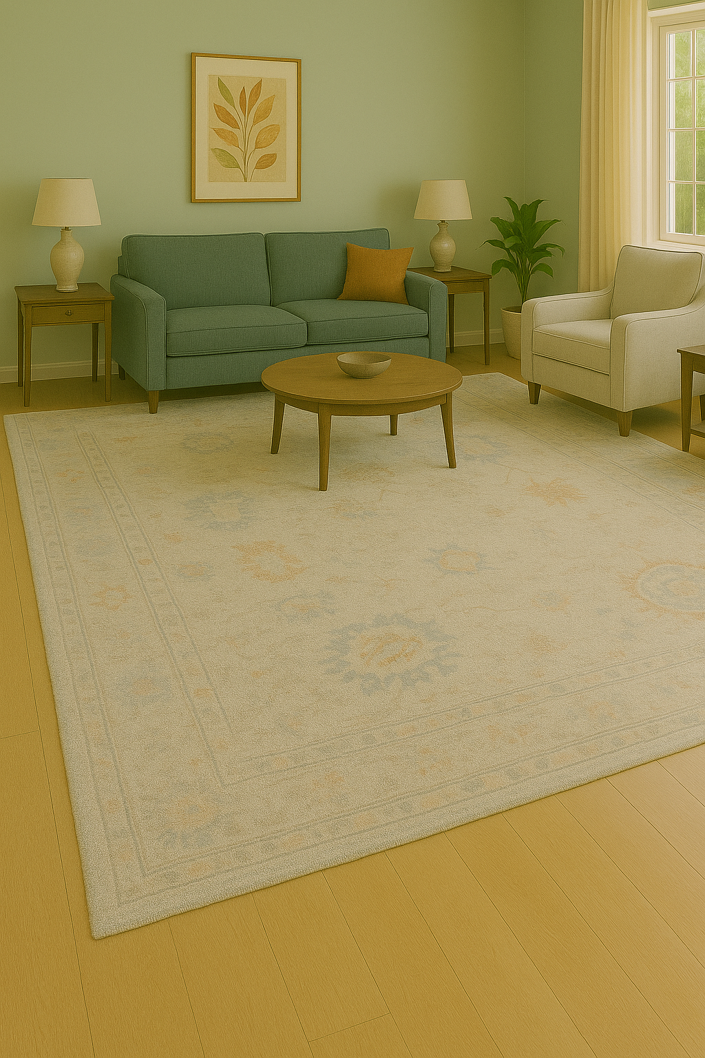 The subtle abrash and spacious patterning offer a calming, breathable look perfect for expansive interiors that favor warmth without saturation. It’s an ideal piece for open-concept living areas, serene bedrooms, or relaxed dining spaces.