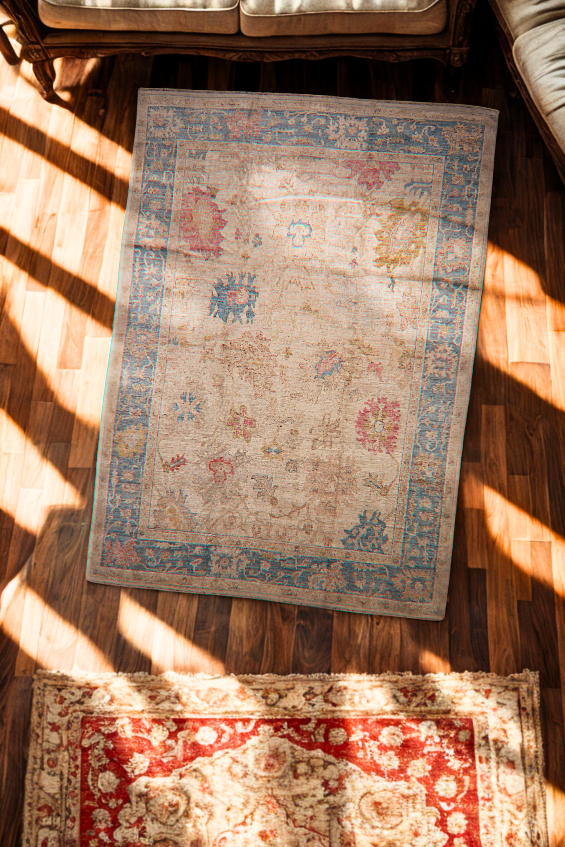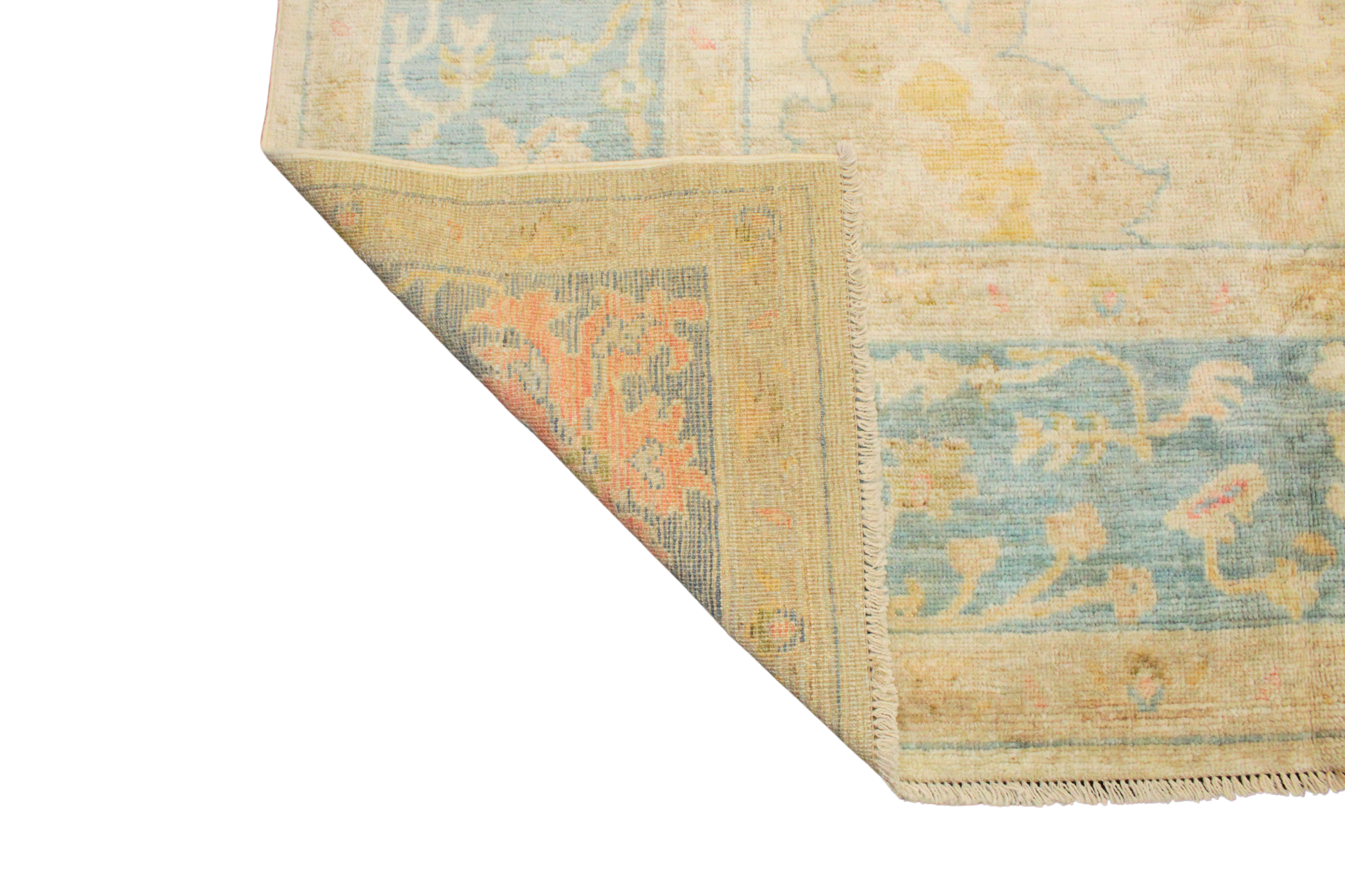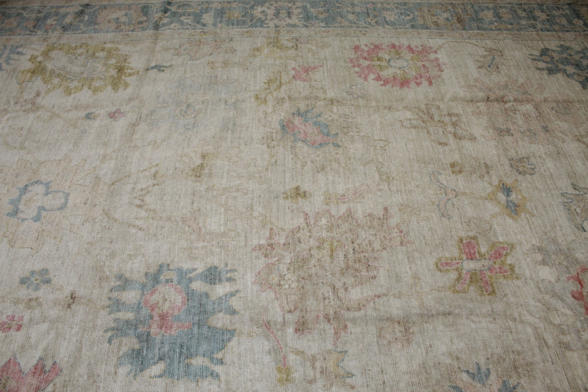 A masterclass in understated beauty, this 9.11x13.8 ft Oushak rug from Afghanistan brings a breezy, sunwashed look to any space. Its ivory ground is gently adorned with large-scale floral motifs in faded aqua, blush, sunflower yellow, and antique rose — a palette that feels both delicate and joyful. The intricately drawn border frames the field with poise, while the wool's subtle luster adds dimension and warmth.