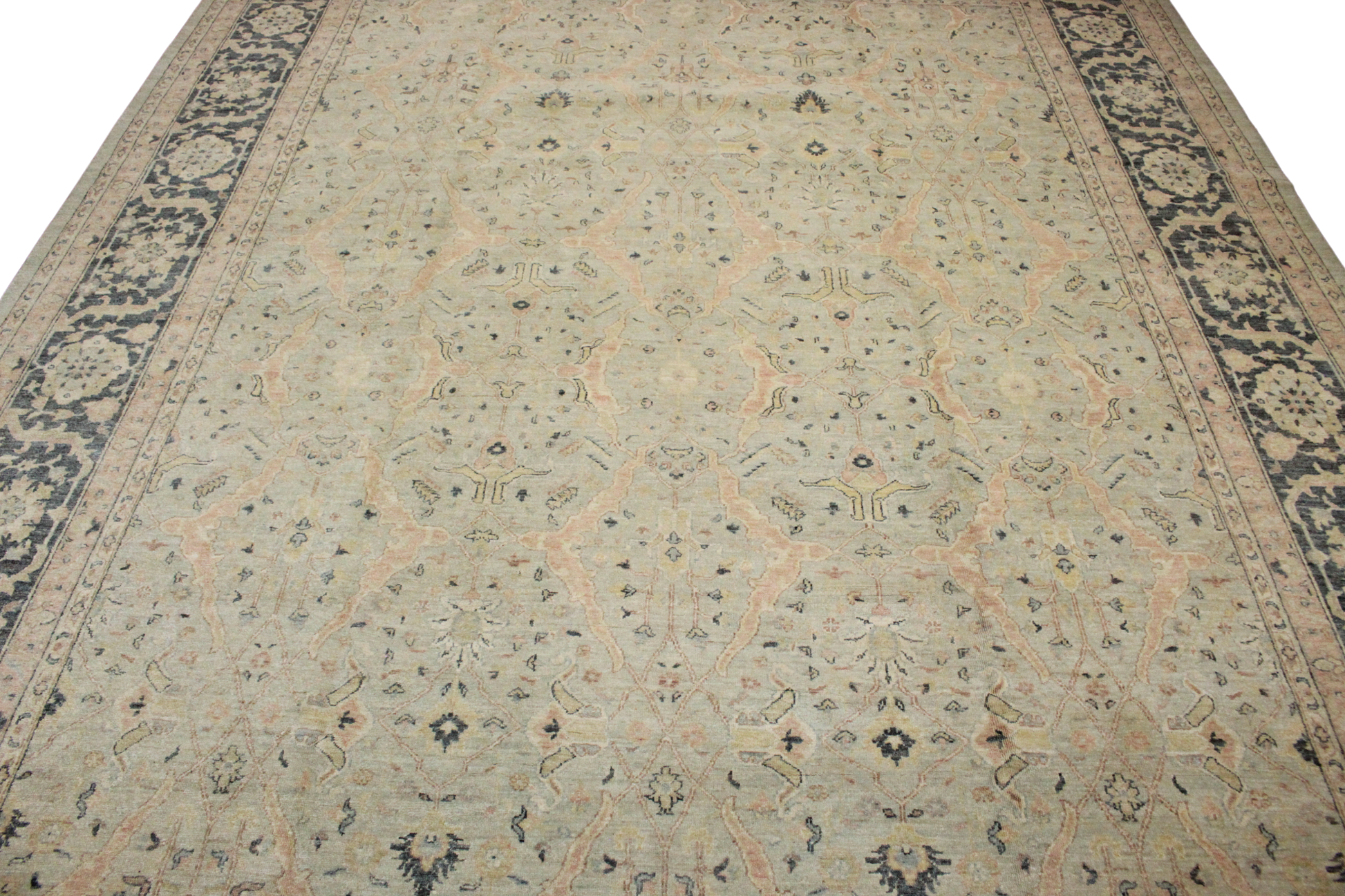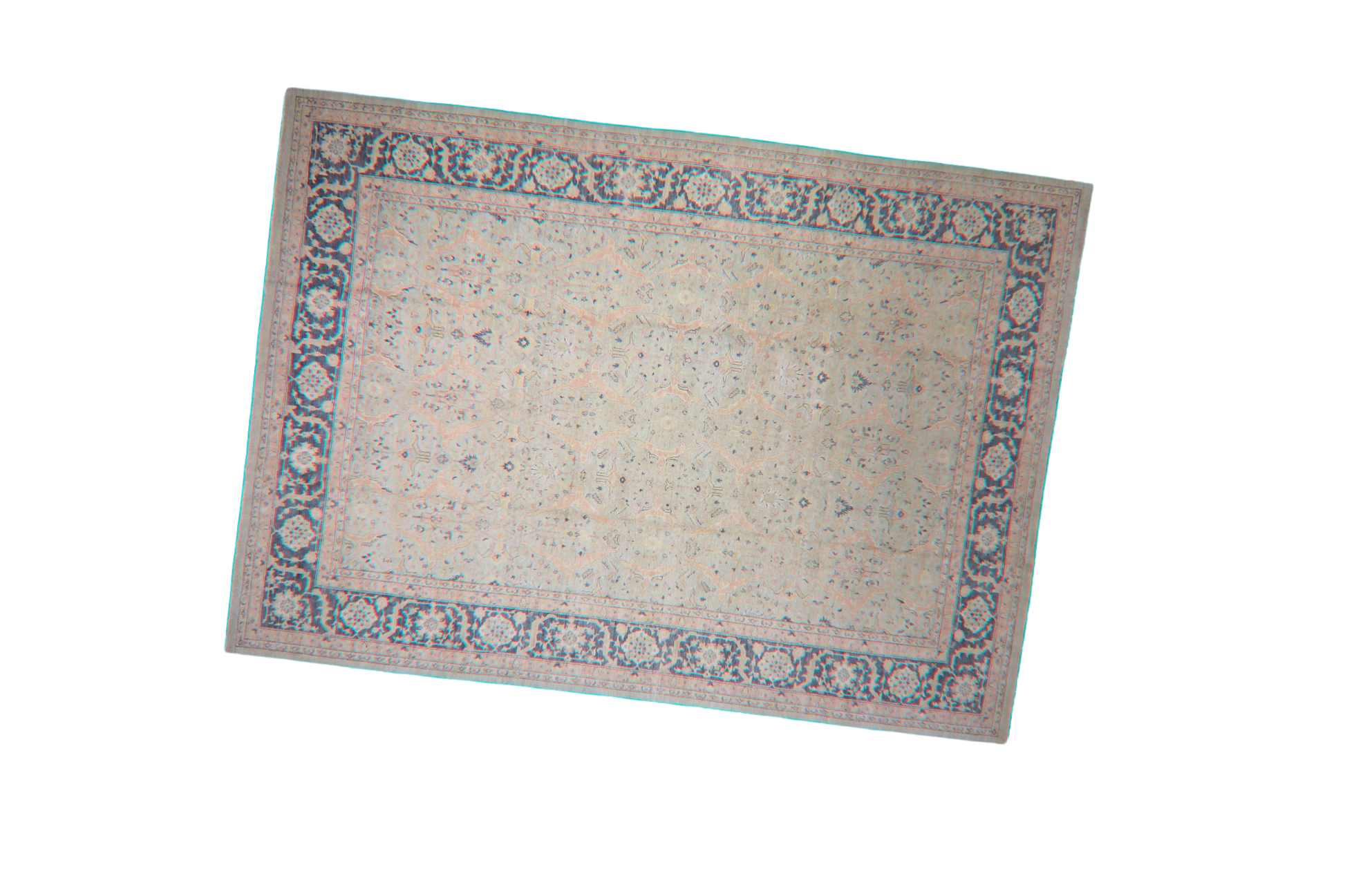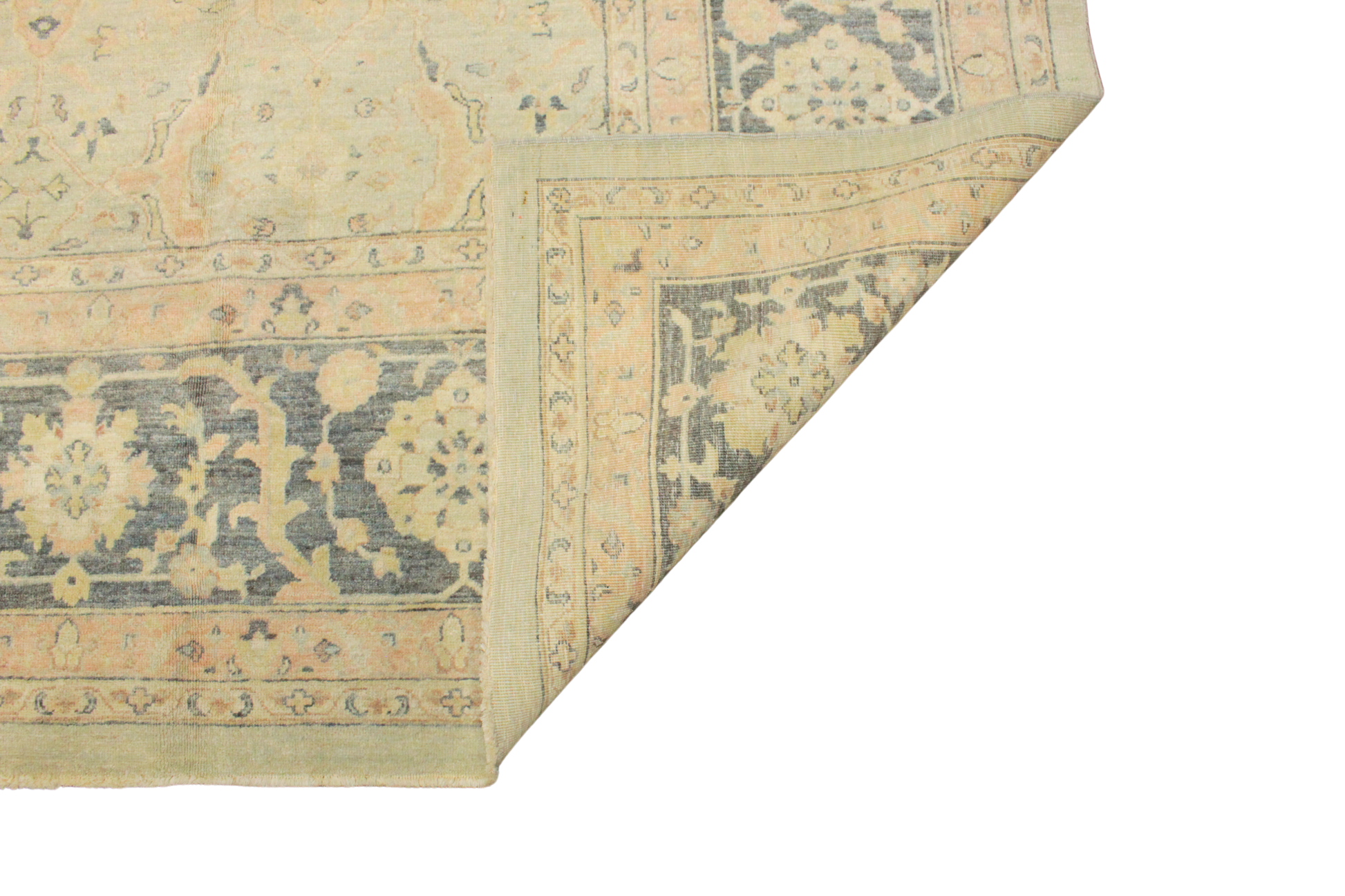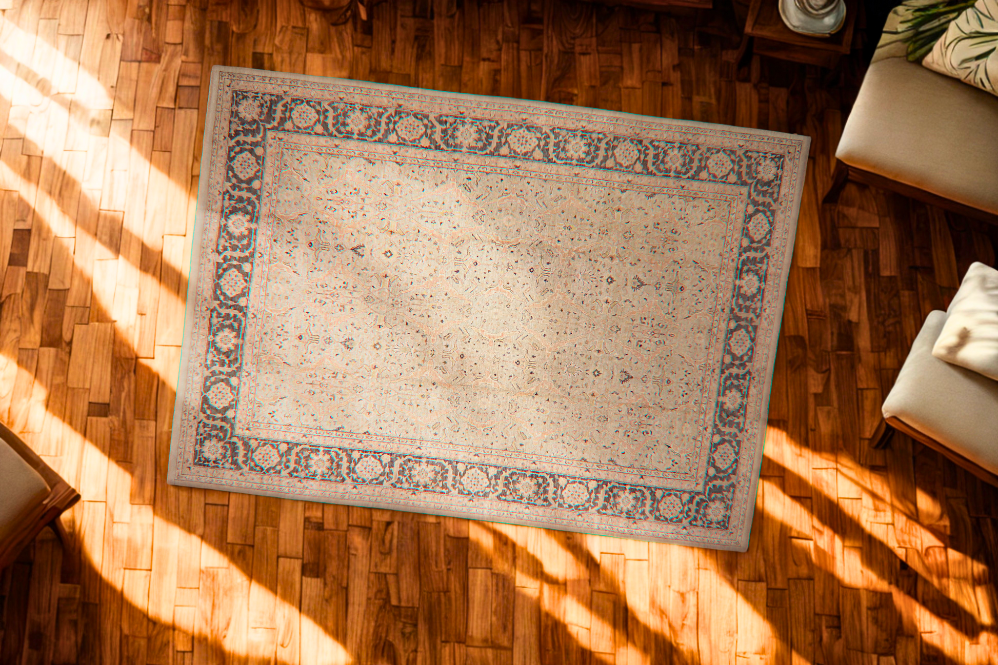 With its graceful geometry and calming palette, this Ariana rug from Afghanistan (measuring 9.10 × 13.8 feet) embodies understated luxury. The intricate allover pattern—featuring delicate floral motifs and elegant medallions—unfolds in a harmonious blend of ivory, slate blue, and faded charcoal, framed by a richly detailed border. Its dense weave and exceptional craftsmanship make it not only a visual masterpiece but also a durable foundation for any refined space.