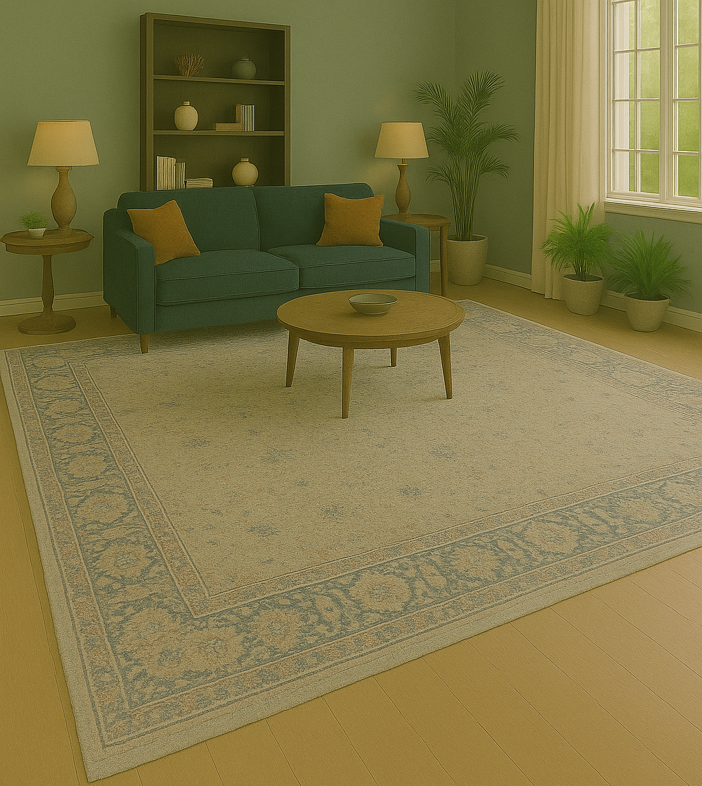 The rug’s cool tones and symmetrical design bring structure and balance to a room, making it a superb choice for a formal living area, upscale dining room, or serene master suite. It speaks softly, yet leaves a lasting impression.