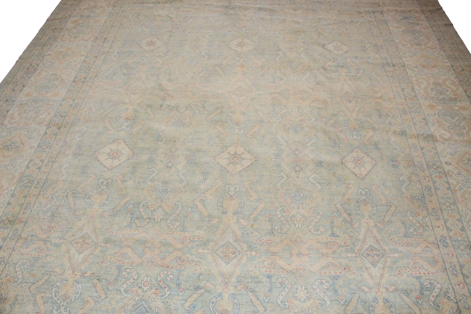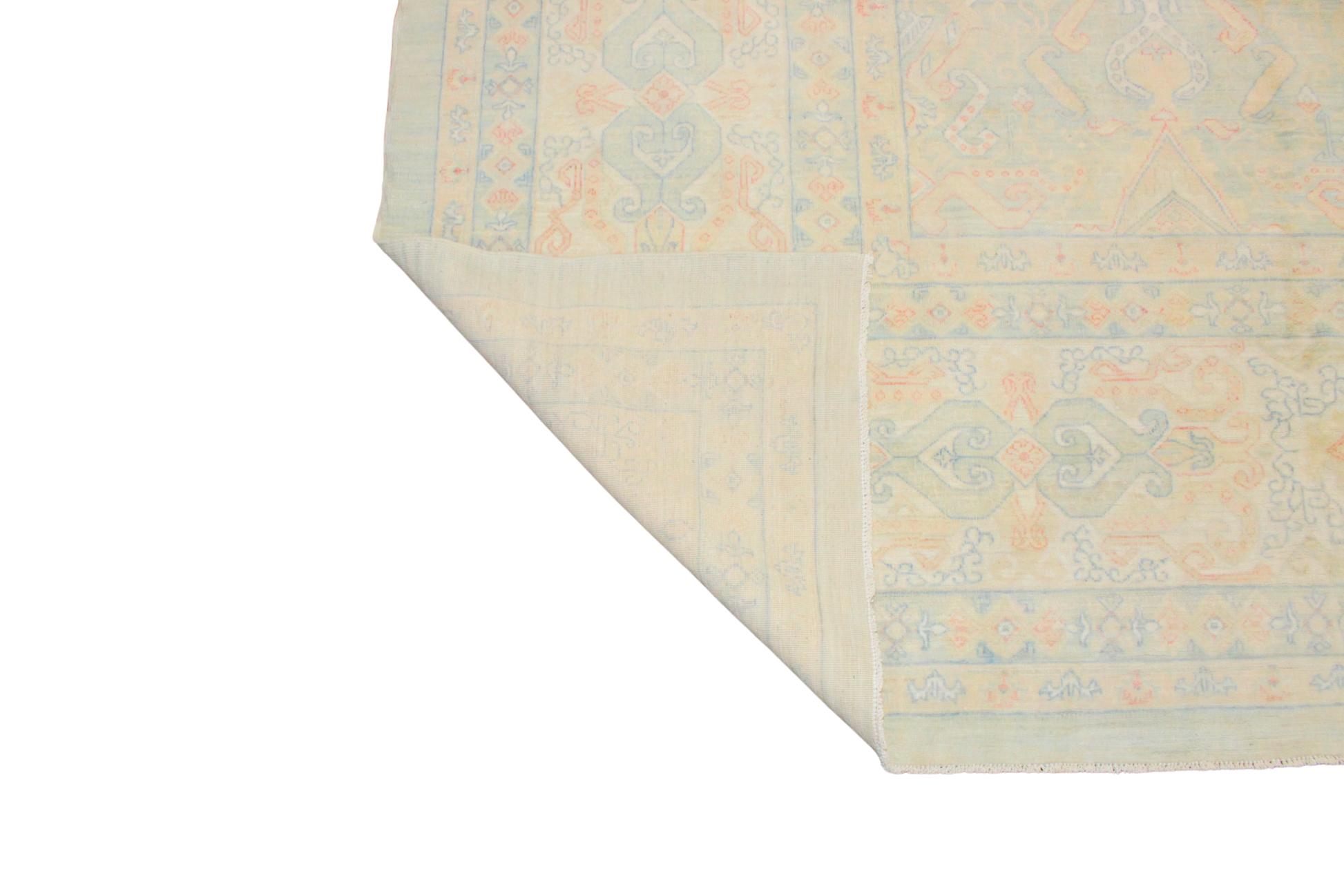 This elegant Afghan Oushak rug, sized at 10 × 13.4 feet, captures a timeless charm with its airy composition and gently faded palette. The design features a refined allover pattern of geometric medallions and stylized florals, framed by layered borders in harmonious symmetry. Rendered in delicate shades of powdered blue, pale sand, and ivory, the piece evokes a sense of tranquility and heritage craftsmanship. The muted tones and soft texture lend a cloud-like presence that calms and elevates any interior.