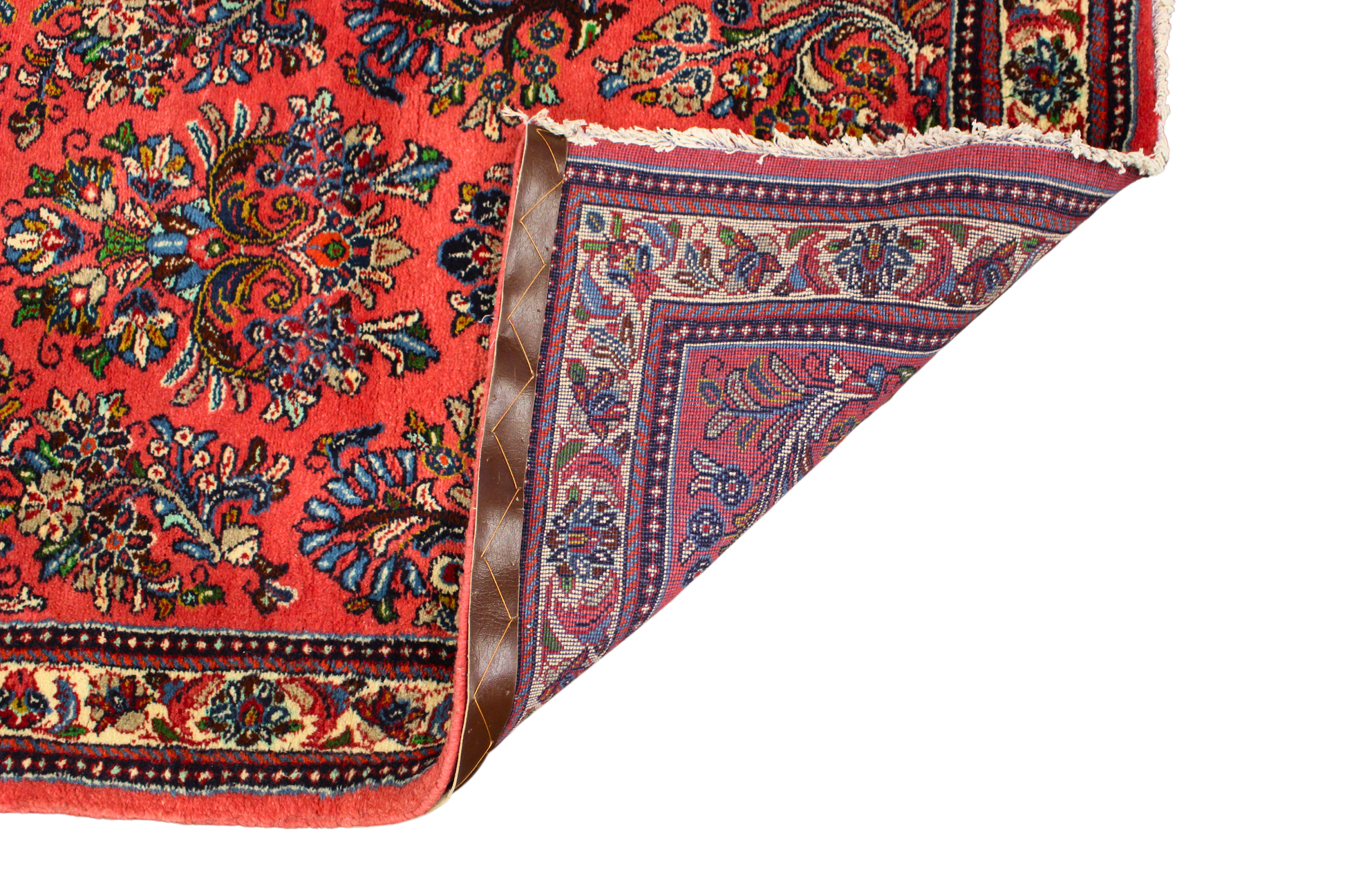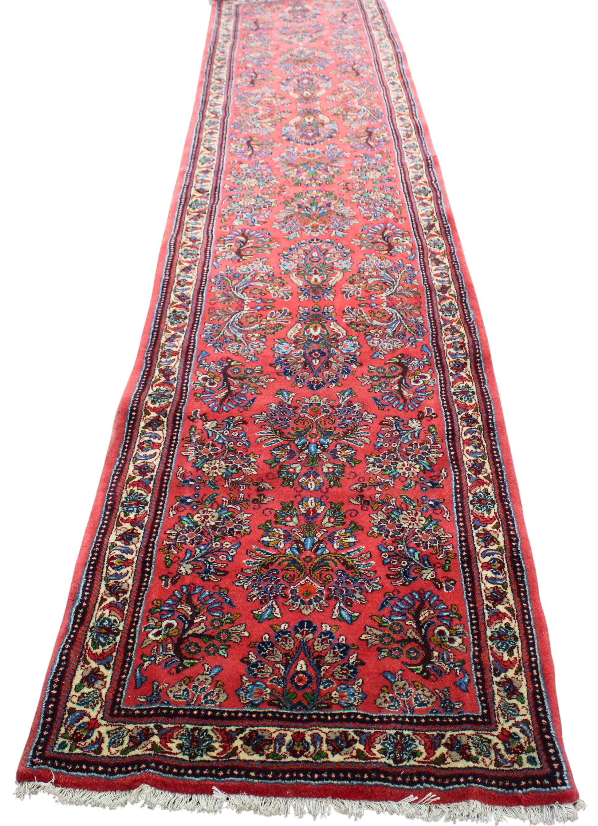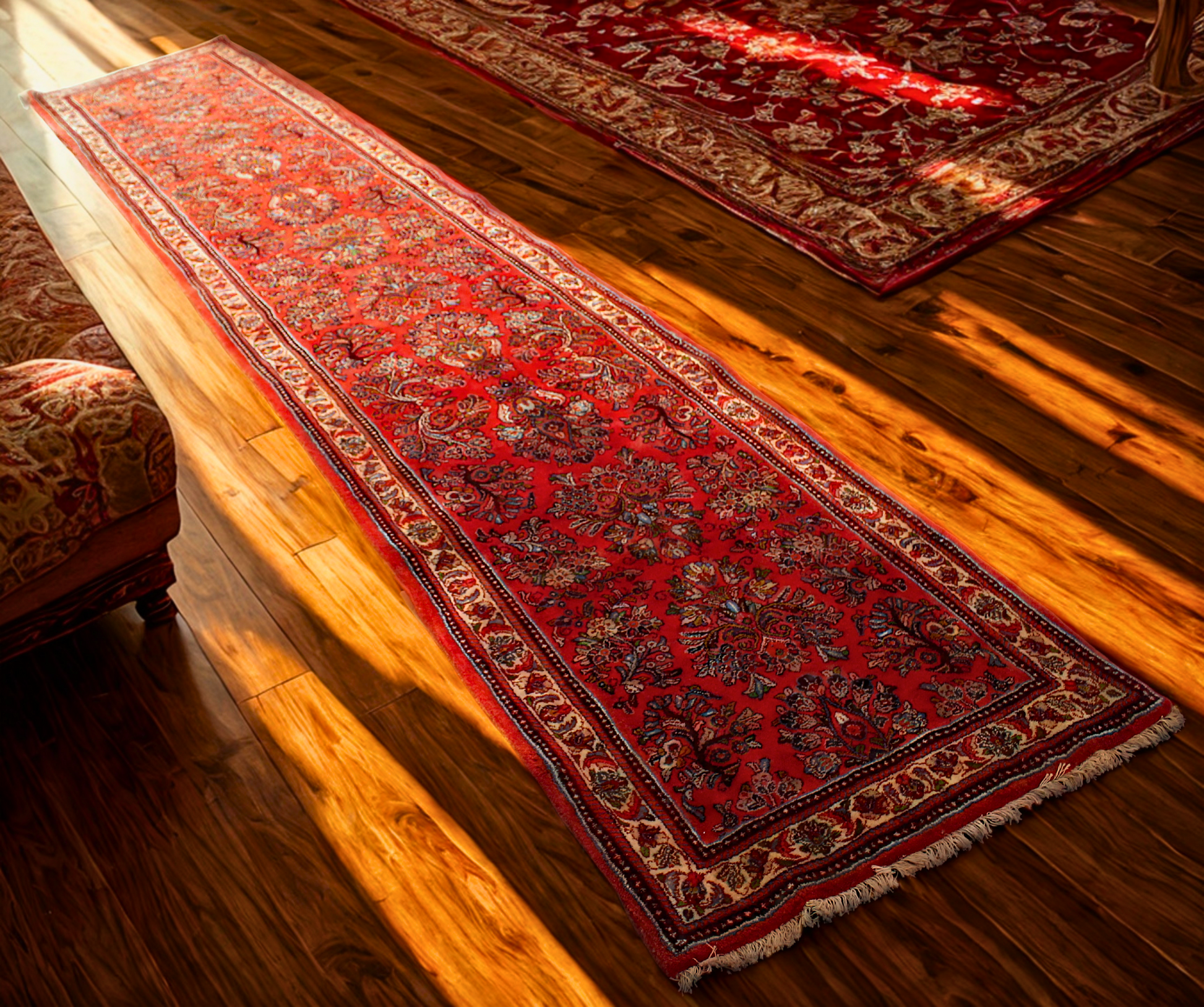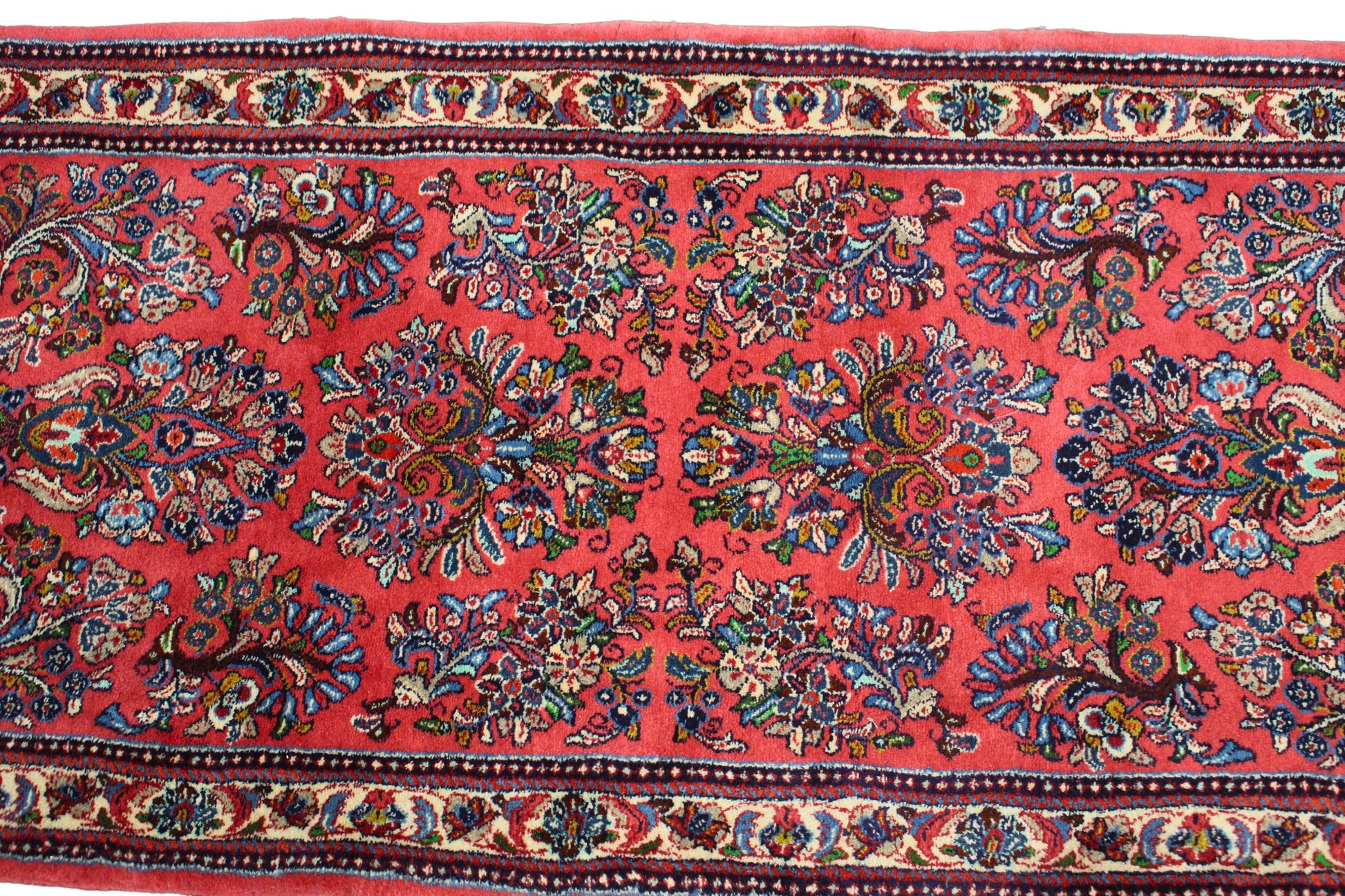 Regal and radiant, this antique Persian Sarouk runner (2.10 × 14.8 ft) showcases the refined floral artistry for which Sarouk rugs are famed. The brilliant rose-red field bursts with symmetrically arranged floral bouquets, crowned medallions, and sweeping arabesques — all intricately knotted in rich navy, cobalt, soft cream, and verdant green.