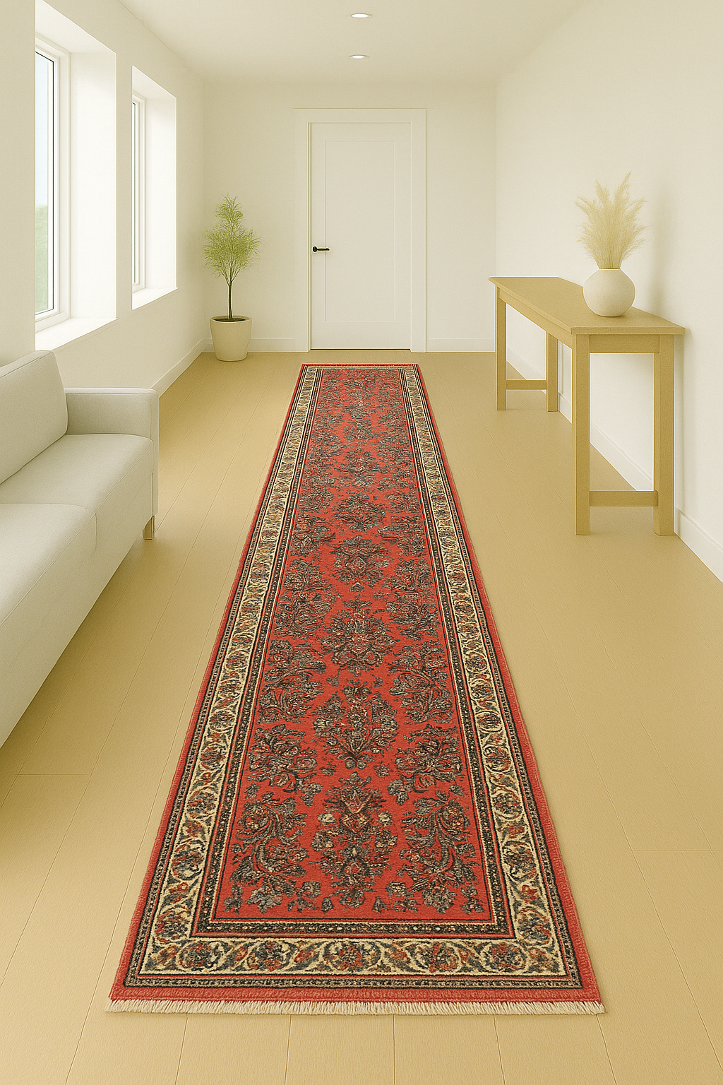 The tightly composed field is framed by a classic Herati-style border featuring scrolling vines and floral rosettes in cool ivory tones, balancing the saturated center. This runner’s narrow yet commanding format makes it ideal for elegant corridors, gallery walkways, or flanking long entry halls with stately charm.