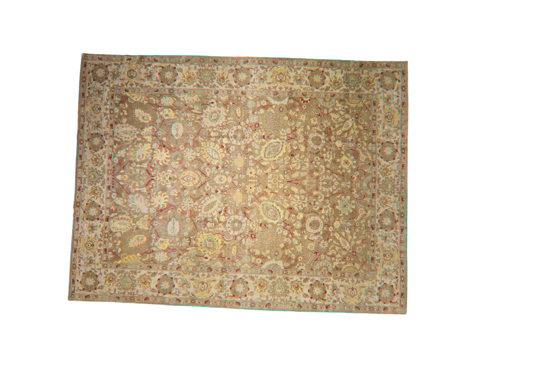 Exuding the quiet grandeur of classical Anatolian weaving, this Fine Oushak rug from Turkey (10.5 × 13.10 ft) offers a rich yet understated aesthetic. The balanced allover pattern is woven in a palette of sandy taupe, muted gold, pale sage, and clay red — earthy tones that lend themselves beautifully to both traditional and transitional interiors.