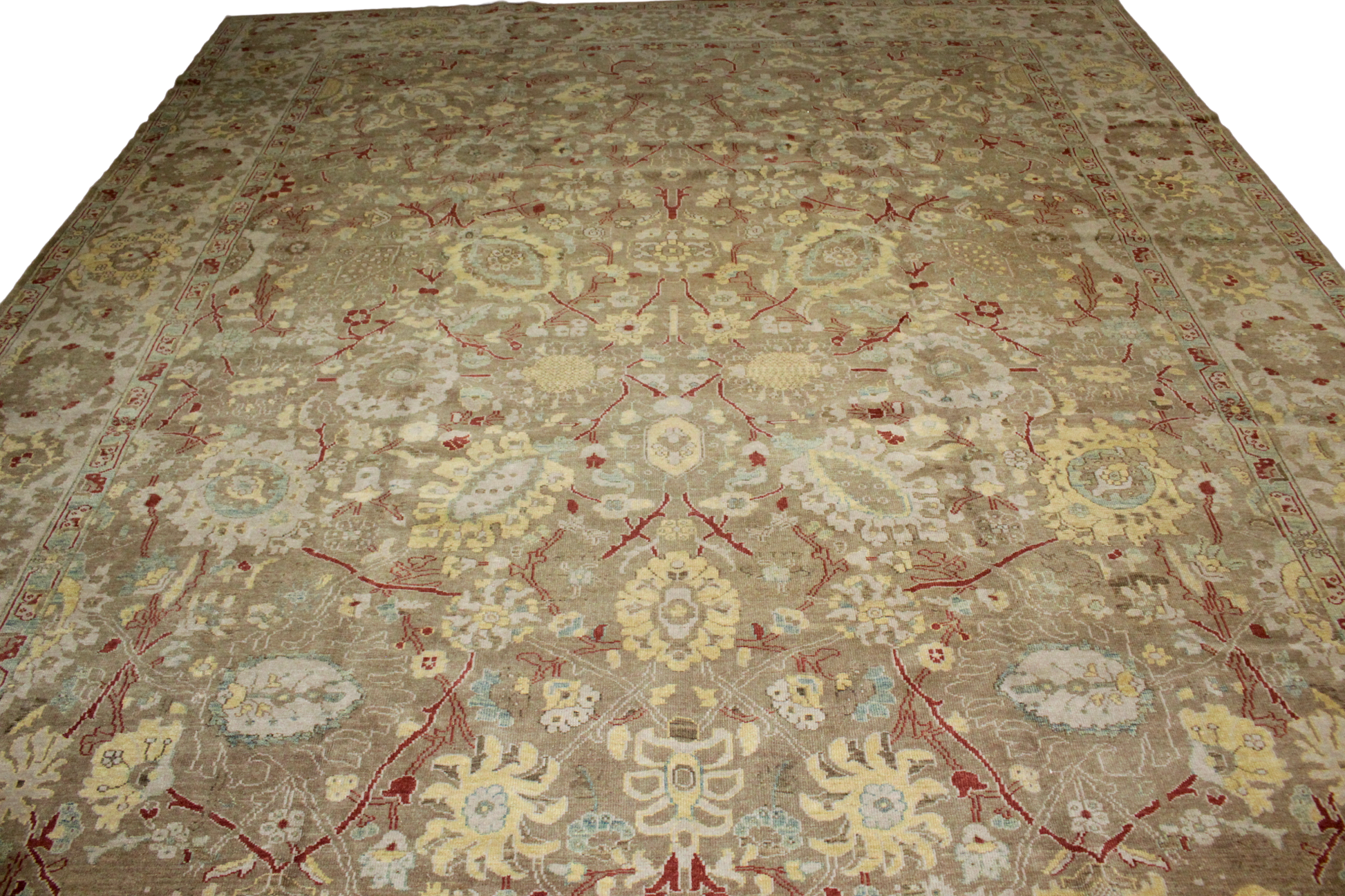 The hand-knotted wool construction reveals graceful palmettes, stylized florals, and intricate vine work, framed by a detailed border that flows with elegant rhythm. This piece is particularly well-suited for grounding larger living areas, open dining spaces, or master bedrooms with its warm sophistication and refined presence.