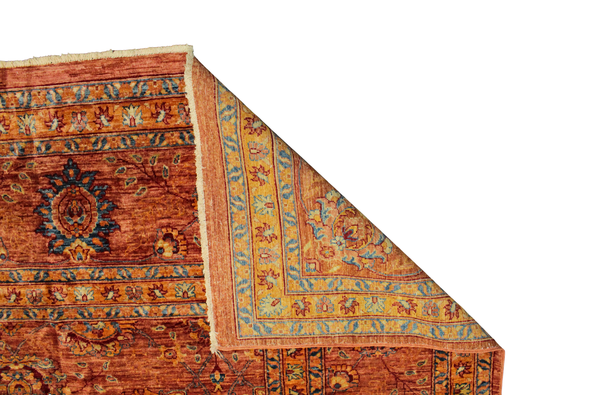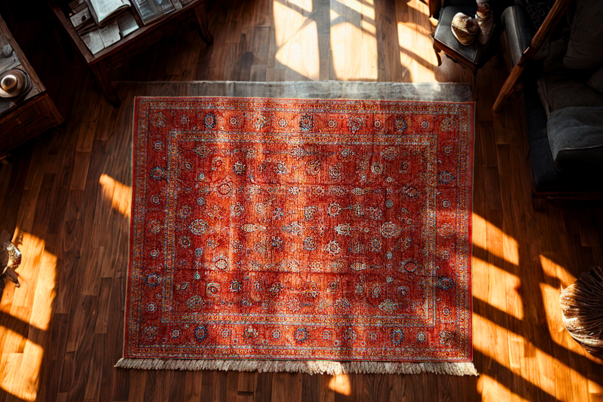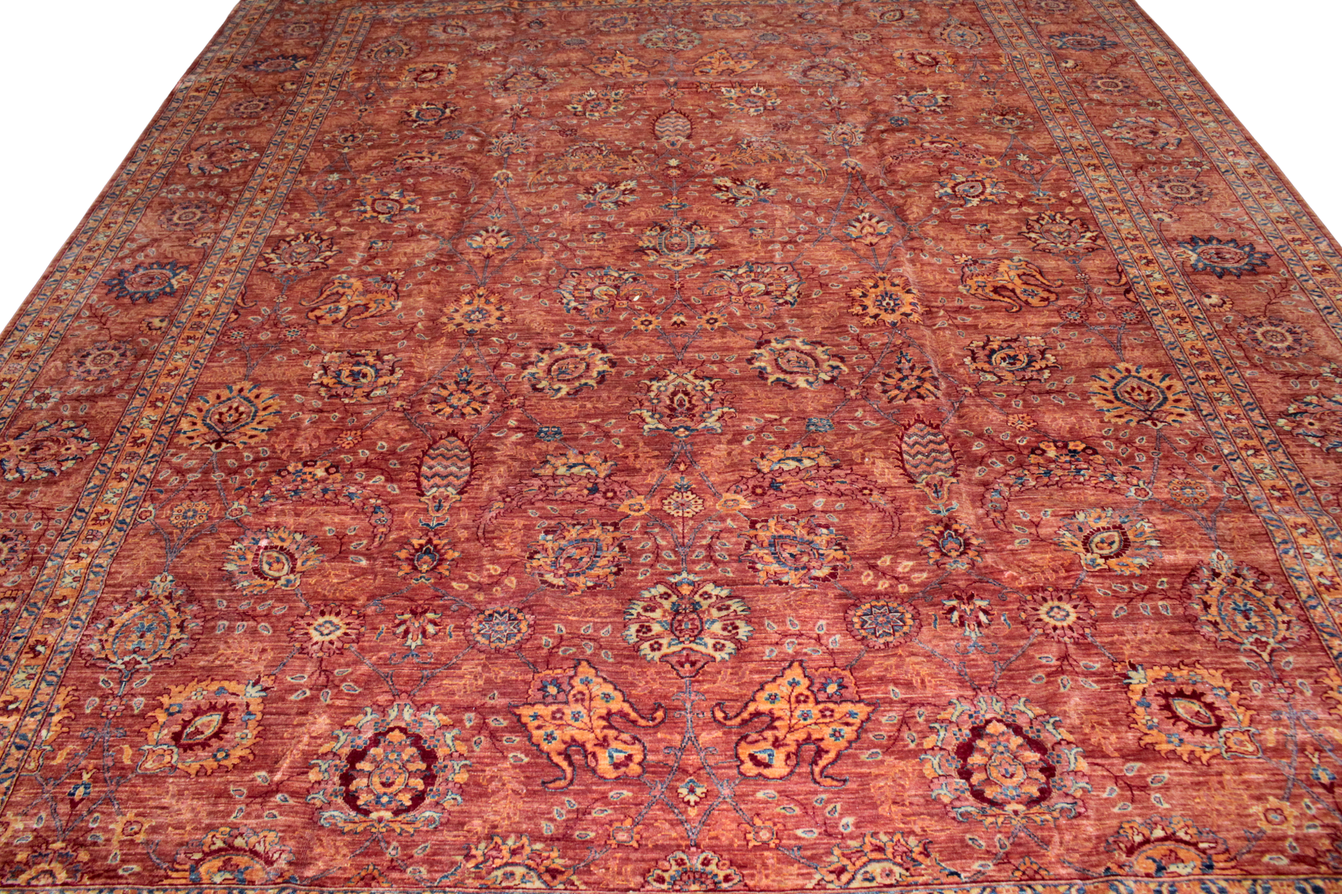 Glowing with the warmth of a sun-soaked horizon, this Ariana rug from Afghanistan (10.1 × 13.3 ft) captivates with its saturated terracotta field and symphony of floral medallions. The design reflects a masterful blend of Persian-inspired elegance and Afghan weaving heritage, rendered with extraordinary clarity and depth thanks to the rug’s fine hand-knotting.