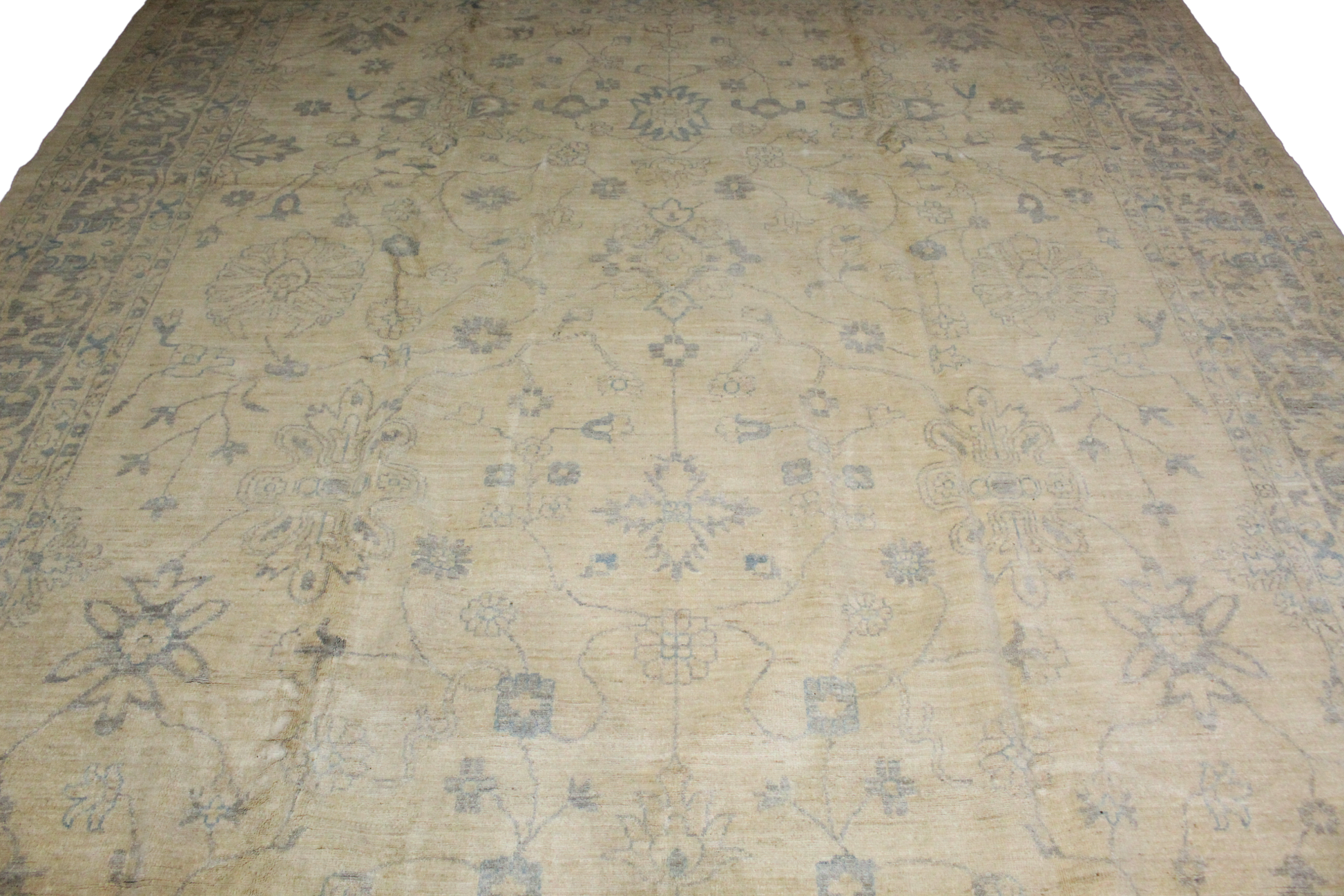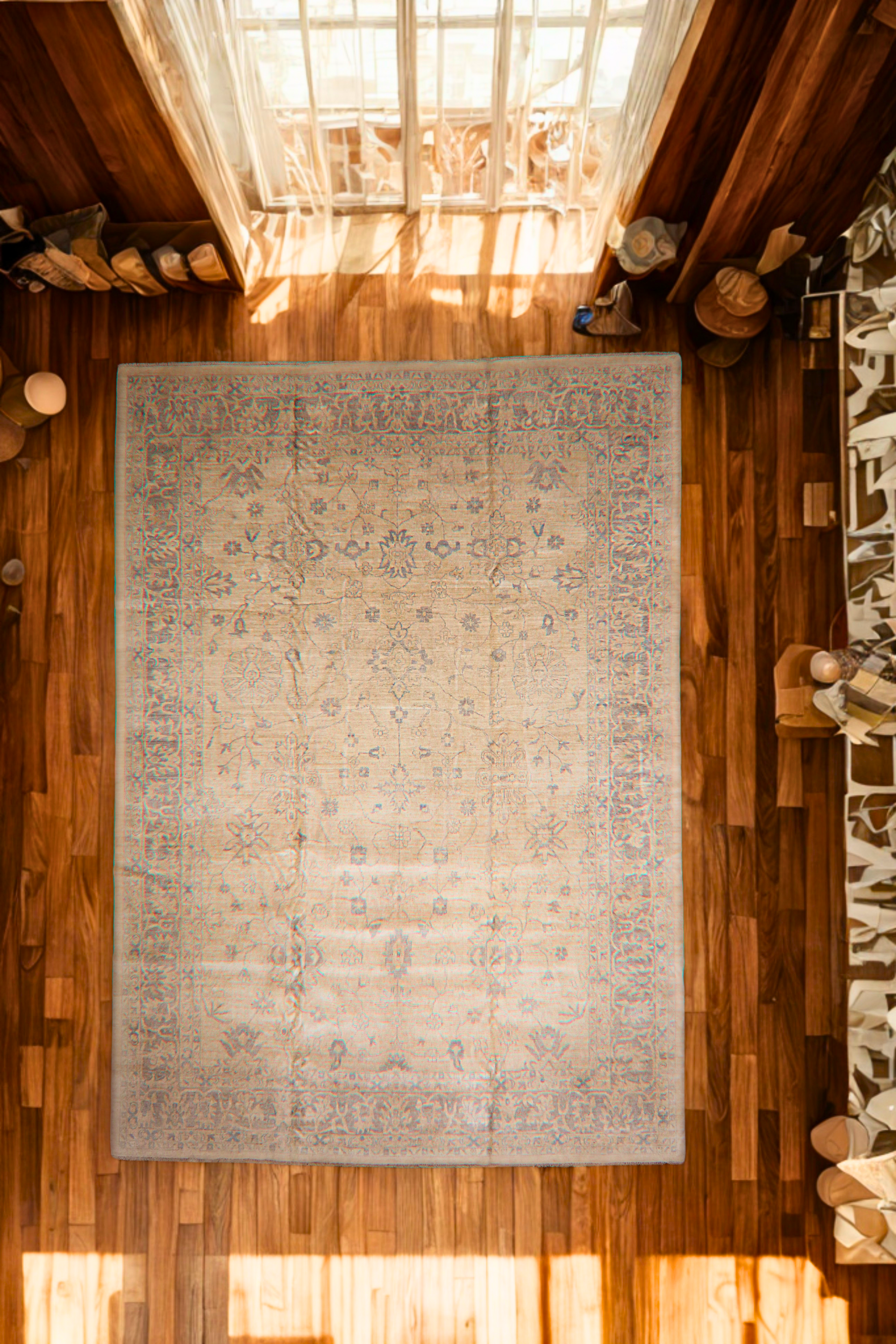 Subtle and serene, this large Oushak rug from Afghanistan (9.11 × 13.11 ft) radiates a quiet elegance. Its pale ivory-beige ground is delicately overlaid with a soft misty blue pattern of stylized florals, palmettes, and scrolling vines, framed by a gently contrasting border. The design flows with a sense of openness and calm, typical of classic Oushak aesthetics.