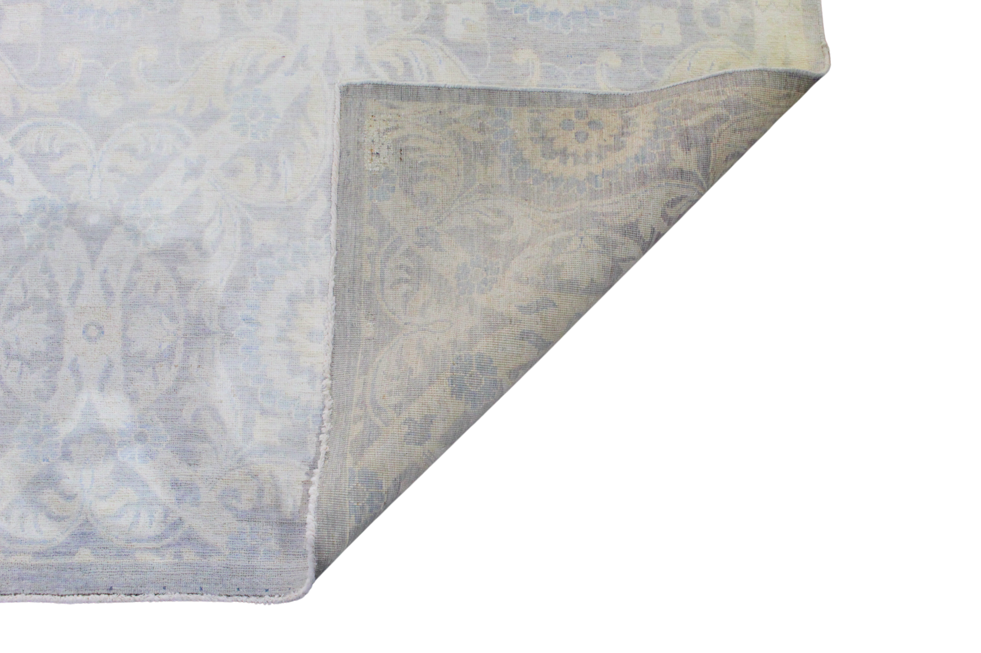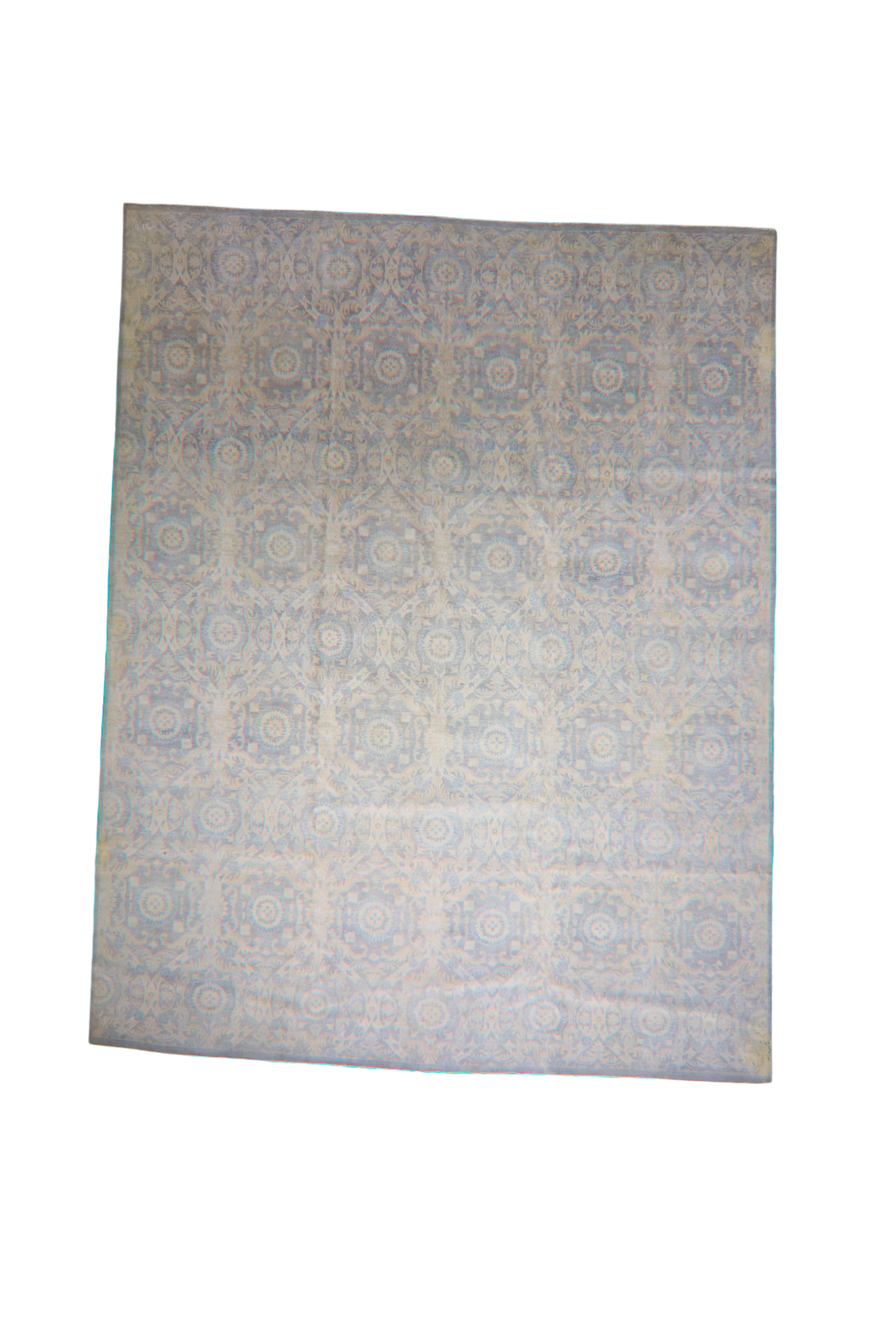 A vision in soft serenity, this finely hand-knotted Ariana rug (11.2 × 14.3 ft) from Afghanistan captures the elegance of traditional design through an ethereal lens. Its allover pattern features delicate floral medallions and leafy trellis work, arranged in a refined grid across a pale, powdery blue and ivory field. The motif recalls classical Persian gardens, reimagined in a contemporary, whisper-light palette that reads almost like a watercolor wash.