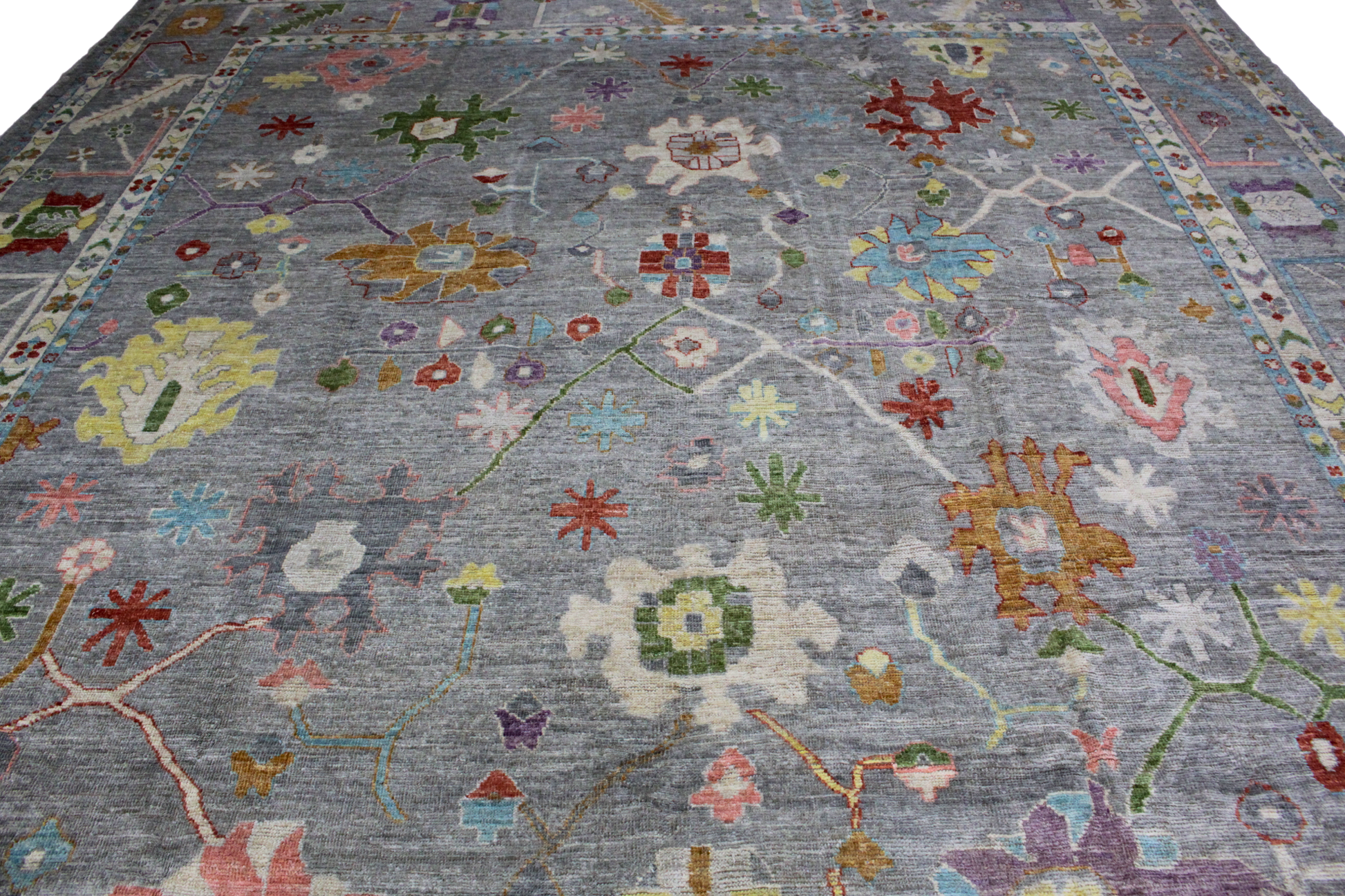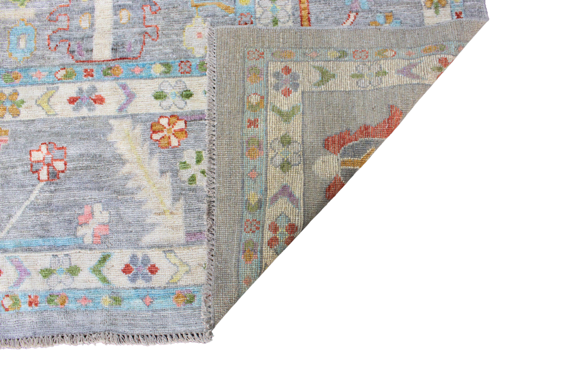 A celebration of color and cultural storytelling, this oversized Oushak rug from Afghanistan (12.1 × 14.3 ft) is alive with folkloric charm. Against a smoky blue-grey backdrop, the field bursts with whimsical botanical forms, tribal symbols, and stylized motifs in an energetic palette of coral, emerald, lilac, marigold, teal, and ivory. The border continues this theme, encasing the central field in a frame of geometric and pictorial elements that feel both playful and deeply rooted.