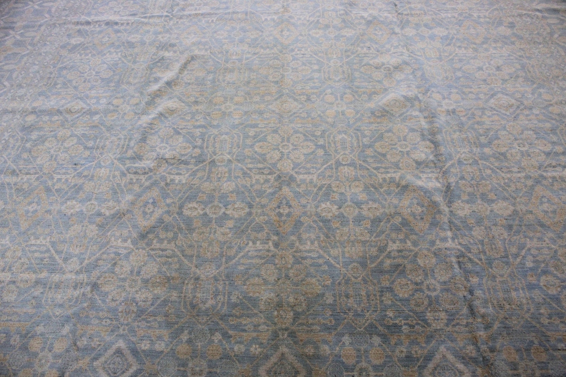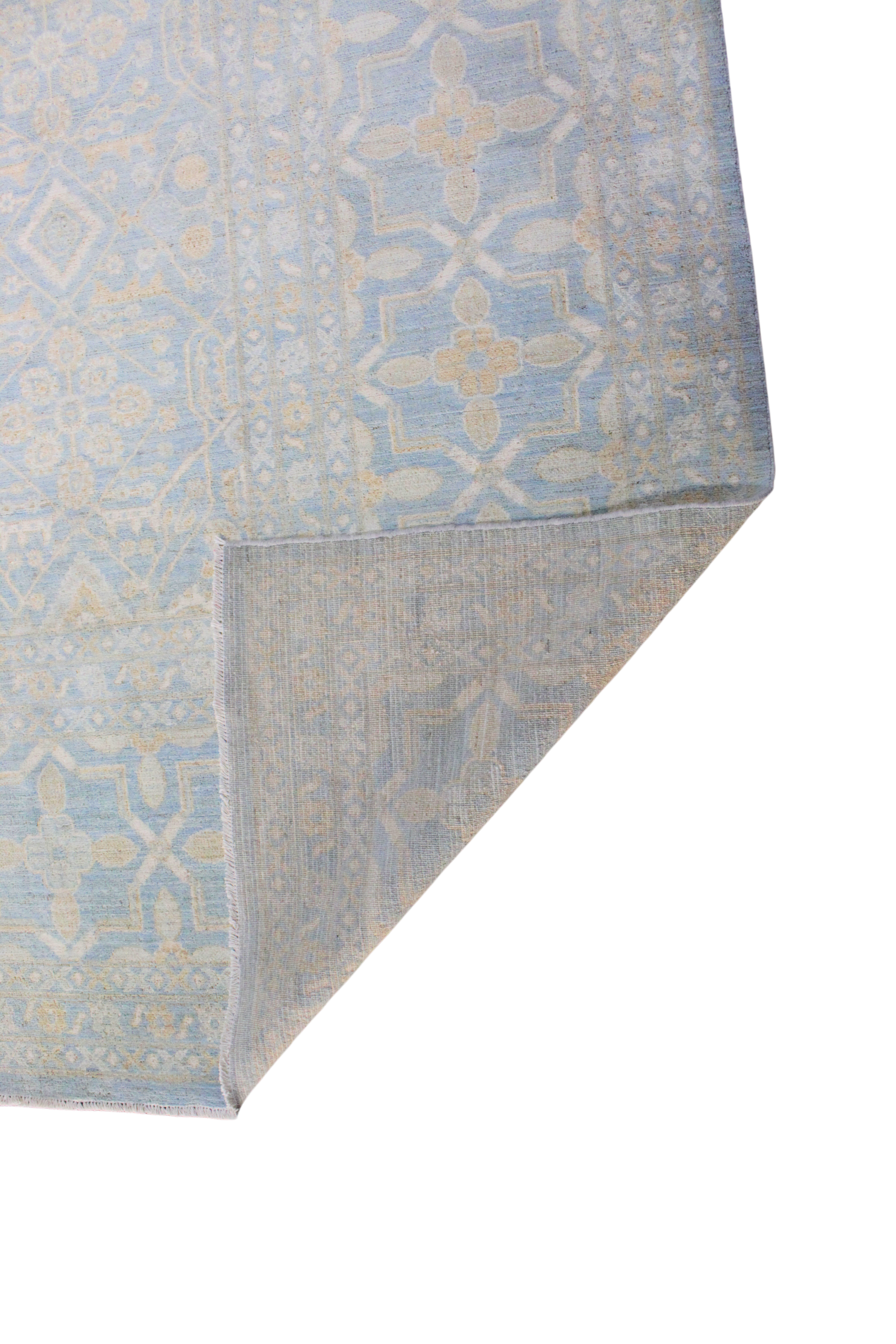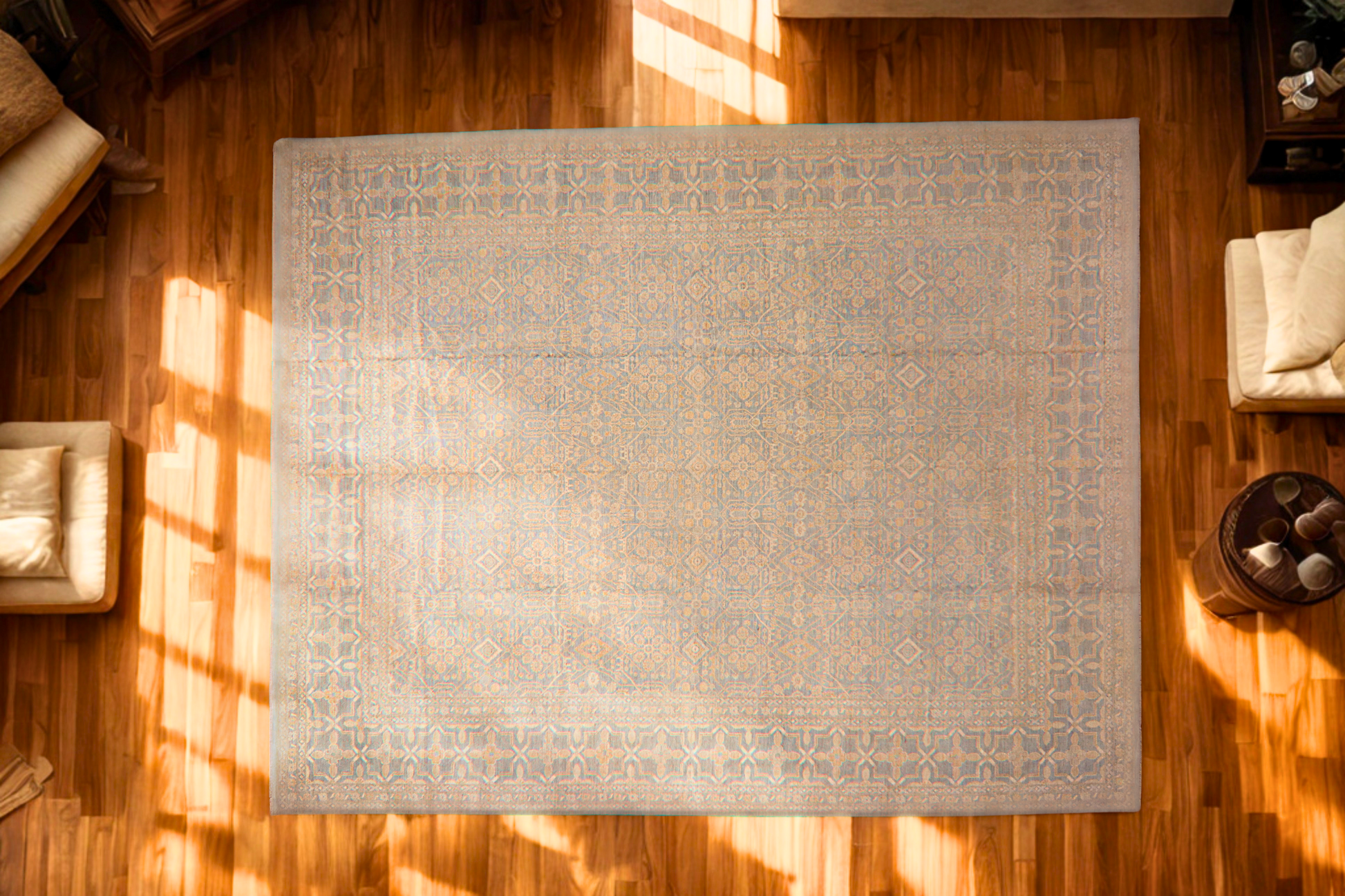 Understated luxury meets intricate symmetry in this stunning Ariana rug from Afghanistan (11.6 × 14.5 ft). Featuring a luminous, faded palette of soft sky blue and ivory, the rug’s geometric latticework and floral rosettes unfold in mesmerizing balance across its expansive field. The delicate layering and detailed borders evoke ancient Persian elegance, updated with a fresh, airy tone.