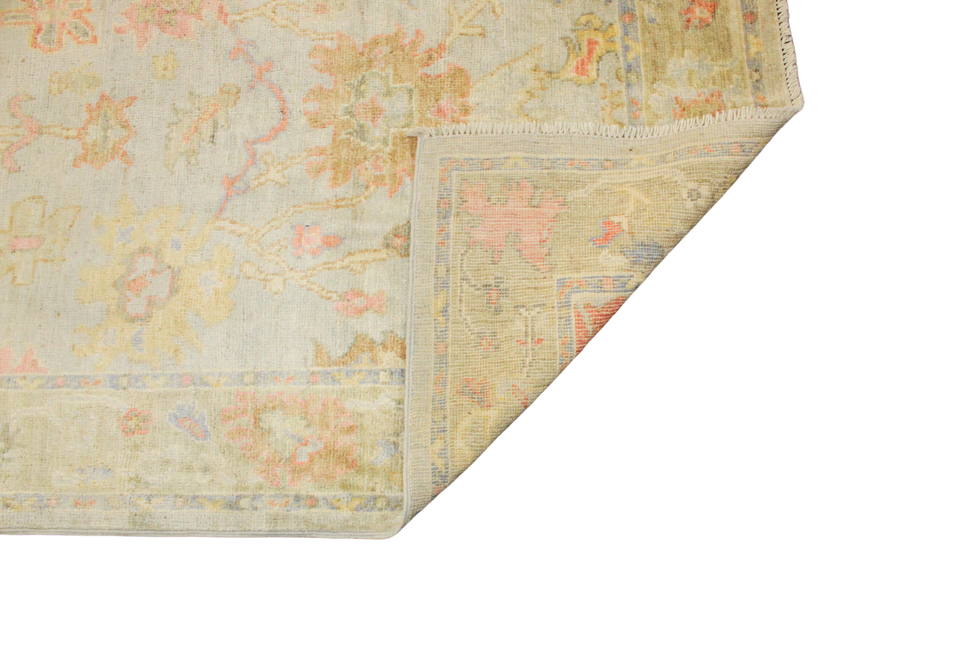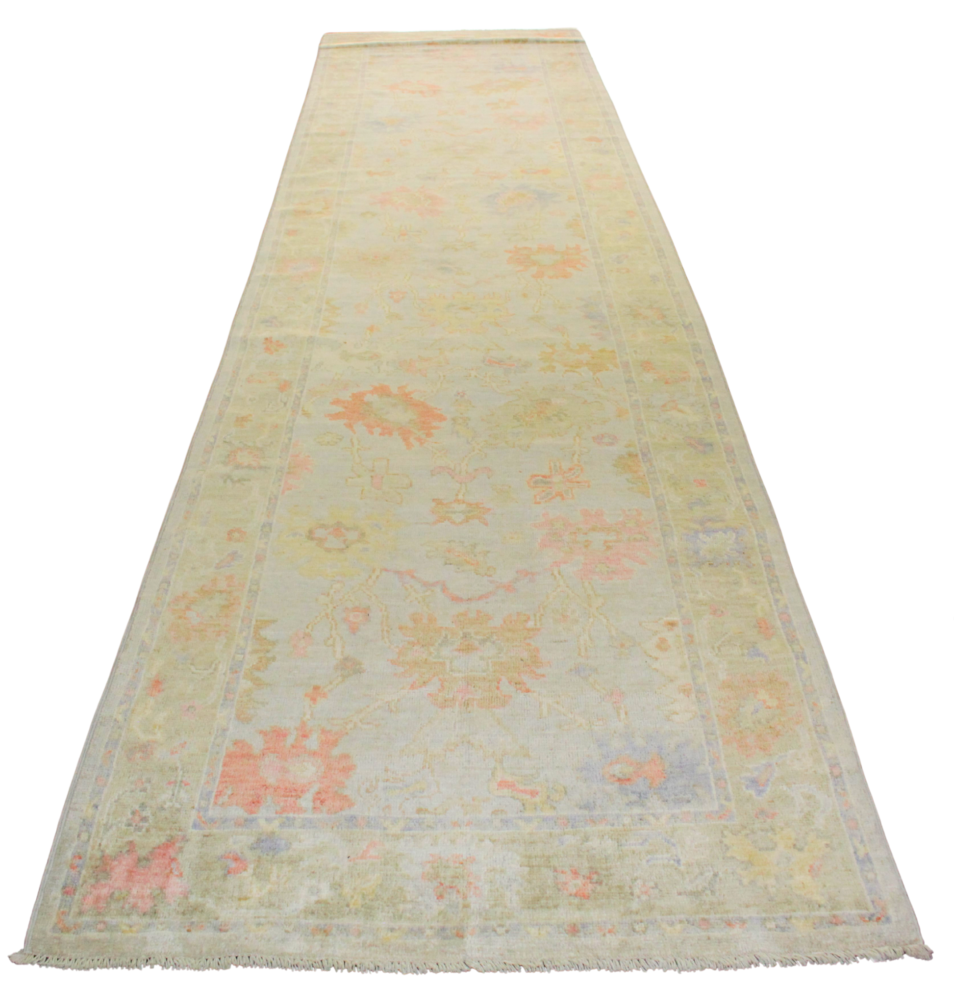 Blending delicate structure with expressive color, this 3.10x15.11 ft hand-knotted Oushak runner from Afghanistan is a long-format masterpiece. Its serene backdrop of pale silver-blue is enlivened with painterly motifs in rose, butter yellow, lavender, and dusk blue — all softened by a gently faded finish. The floral border hugs the composition in harmony, creating a corridor of timeless charm that feels as if it’s been lightly brushed with watercolors.