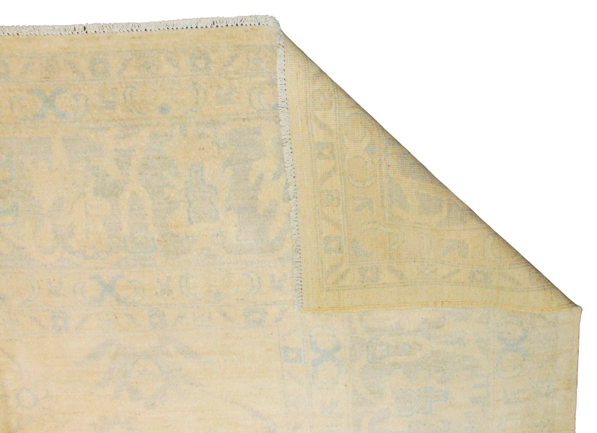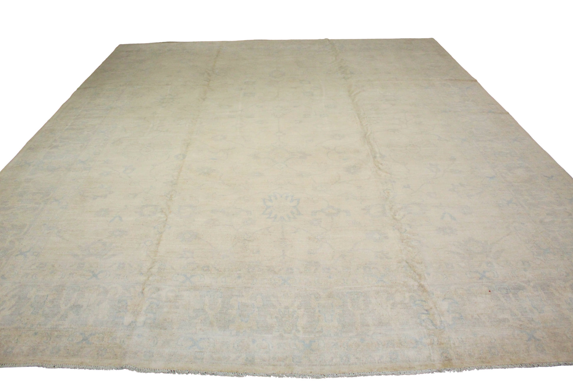 A study in restraint and sophistication, this Afghan Oushak rug whispers luxury through its hushed palette of ivory and pale sky blue. The classic Oushak floral medallions and vinery unfurl with a gentle grace, subtly revealed through the natural sheen of the wool and a finely balanced, low-contrast composition.