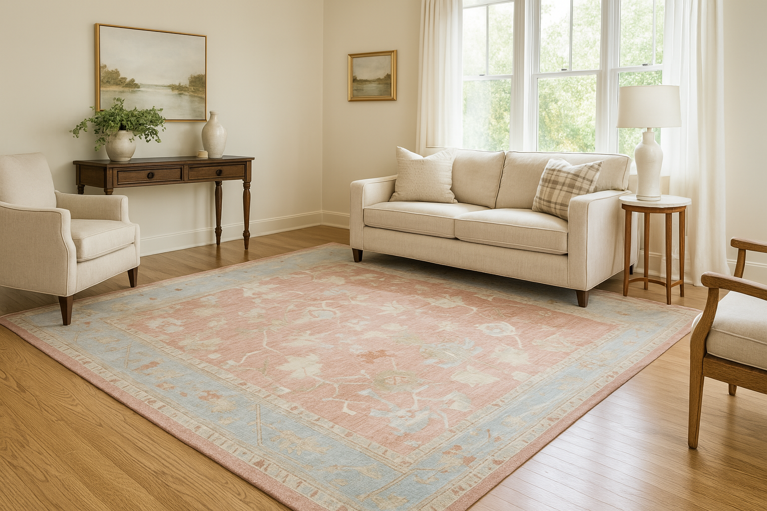 True to the Oushak weaving lineage, the pattern remains spacious and breathing, allowing each element to shine independently while contributing to a harmonious whole. The combination of playful formality and refined coloring makes this piece ideal for transitional interiors — from classic to coastal contemporary.