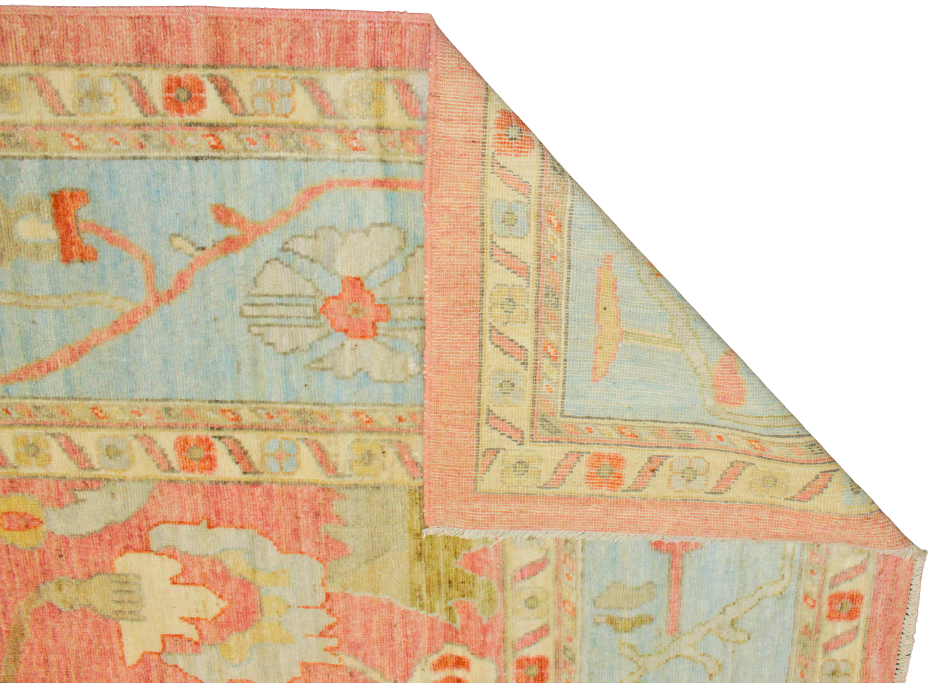 A radiant expression of Oushak tradition, this large Afghan rug is a tapestry of serenity and warmth. Its glowing coral field is infused with soft abrash, evoking the shifting tones of a summer sunset, while the powdery blue border cools the composition with ethereal grace. The large-scale botanical motifs and decorative palmettes are rendered in ivory, gold, and muted green, giving the piece a poetic elegance.