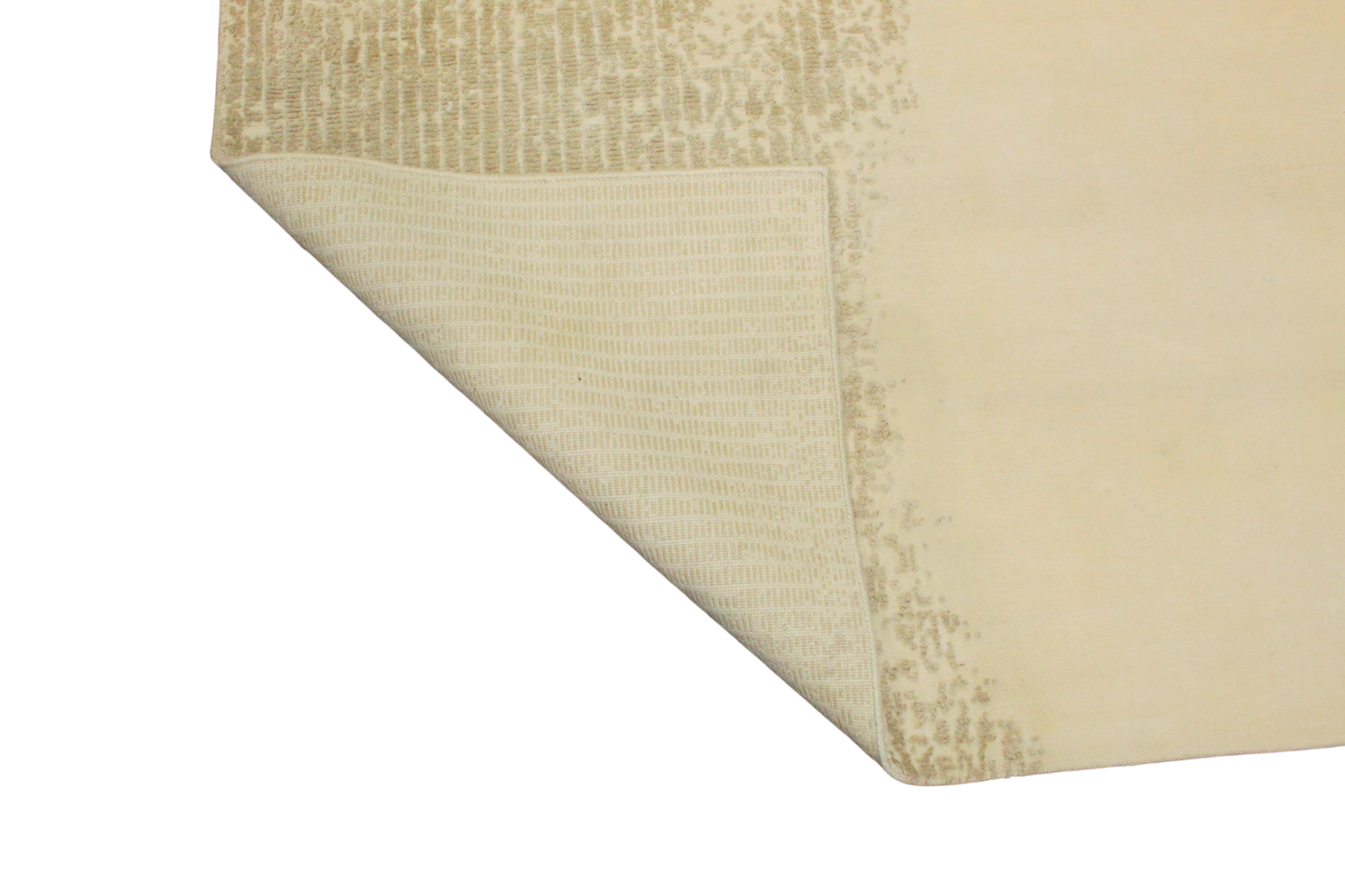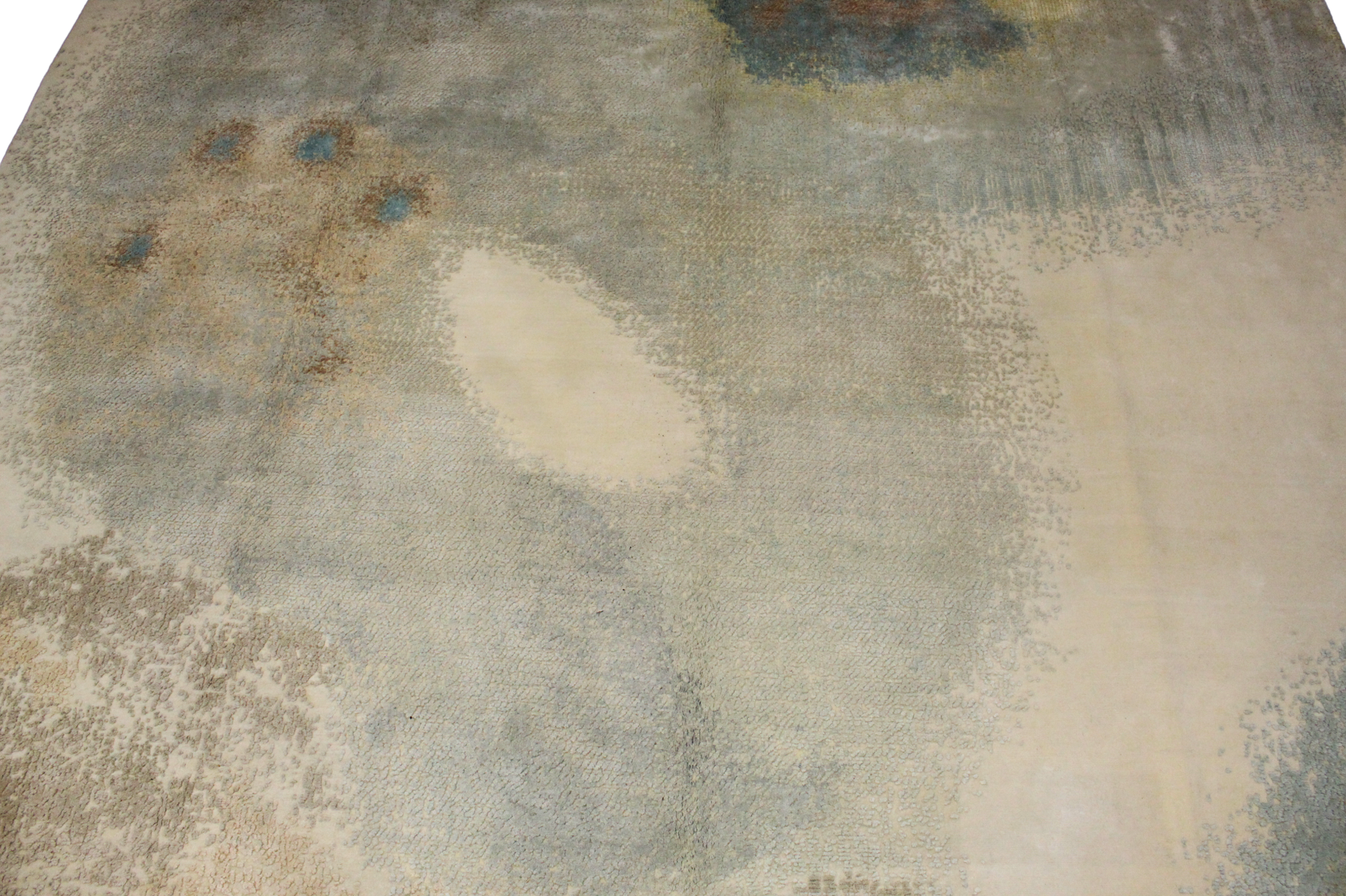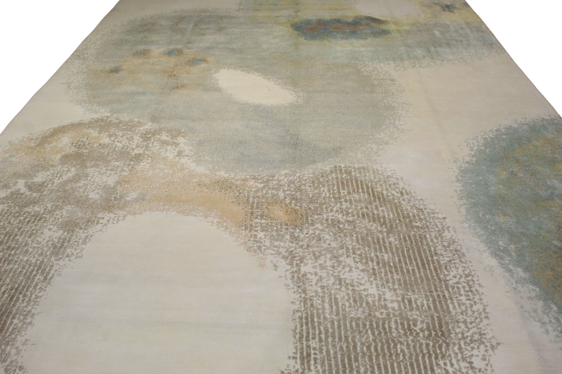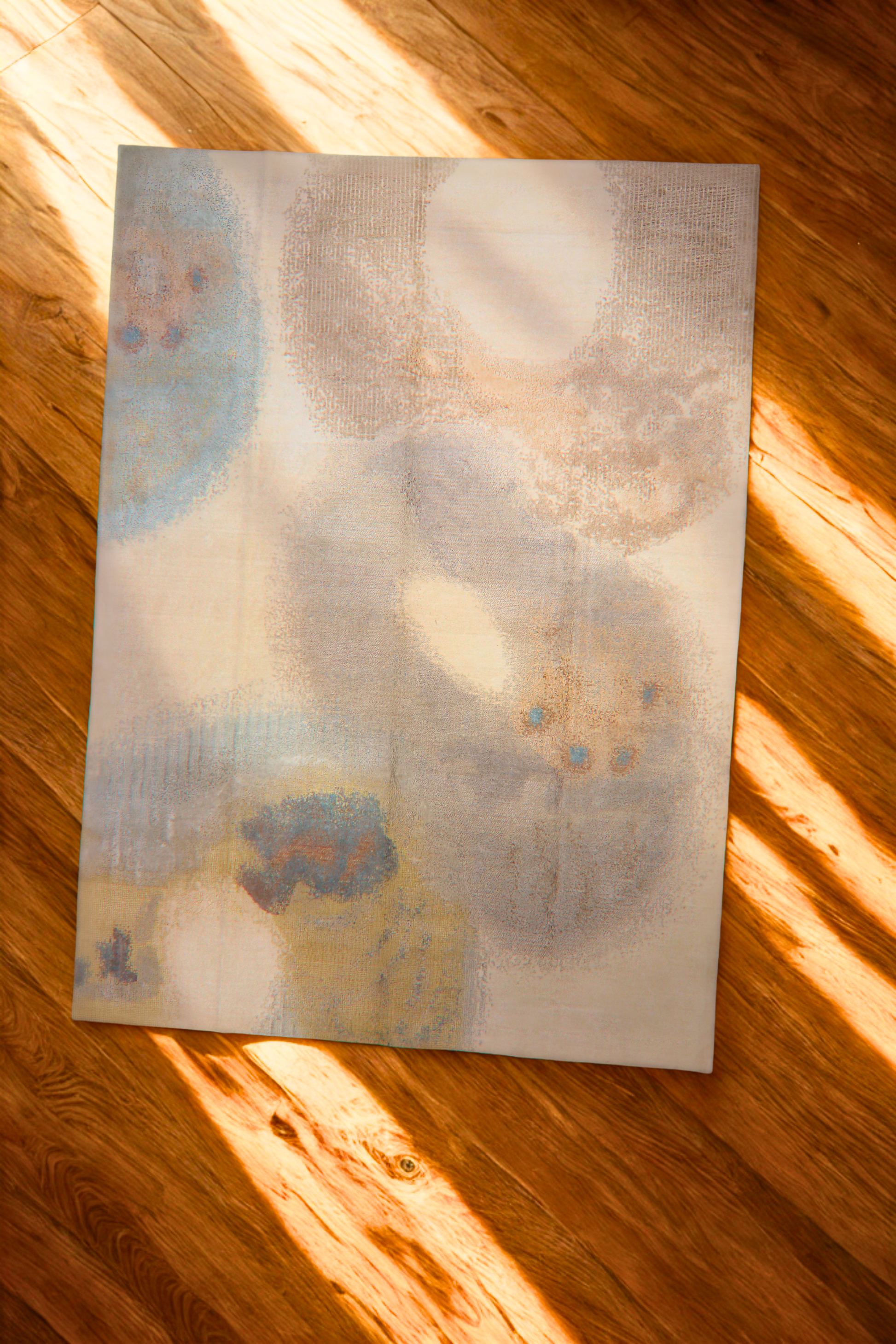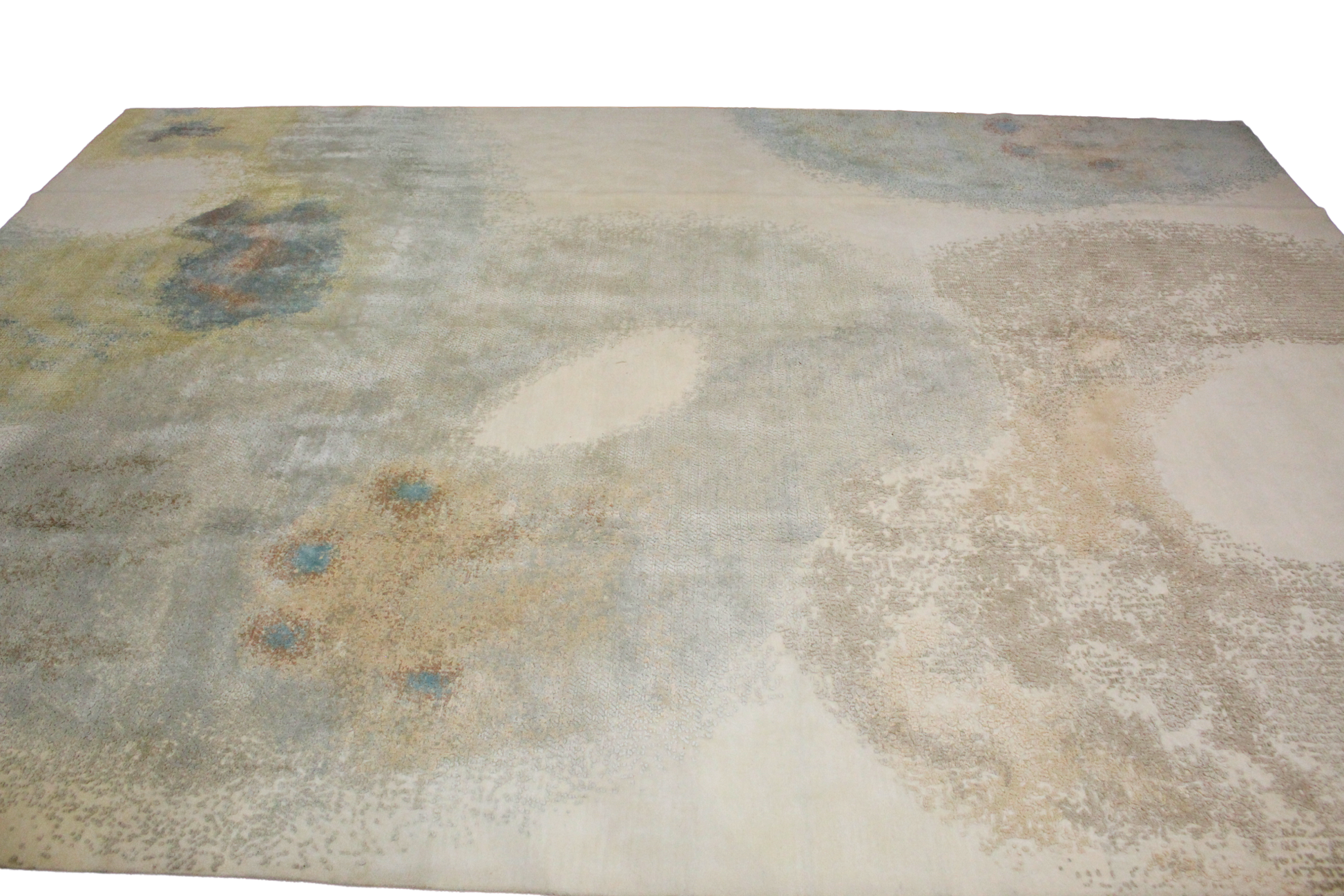Ethereal and fluid, this 10.2 × 14 ft modern rug from Nepal invites a sense of calm through its abstract design of misty forms and diffused edges. The composition appears almost like watercolor on fabric — translucent spheres and cloudy shapes in washed-out tones of ivory, pale taupe, faded teal, soft blue, and hints of muted citrine.