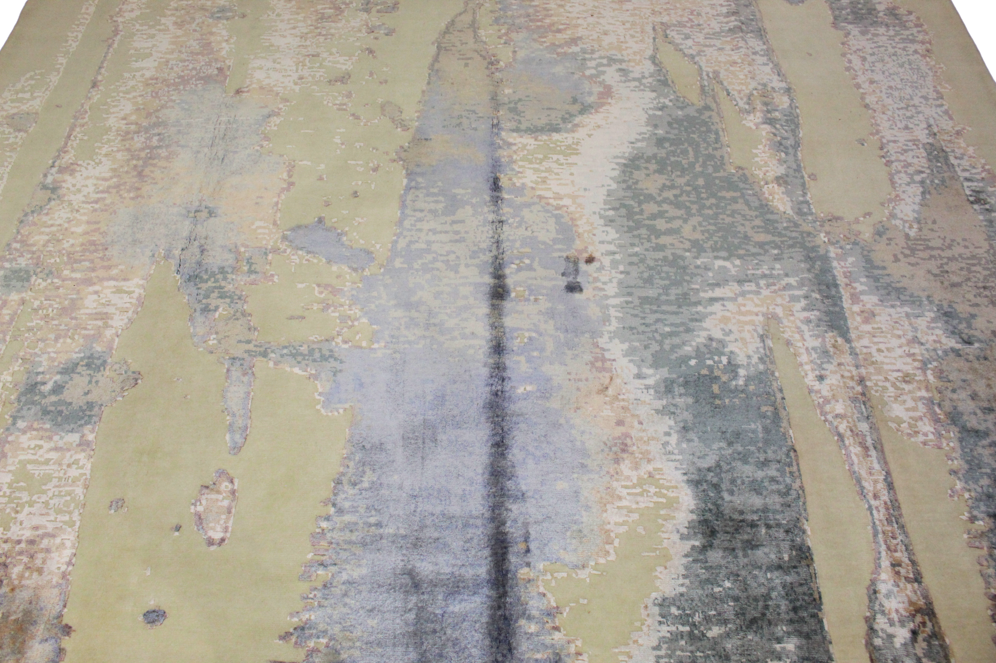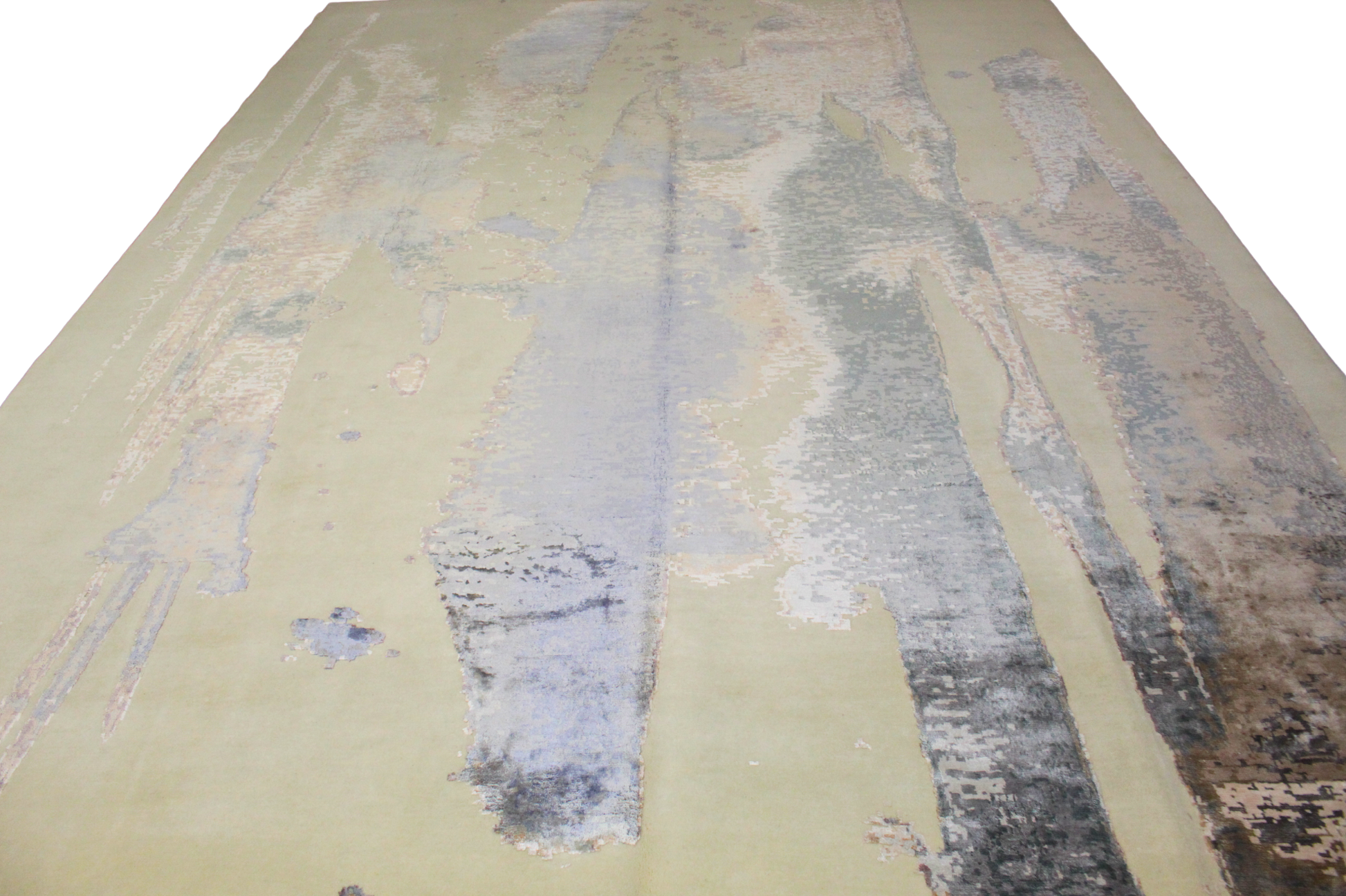 Infused with artistic spontaneity, this modern Nepalese rug (10 × 14.3 ft) presents a bold, vertical abstract composition reminiscent of ink stains, cascading brushwork, or streaked reflections in water. The palette of slate gray, smoky lavender, taupe, and soft cream plays out against a neutral ground, capturing a sense of dynamic, upward movement.