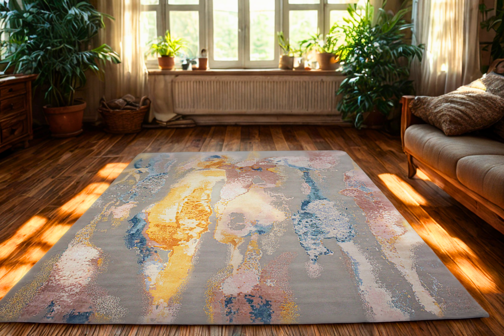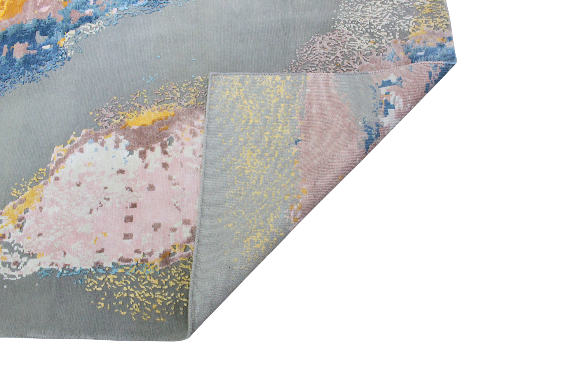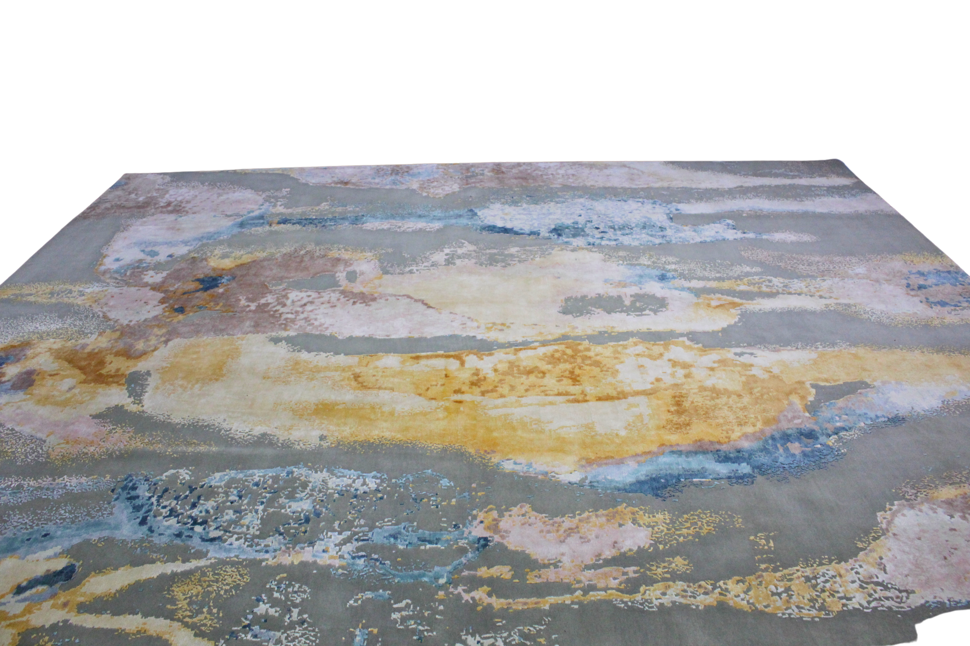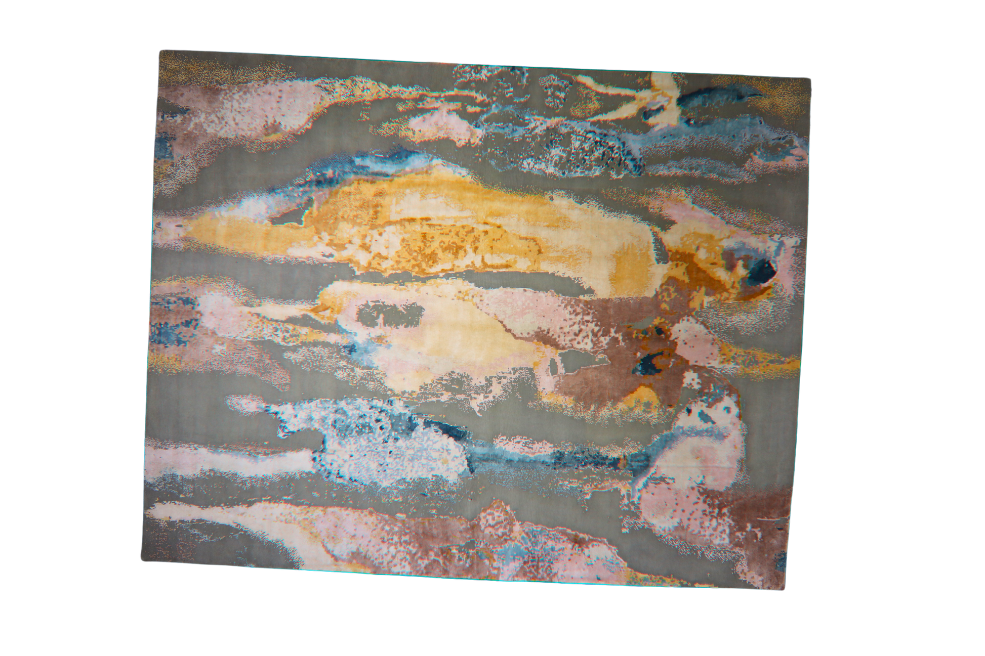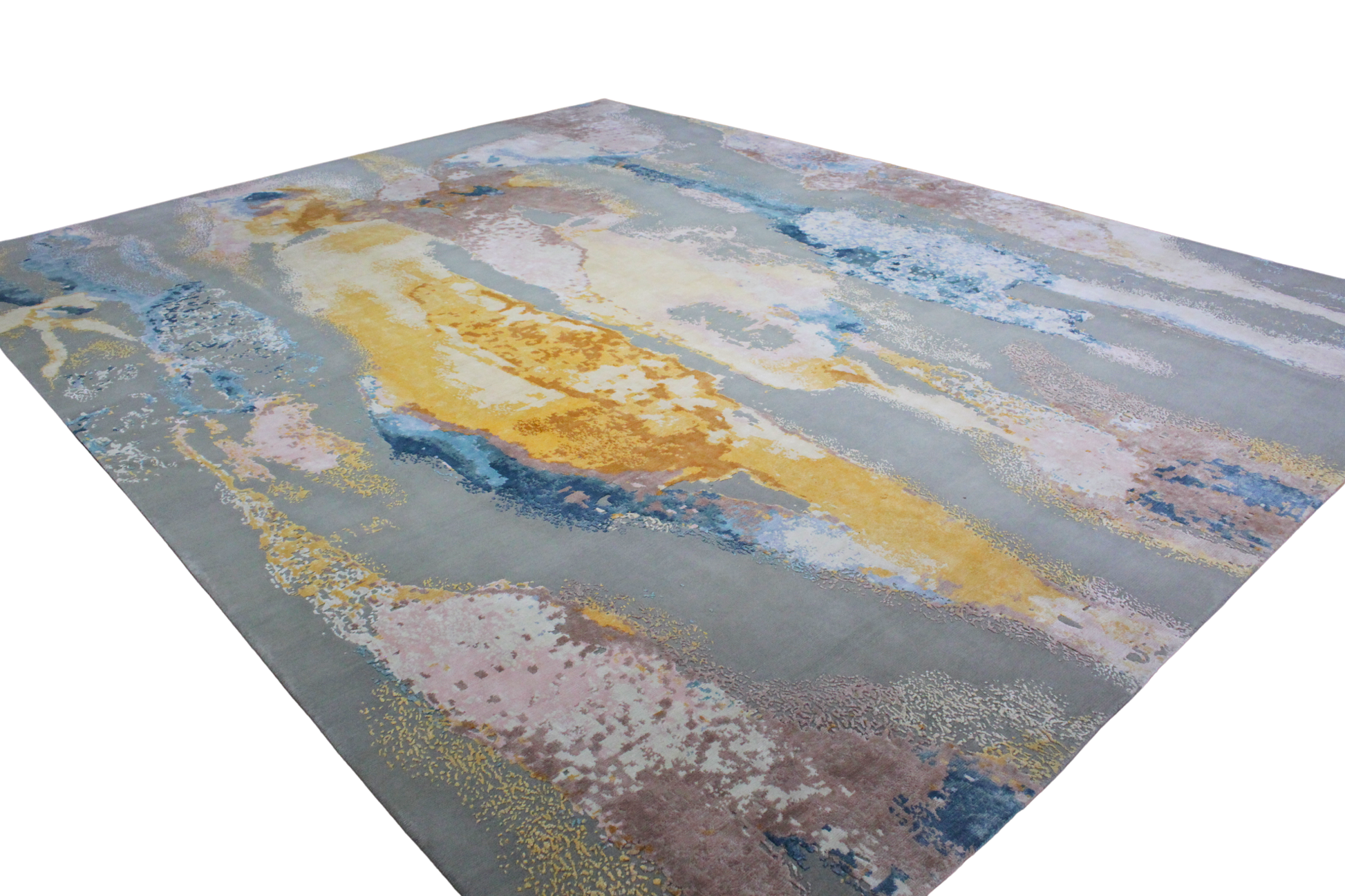 This showstopping modern Nepalese rug (12 × 15.4 ft) brings together bold abstract expression with painterly elegance. Rippling bands of molten gold, blush rose, dusty blue, and slate gray sweep across the surface like a sunset reflected in stormy water. The result is a luxurious piece that feels both grounded and dynamic.