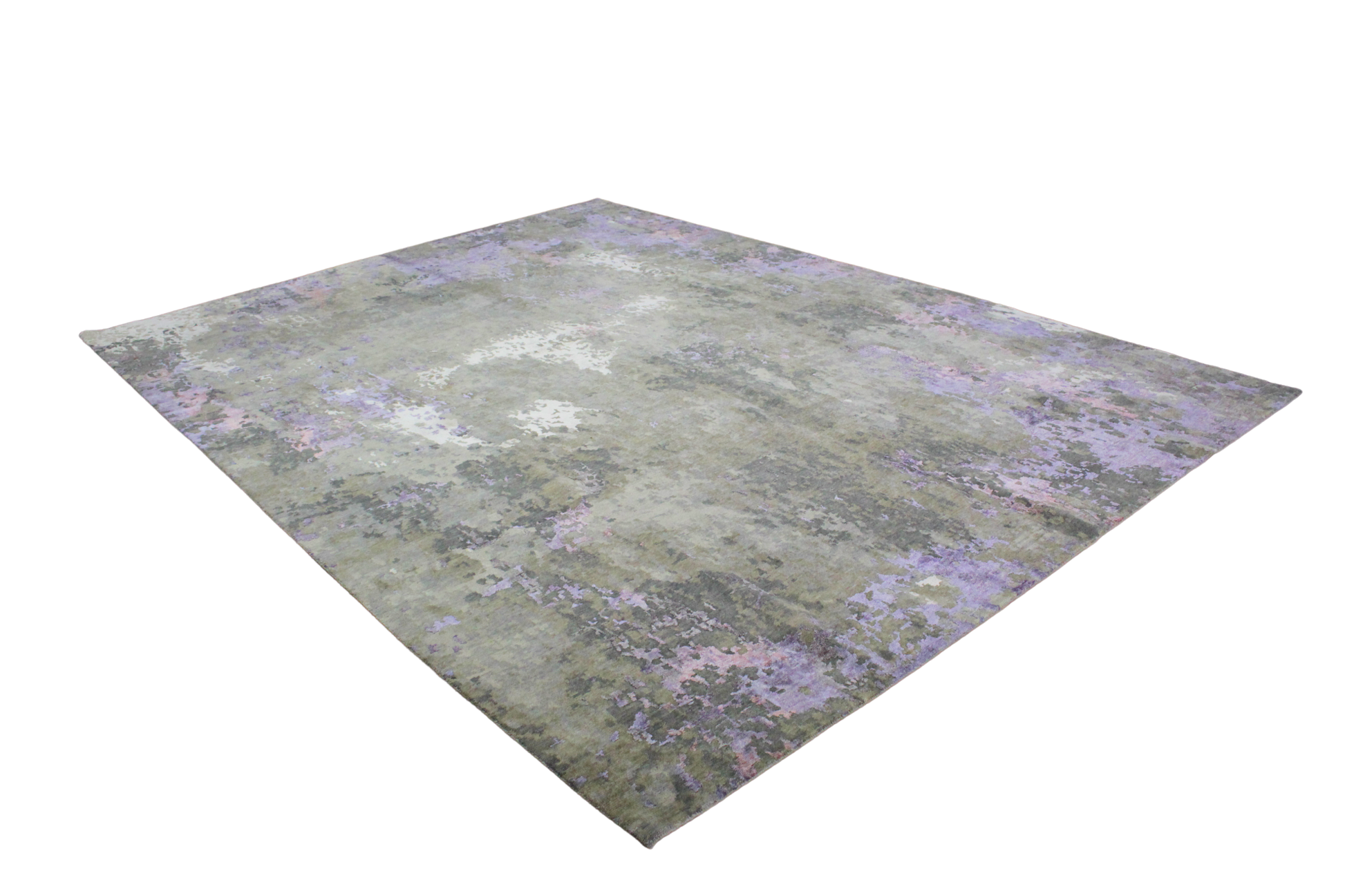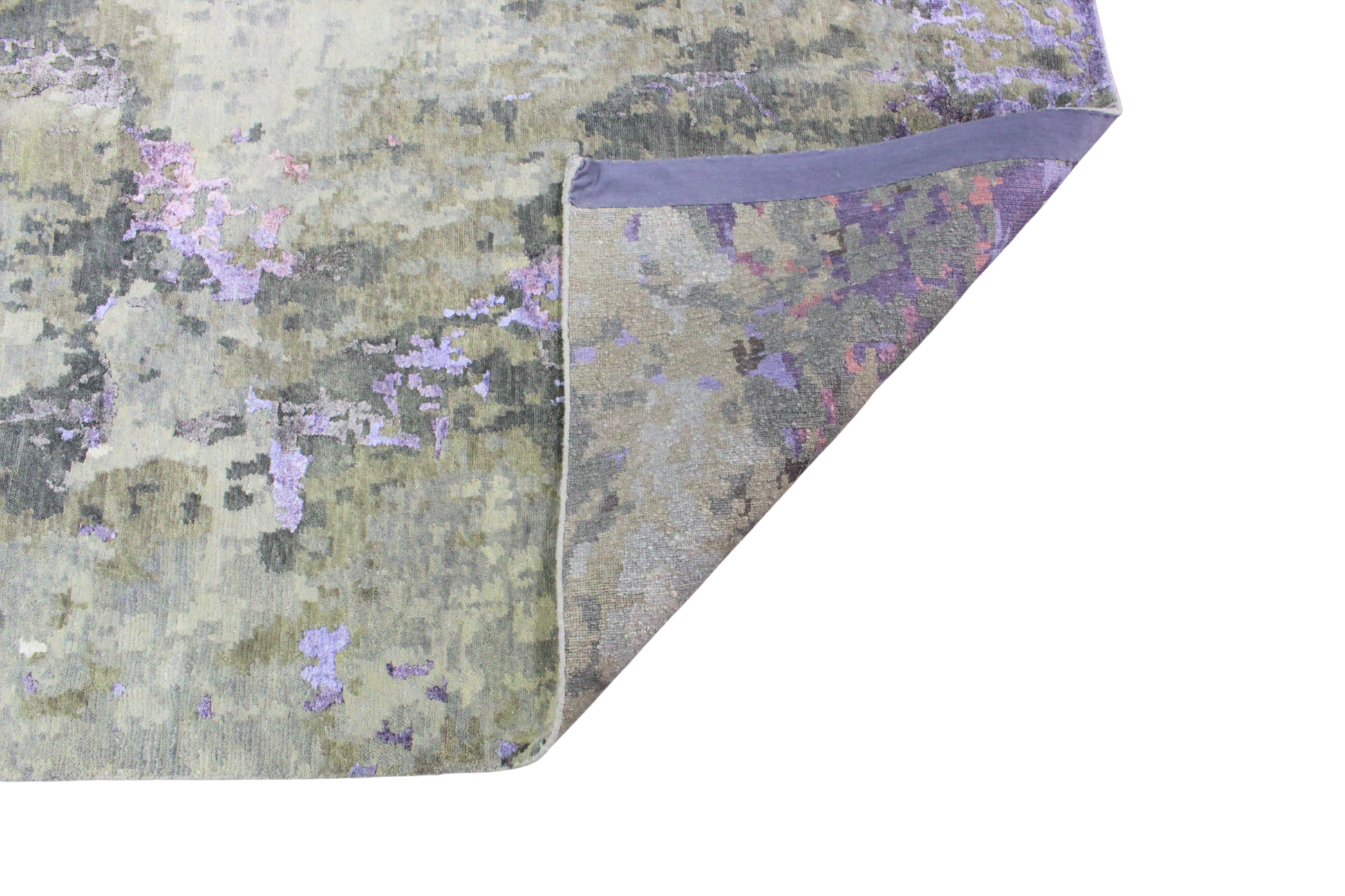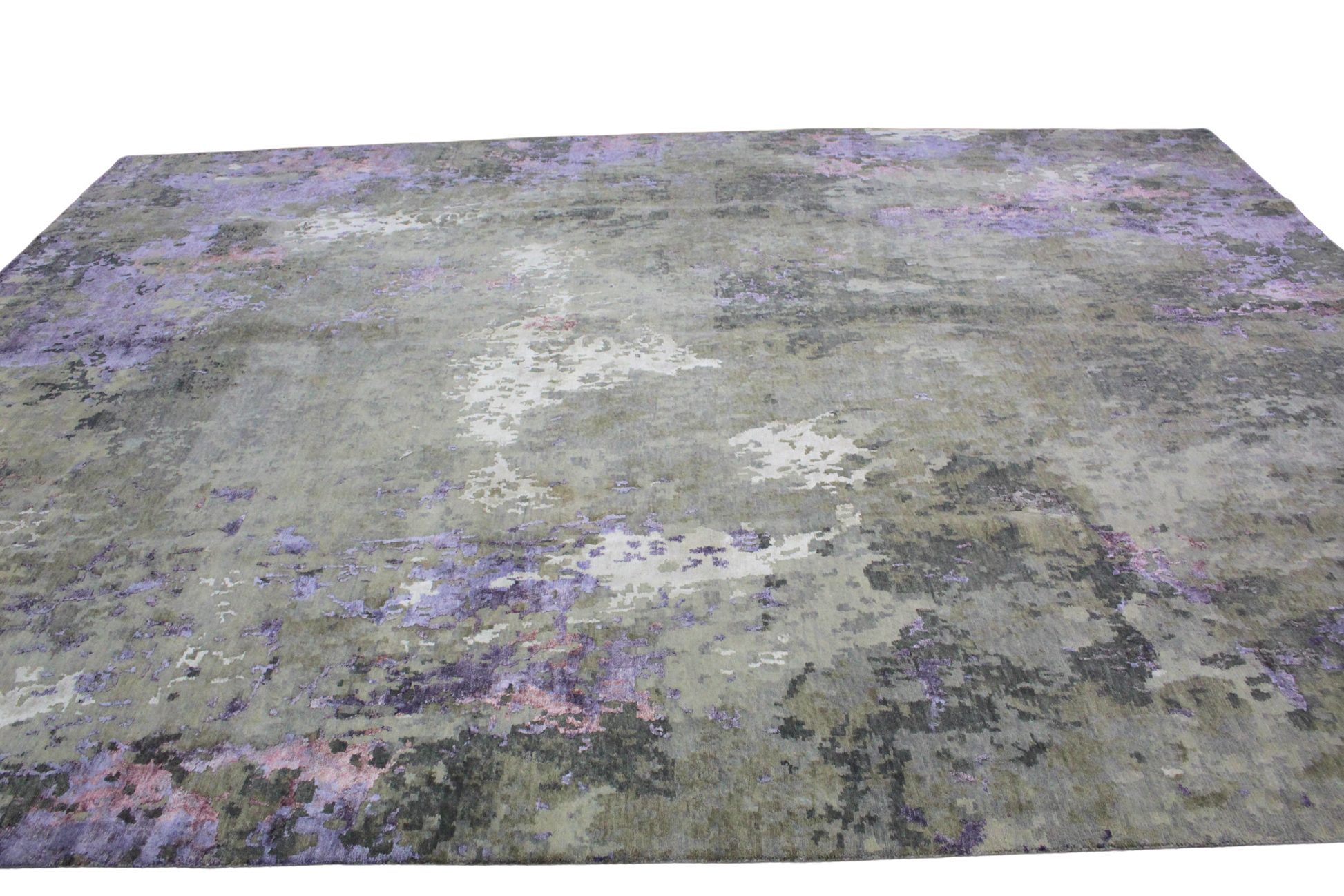A visual symphony of texture and tone, this large modern rug from Nepal (10.2 × 13.10 ft) feels like a misty landscape caught at twilight. Layers of olive green, lavender, ivory, and slate are masterfully blended into a diffused, abstract pattern, offering the impression of movement and organic transformation.