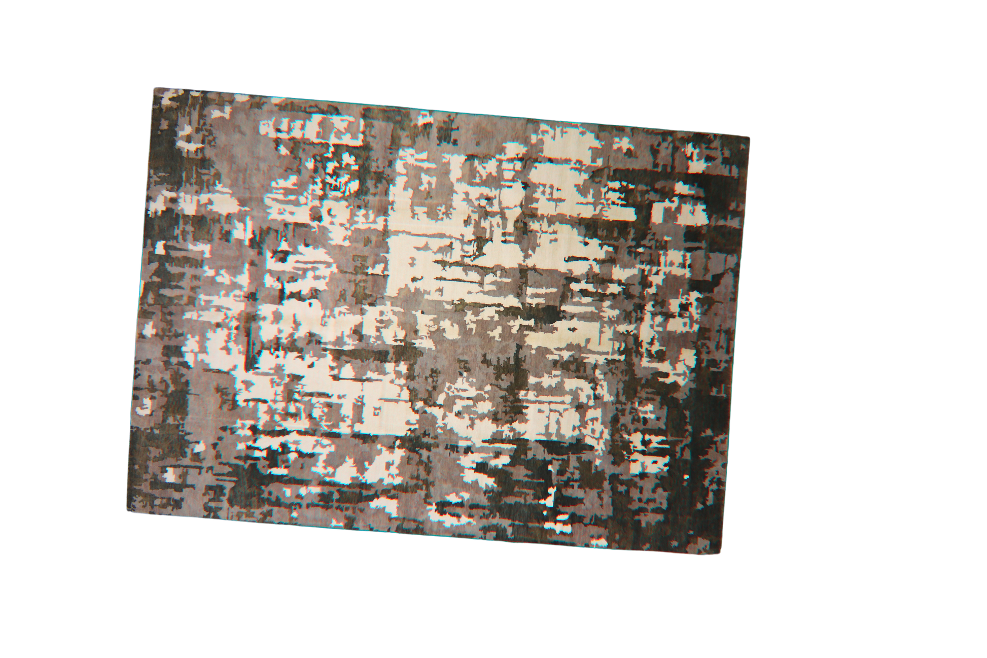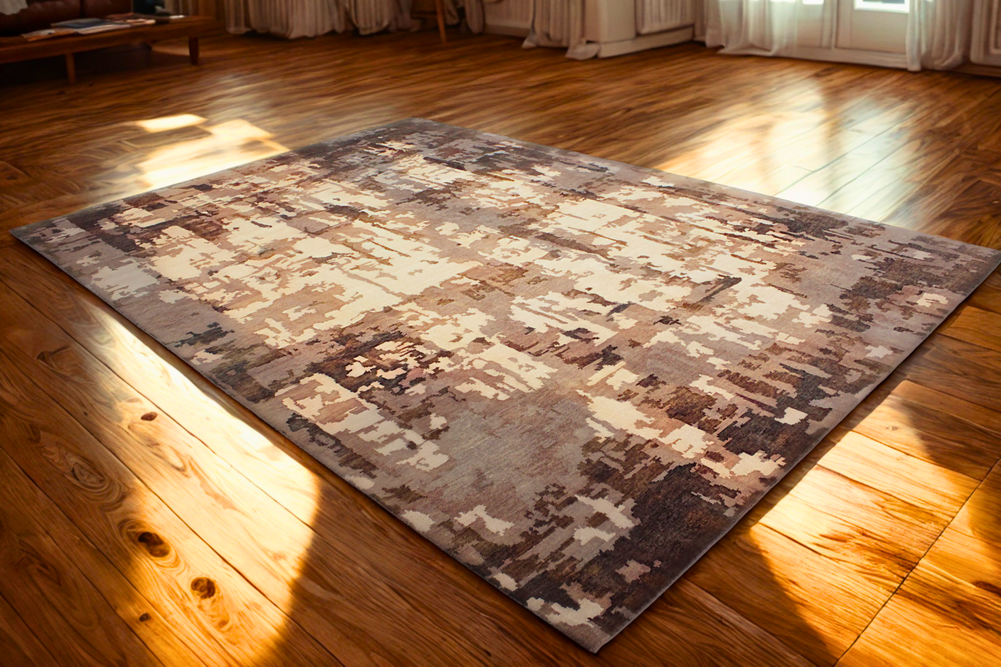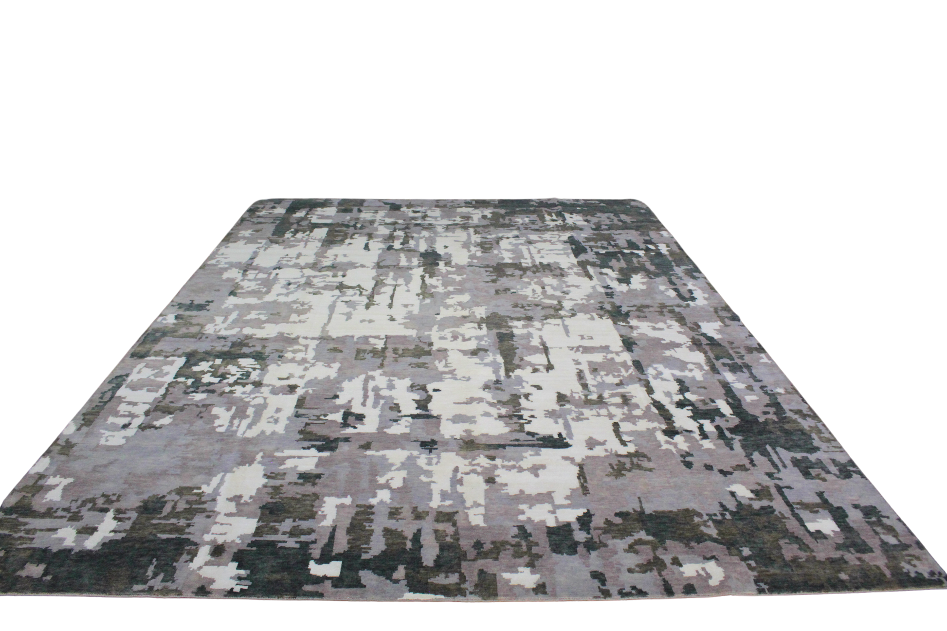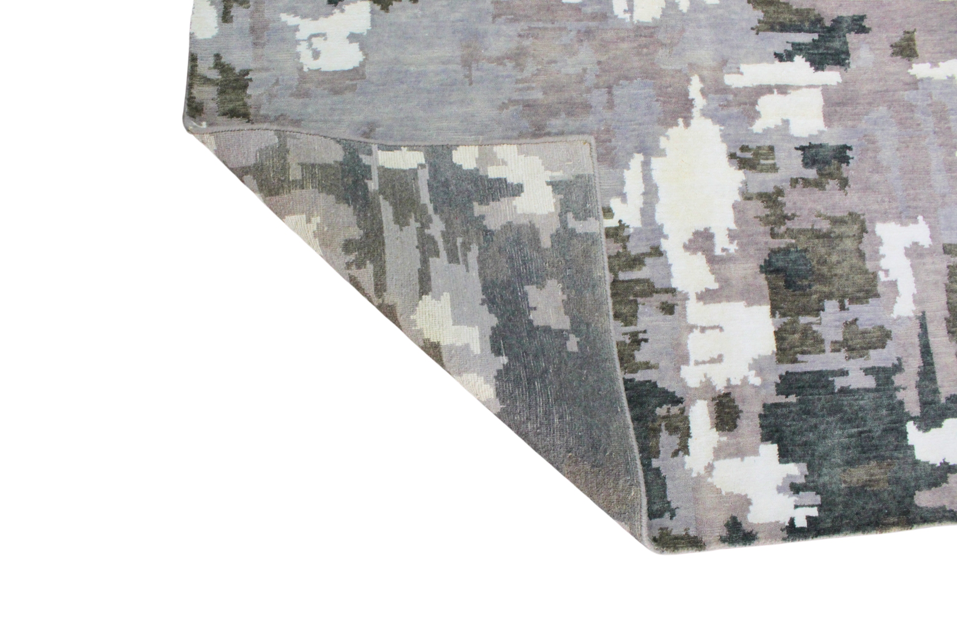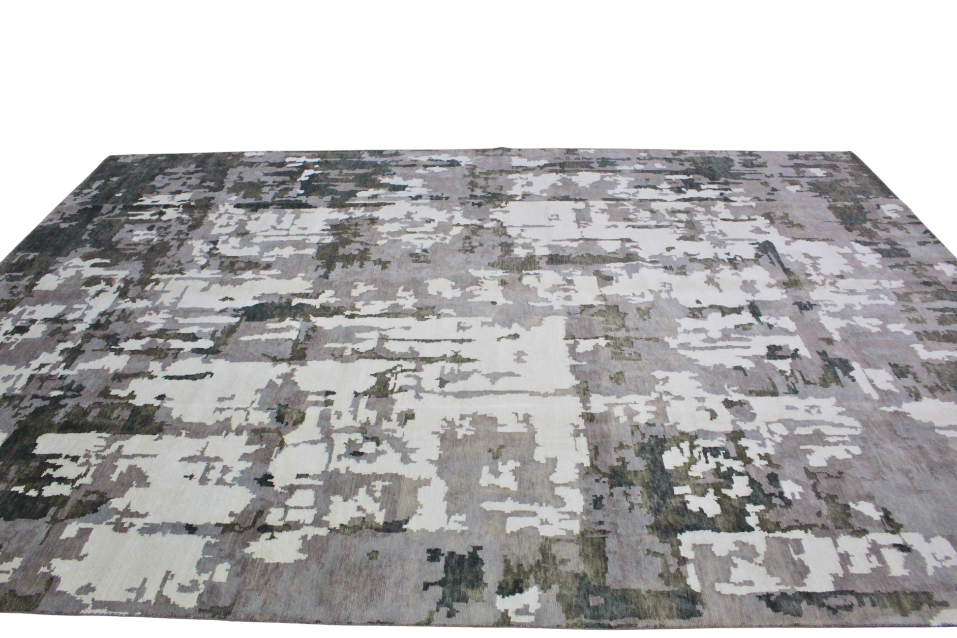 This modern Nepalese rug (9.11 × 13.11 ft) captures the rhythm of urban geometry through its abstract, pixel-inspired design. Crisp ivory and charcoal forms are layered against weathered shades of taupe and olive gray, evoking a digital-era camouflage with painterly edges. The high-low tonality and soft transitions lend movement and modern sophistication.