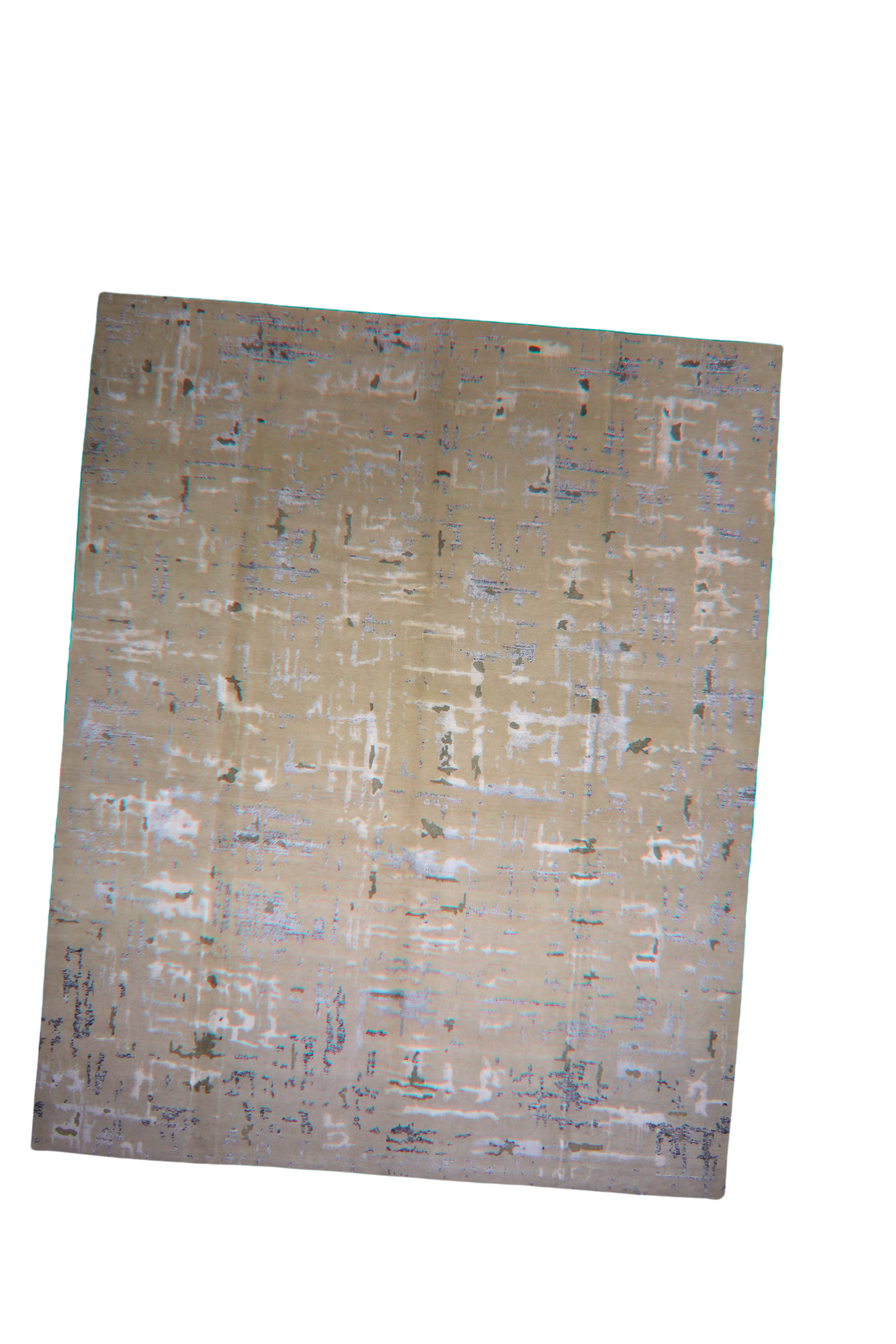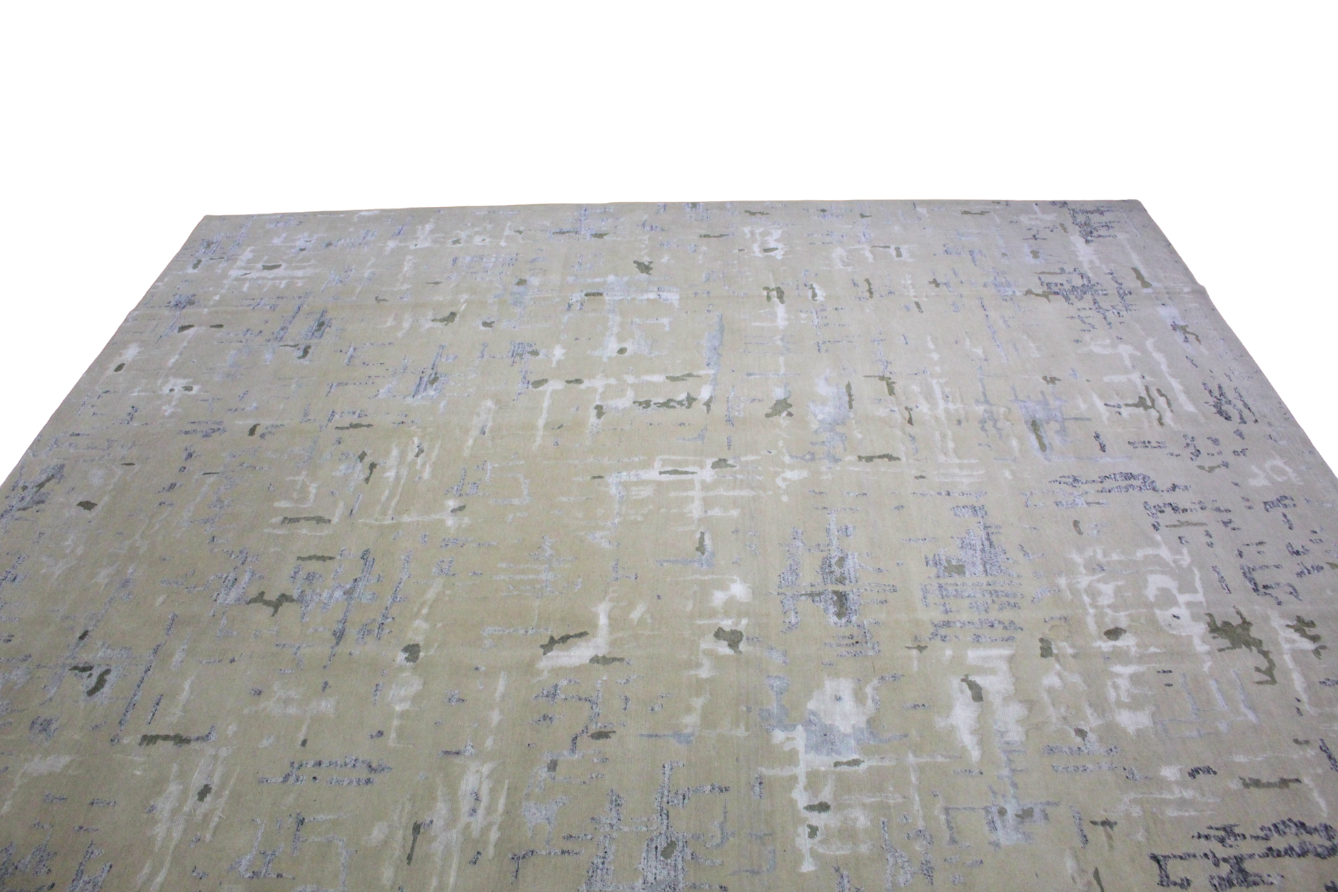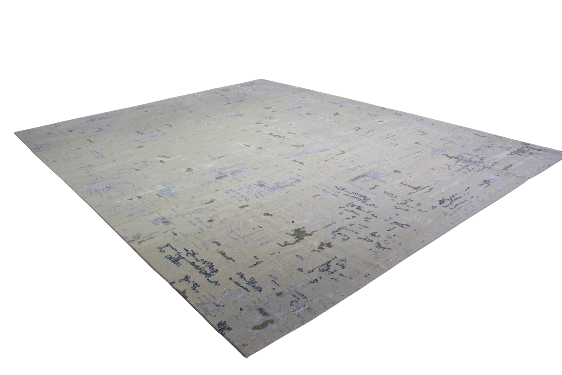 This expansive modern rug from Nepal (11.11 × 14.8 ft) brings a sense of calm structure to large interiors. Its subtly architectural design features layers of linear motifs and grid-like forms, delicately faded into a palette of warm sandstone, bone, and misty grey-blue. The distressed finish and nuanced tone-on-tone coloration lend it a quiet sophistication that feels both modern and timeless.