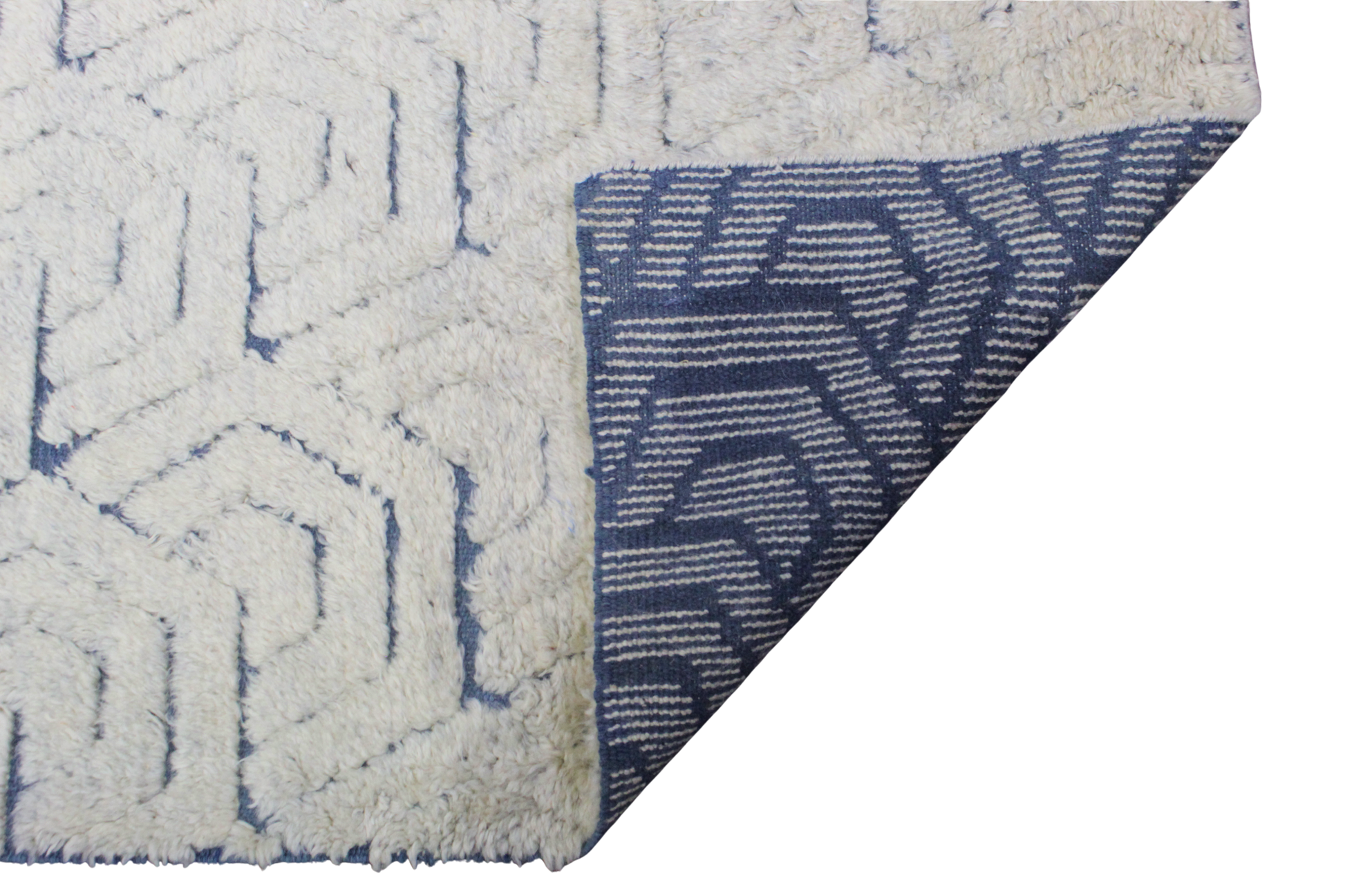 This Moroccan wool rug blends tribal authenticity with modern geometry. Woven in a soft ivory base, it features a hypnotic pattern of interconnected angles and chevrons — each hand-drawn motif echoing the visual rhythm of Berber symbolism while embracing a contemporary aesthetic.