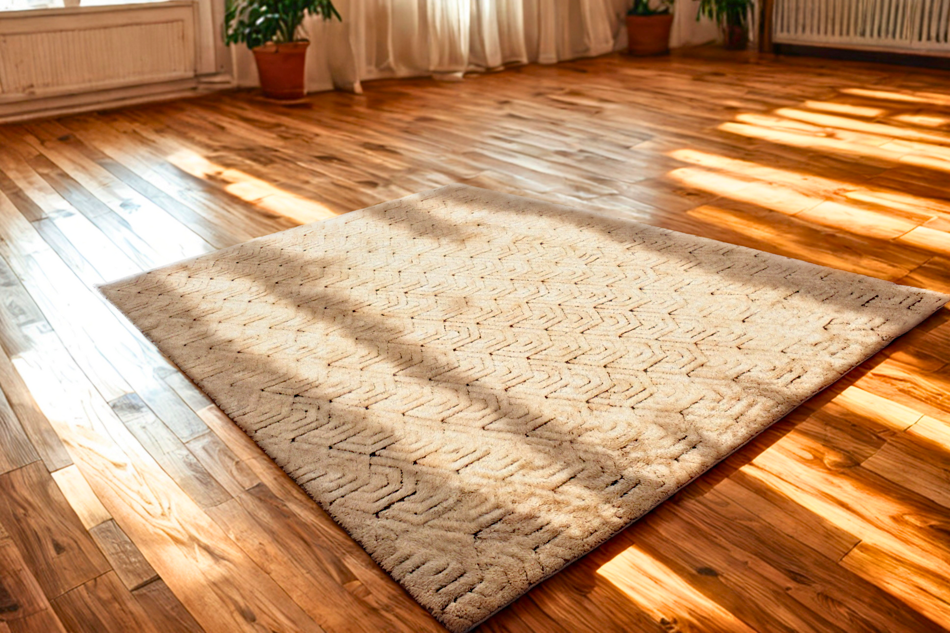 The crisp black lines pop subtly against the plush wool pile, creating movement and texture without overwhelming the space. This is the ideal rug for modern-minimalist, bohemian, or eclectic interiors looking for a tactile foundation with heritage roots.