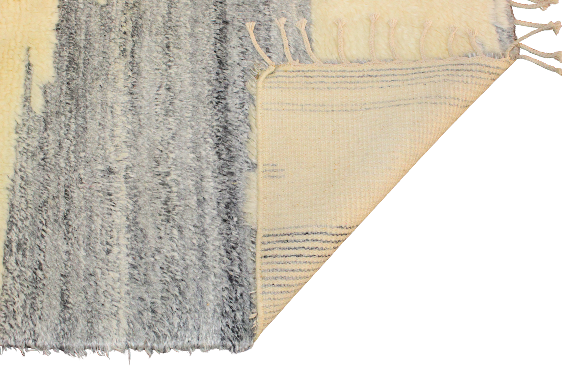 Evoking the energy of shifting skies and mountainous silhouettes, this contemporary Moroccan rug showcases a bold abstract composition in charcoal gray and ivory. The jagged, vertical patterning gives the illusion of movement — like rainfall trailing down glass or sound waves frozen in wool.