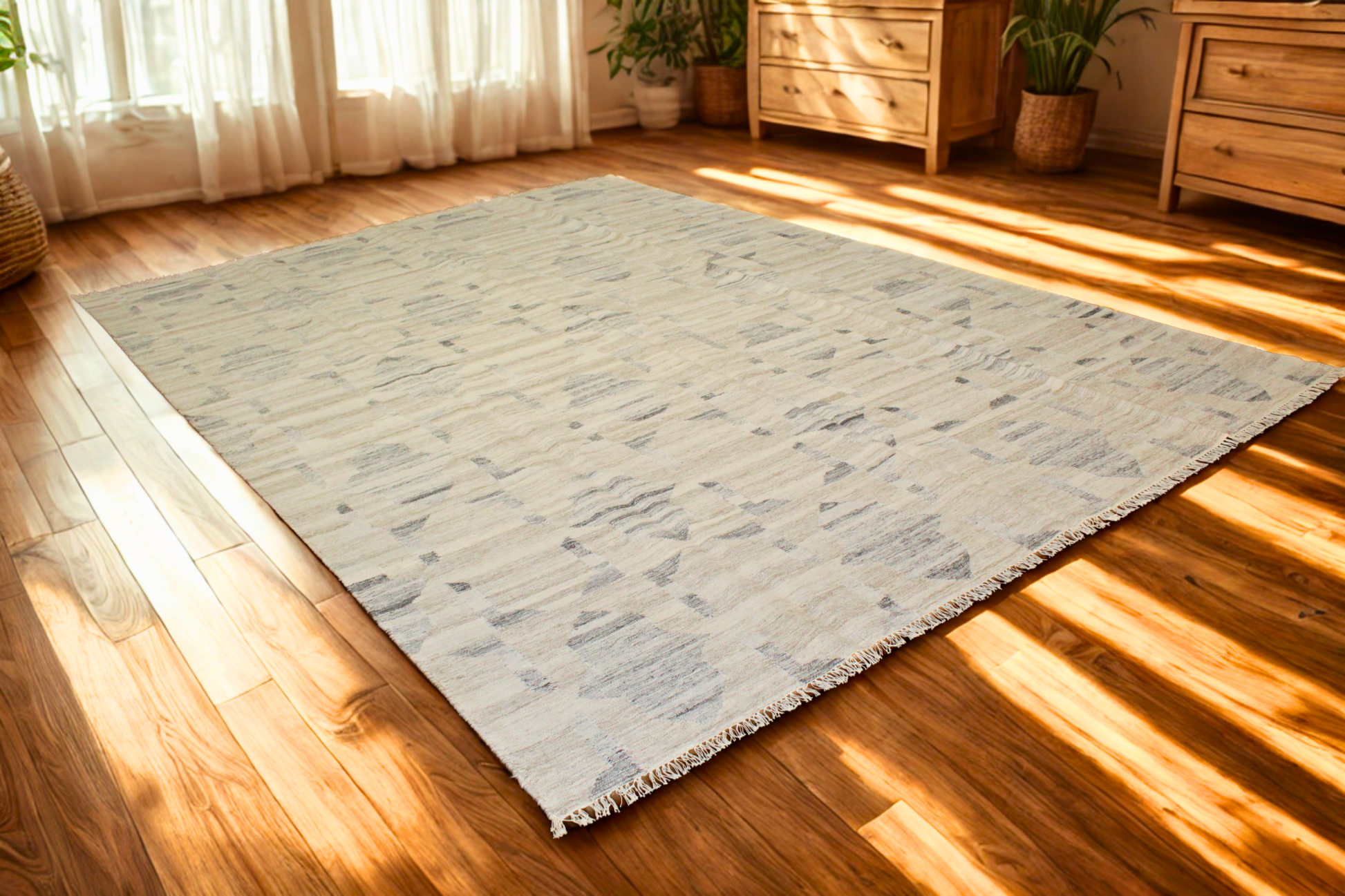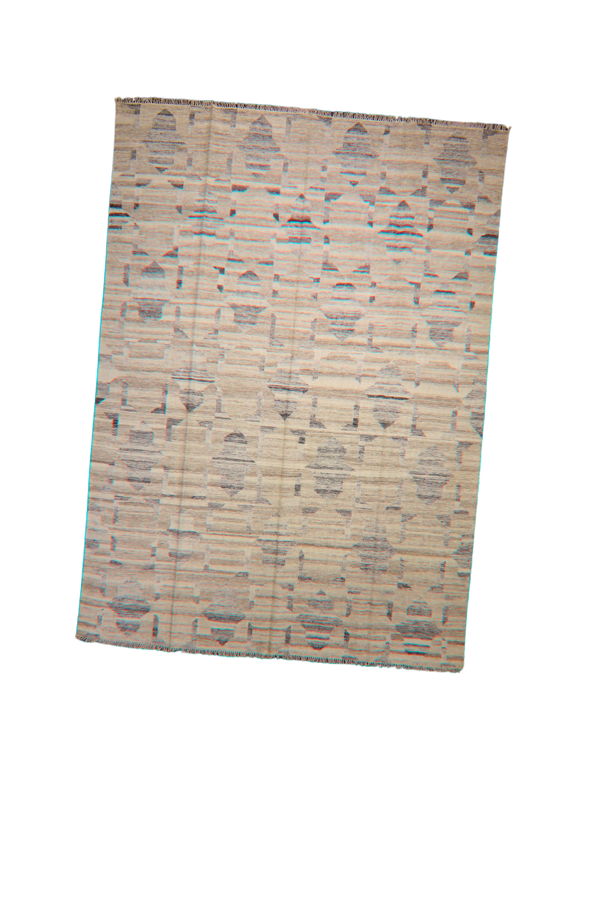 This handwoven Afghan Kilim merges modern minimalism with tribal rhythm. Measuring 9.10 x 13.8 ft, the rug features a softly textured ivory background interspersed with muted geometric forms in stone gray and pale taupe. The subtle, staggered arrangement of the shapes creates visual depth without overpowering the space — a perfect balance of calm and design.