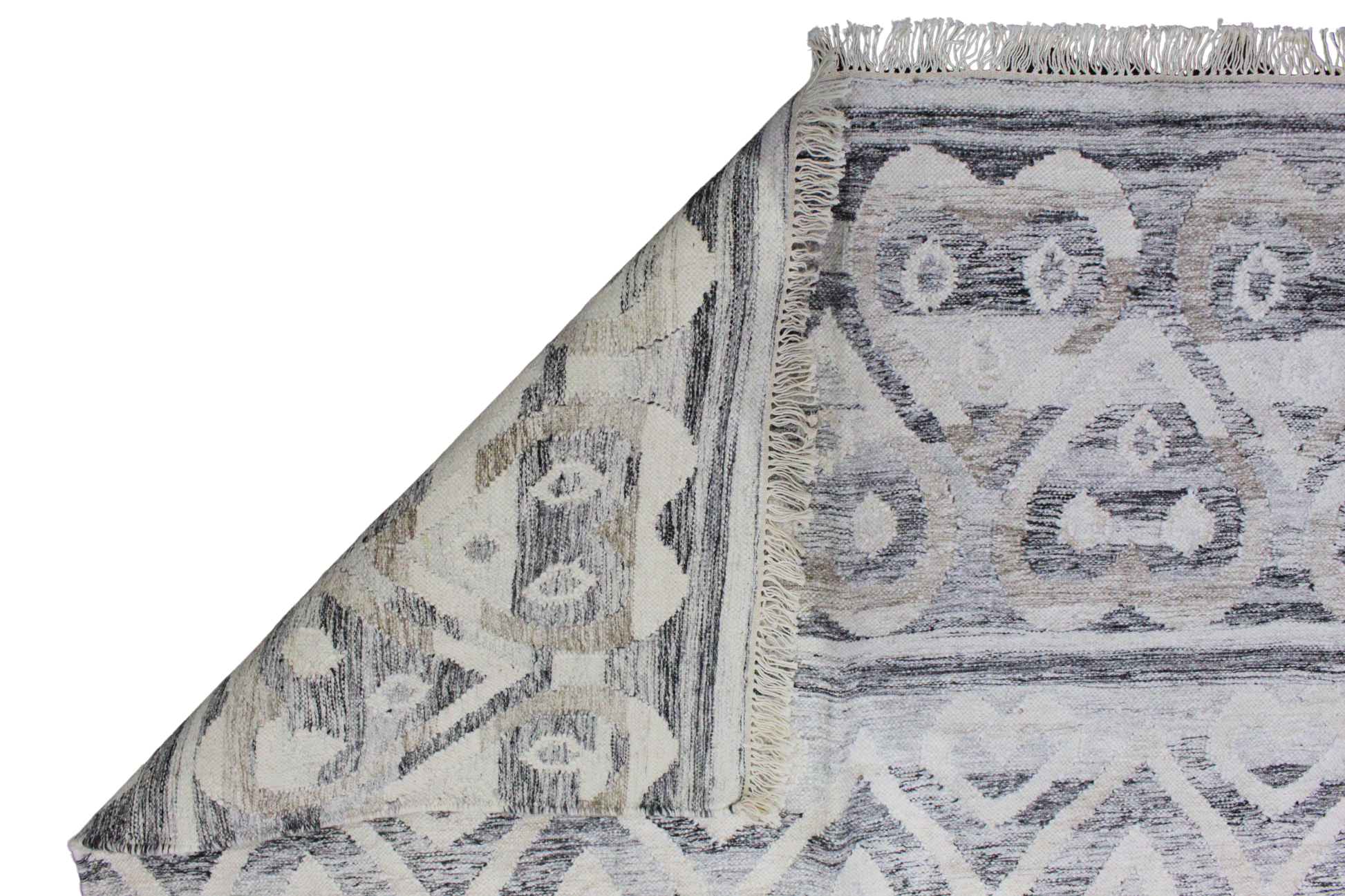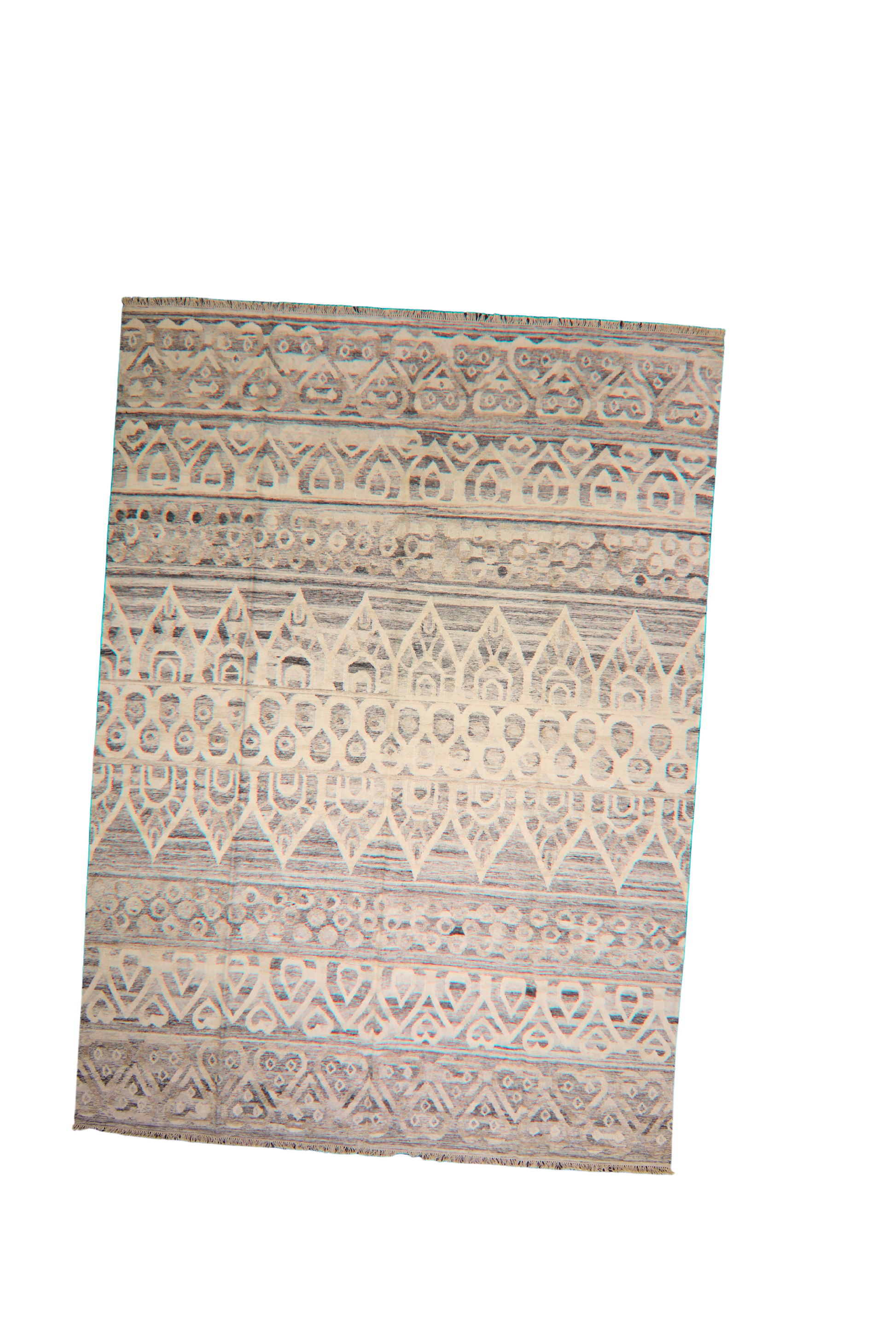 A compelling fusion of tribal tradition and modern neutrality, this large handwoven Afghan Kilim features a rhythmic horizontal arrangement of geometric motifs. Interlocking diamonds, rows of dots, and flame-like arches emerge in soft cream atop a smoky gray field — evoking the look of ancient glyphs etched into stone.