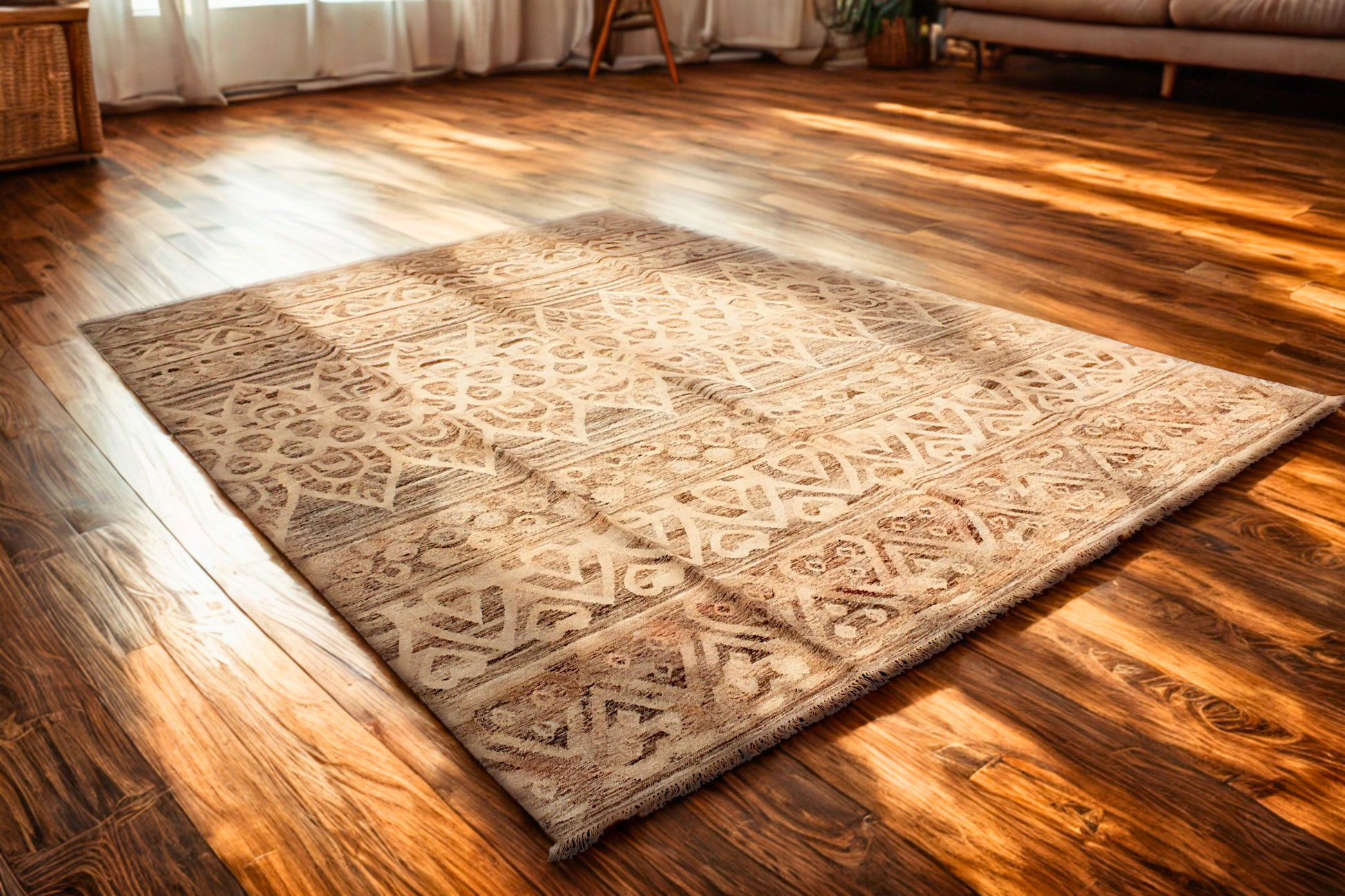 Its flatweave structure ensures a lightweight, versatile presence ideal for layering or standing alone in spacious living areas. The repeating patterns and muted tones make it a timeless, textural foundation for minimalist, rustic, or transitional interiors.
