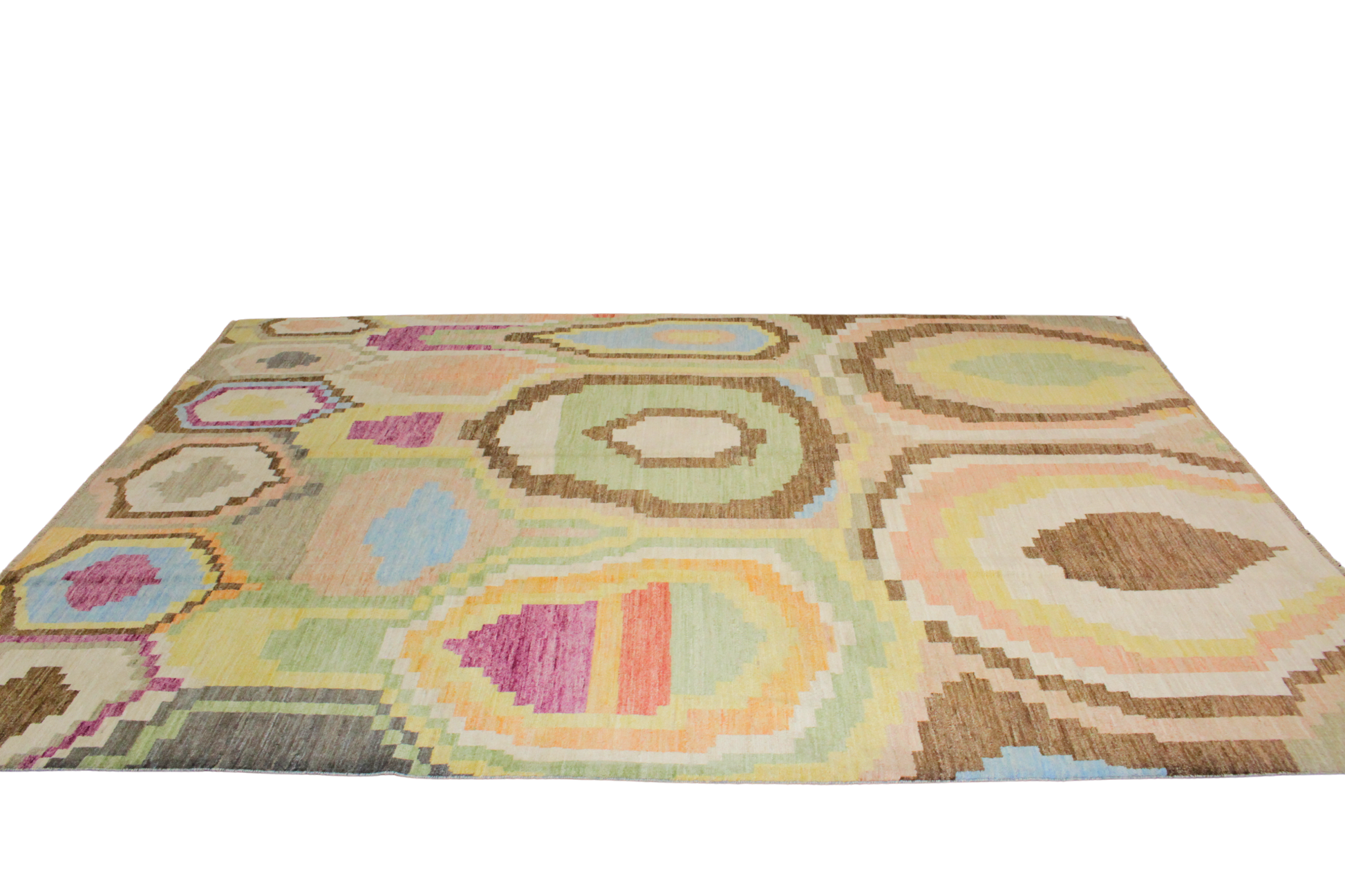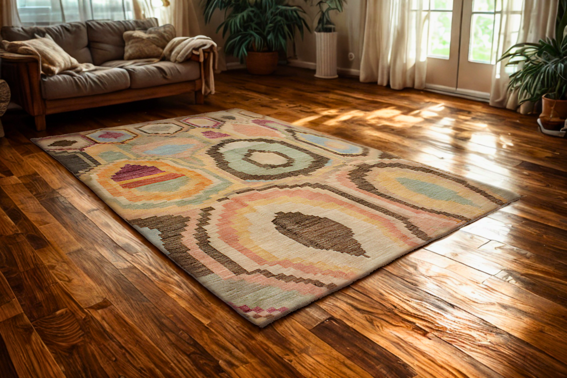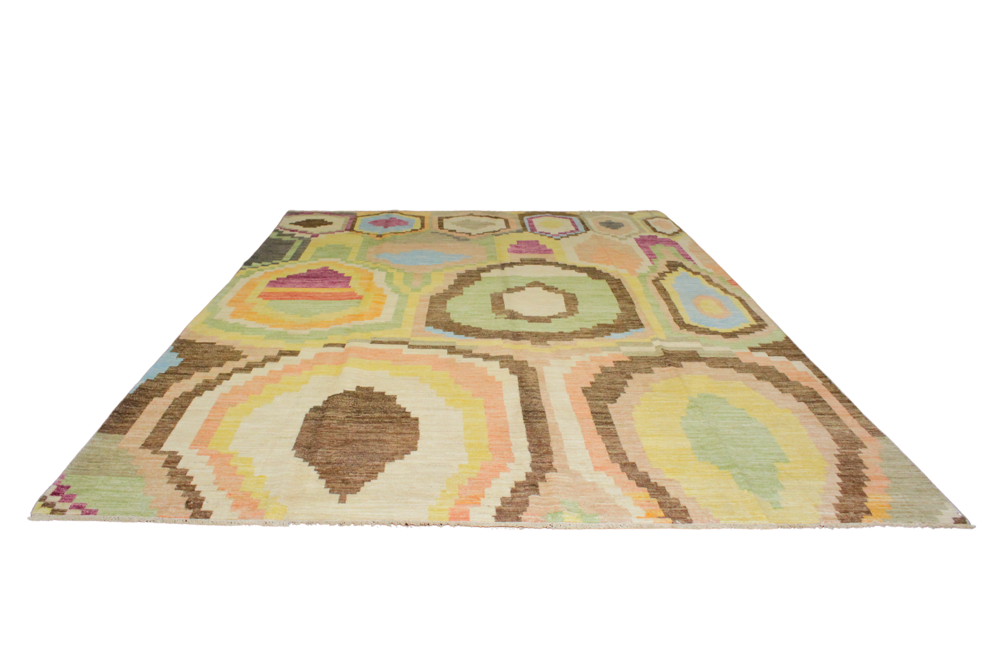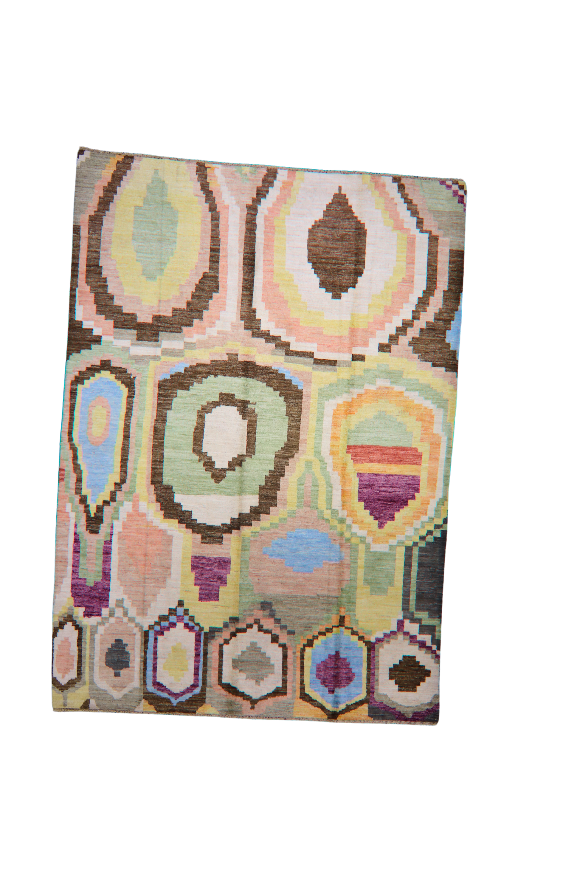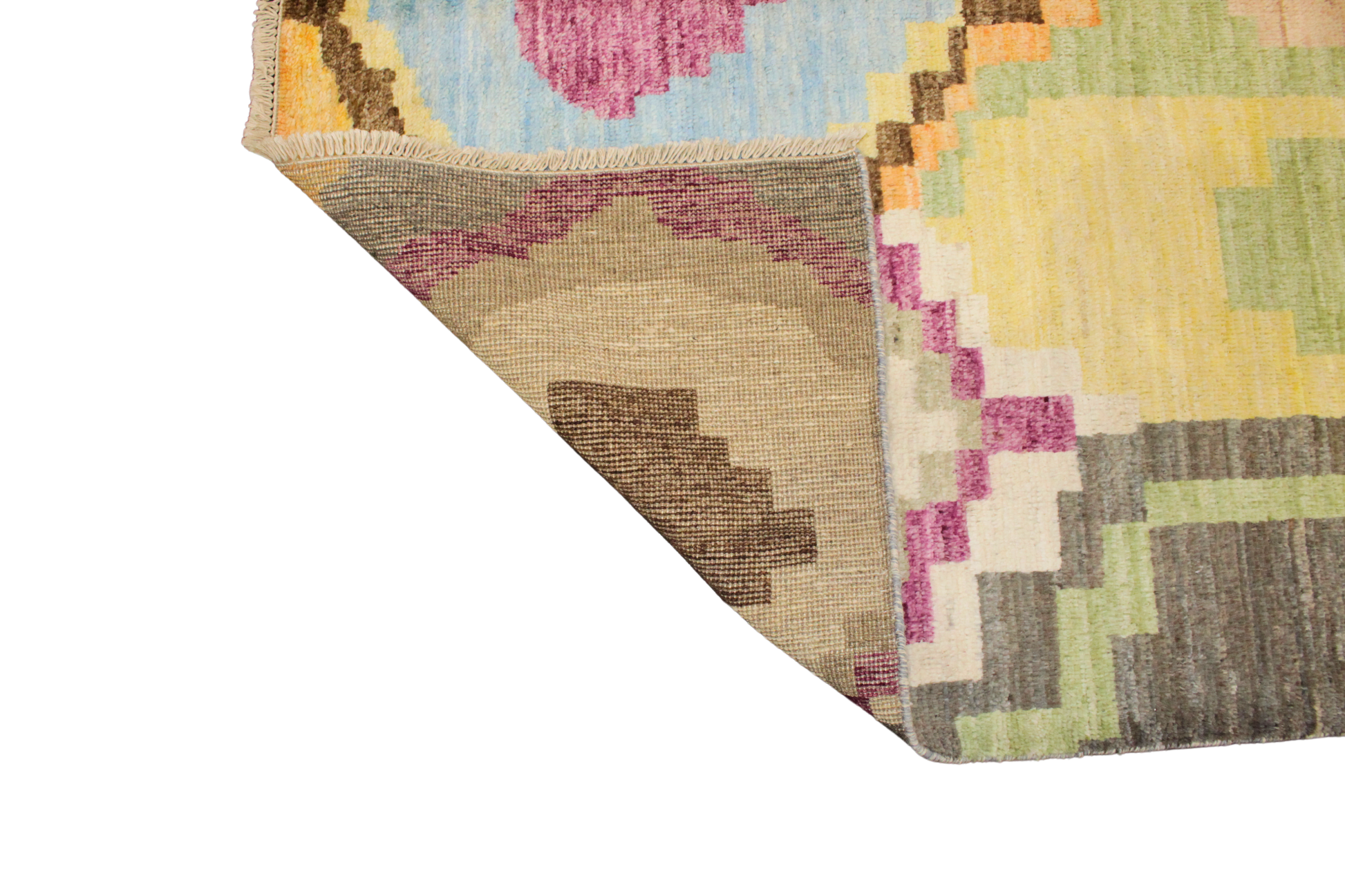 This vibrant modern Afghan kilim (9.11 × 14 ft) brings a kaleidoscope of energy to any space. Woven in a dynamic palette of pastel tones — including lavender, mint, apricot, lemon, and robin’s egg blue — the rug features bold geometric medallions arranged in rhythmic bands across the field. Each shape is rendered in pixelated, stepped motifs that give the piece a distinctly contemporary edge while nodding to tribal pattern traditions.