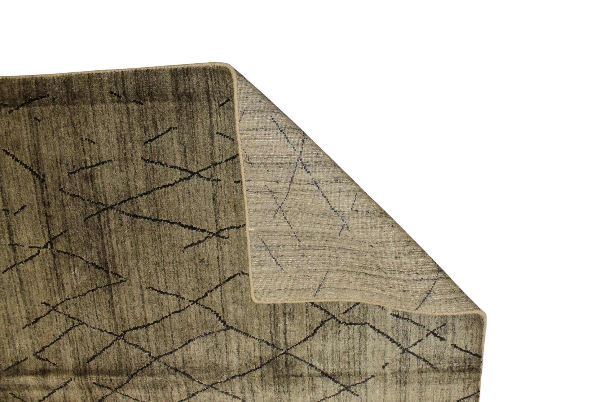 A modern masterpiece rooted in natural tones, this 9.10 × 13.11 ft rug from Nepal is a striking fusion of contemporary design and organic texture. Its irregular latticework of black linear motifs sprawls across an earthy olive-gray field, evoking tribal influences with a sophisticated minimalist flair.