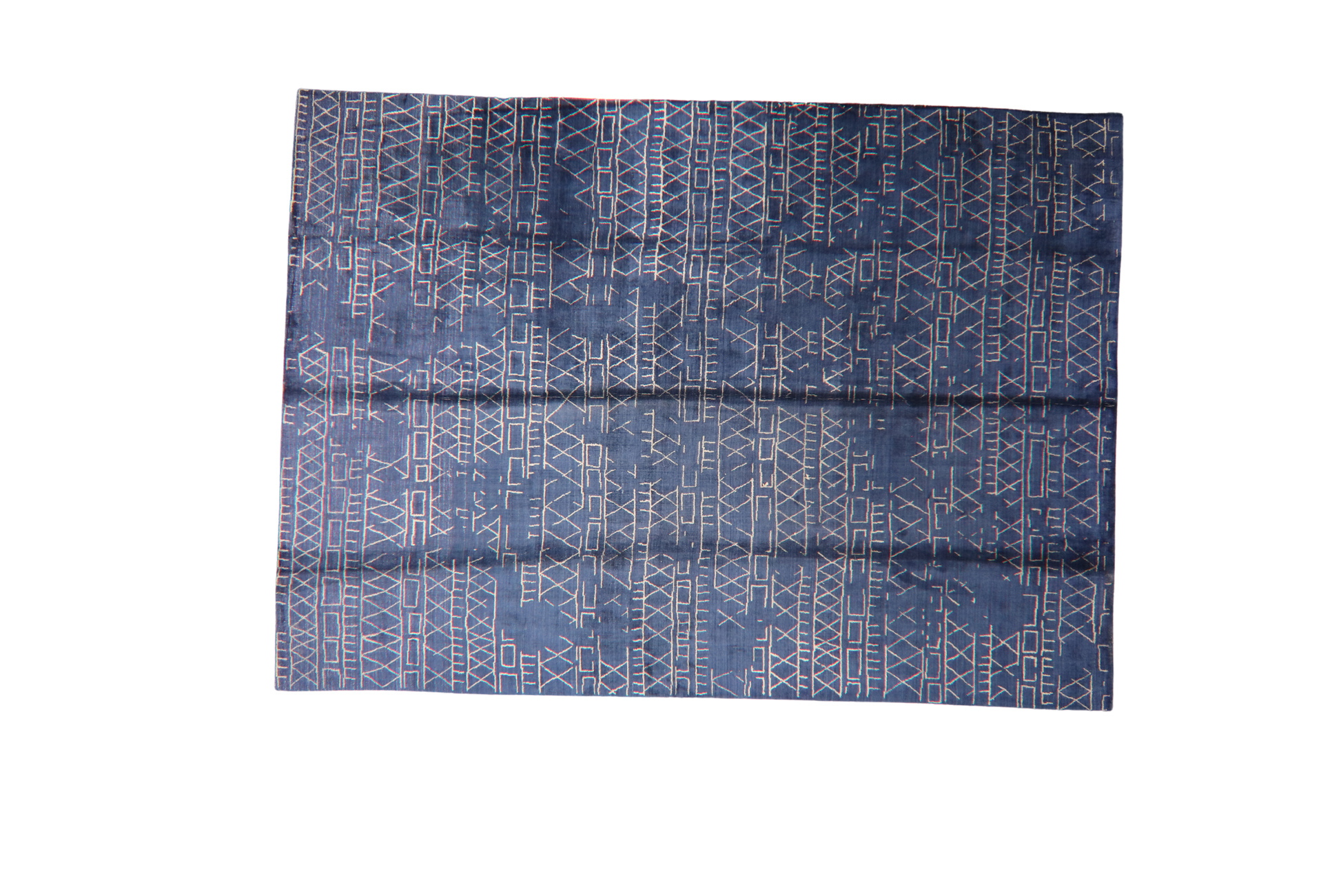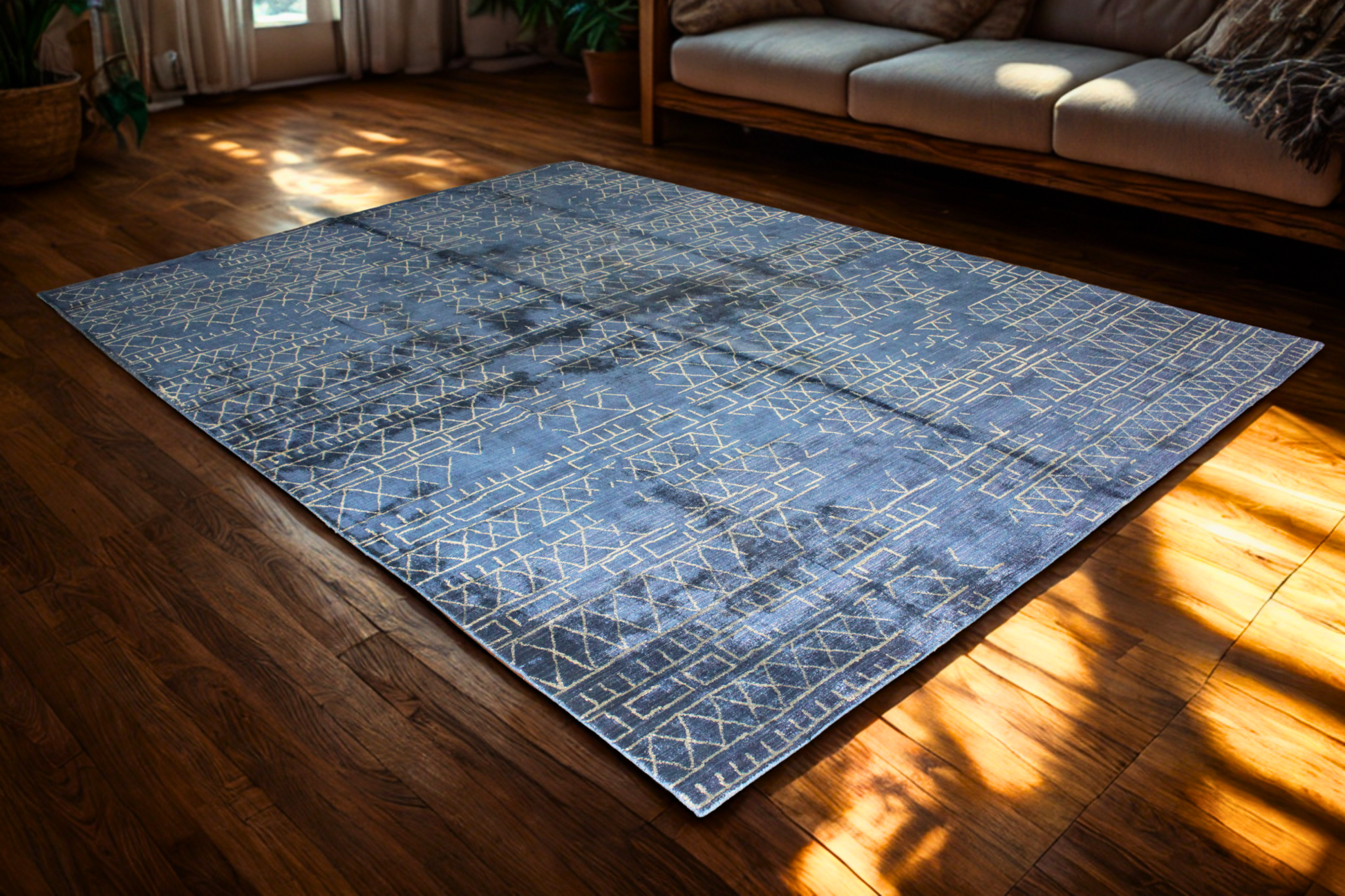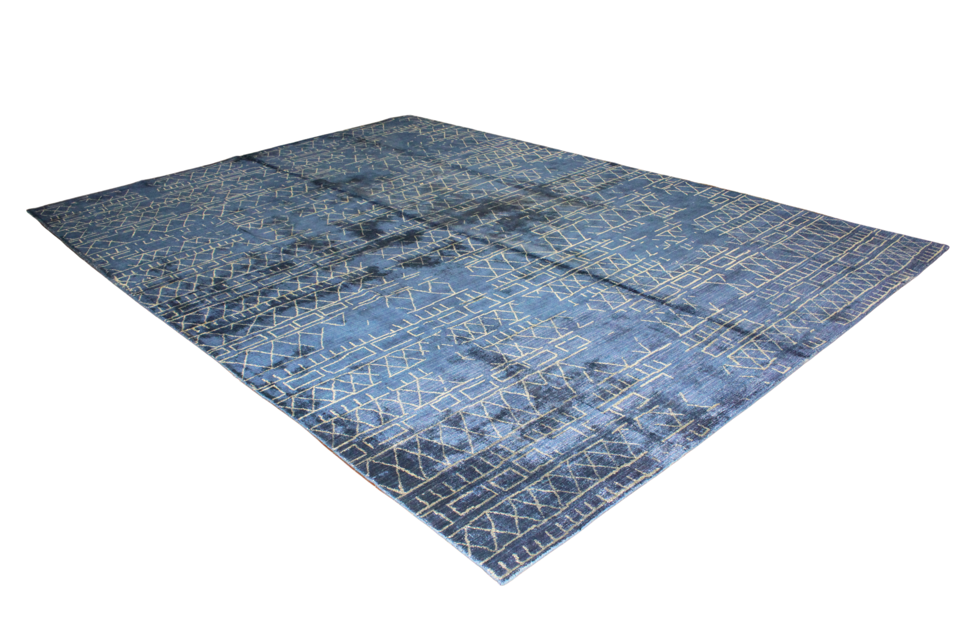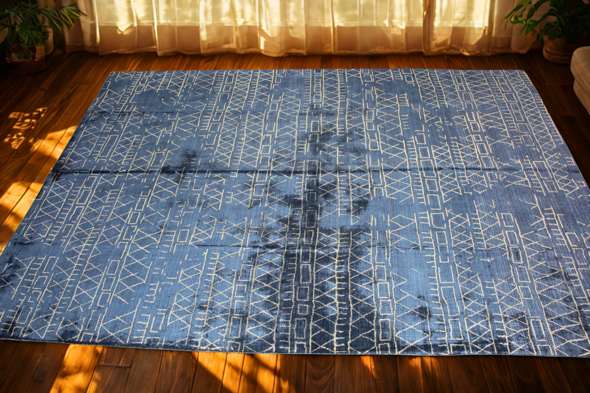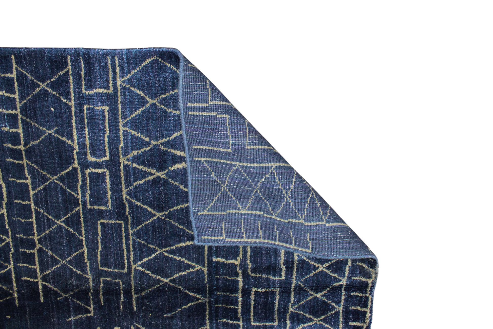 Command attention with this captivating modern rug from Nepal, measuring 9.10 × 13.10 ft. Hand-knotted in wool, its rich indigo-blue field is marked by a rhythmic grid of ivory tribal motifs — an abstract blend of geometry and global influence.