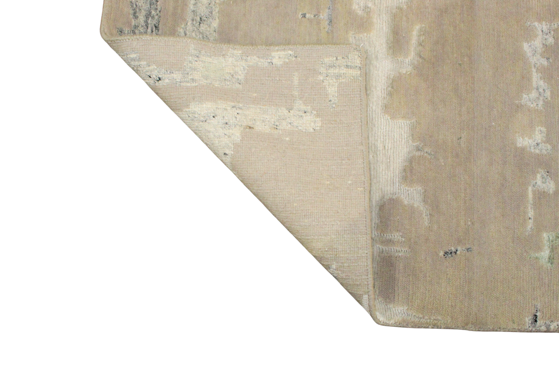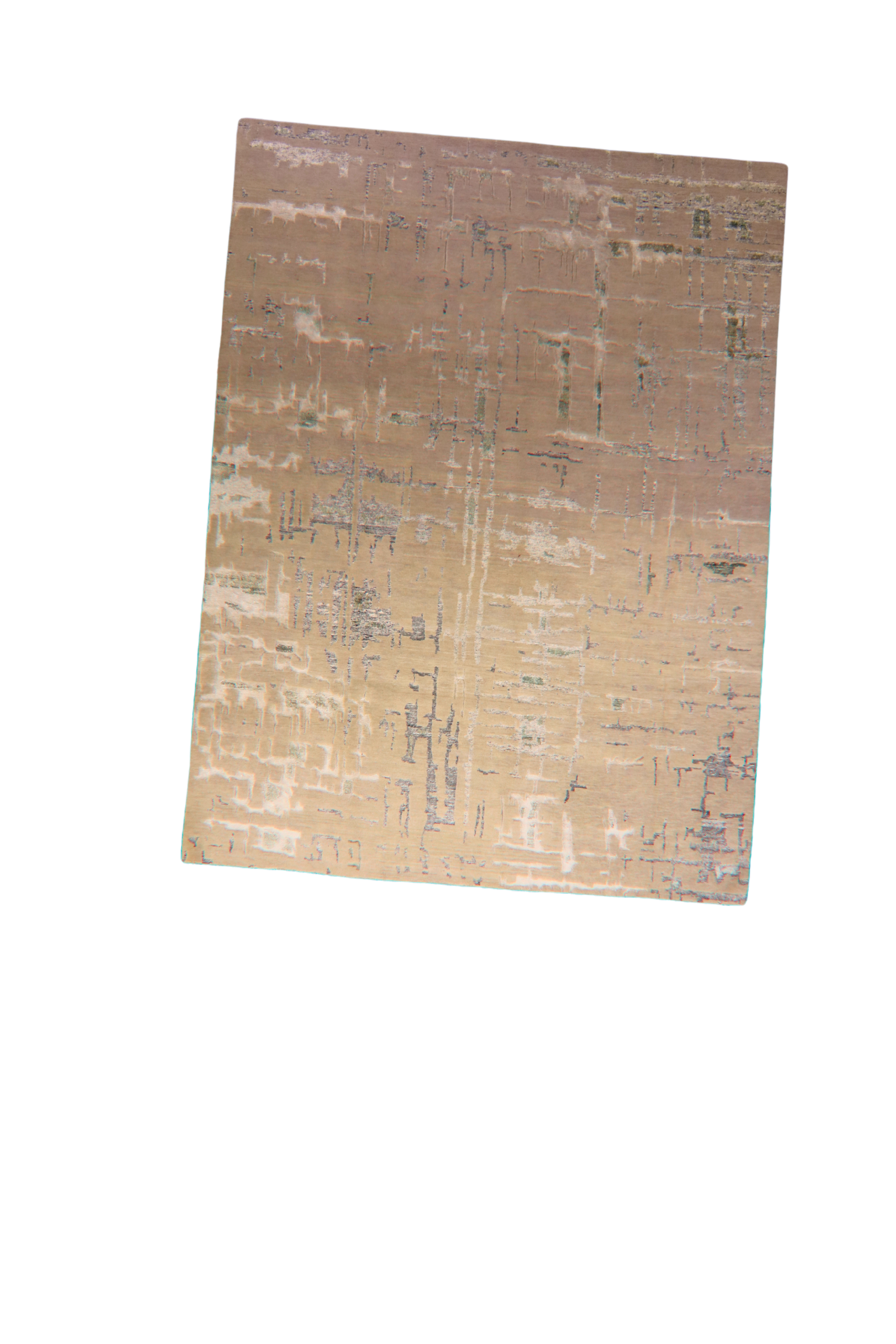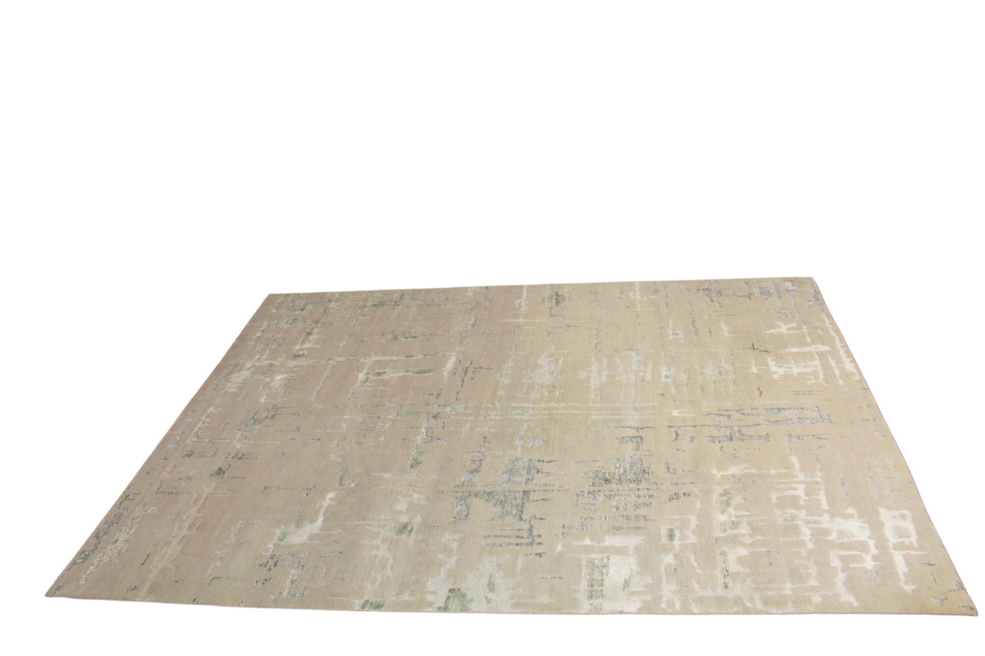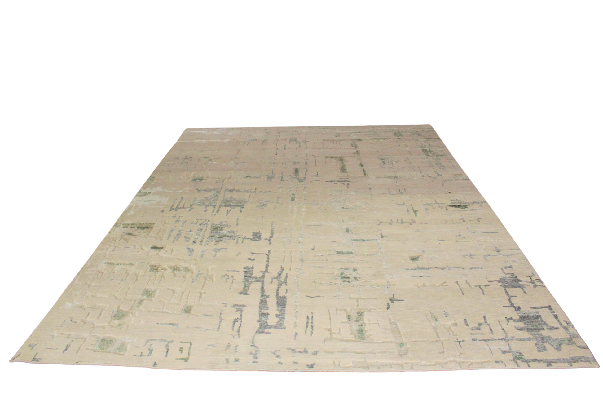 This refined modern rug from Nepal (9 × 12.1 ft) brings a quiet sophistication to any contemporary setting. Woven in soft wool, it features a subdued beige field with abstract grid-like brushstrokes in silvery grey, cool sage, and hints of charcoal — resembling the layered textures of weathered stone or urban concrete.