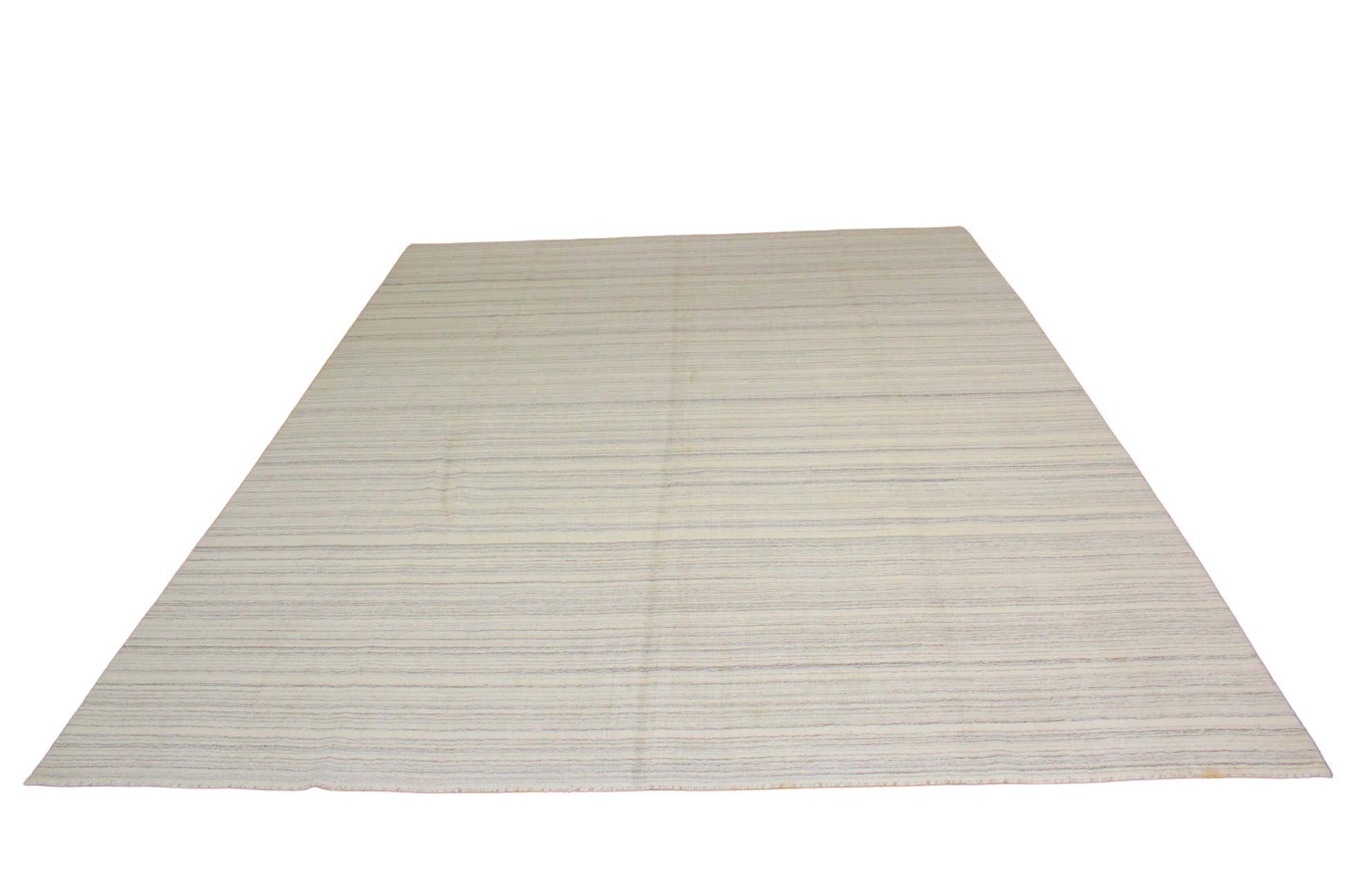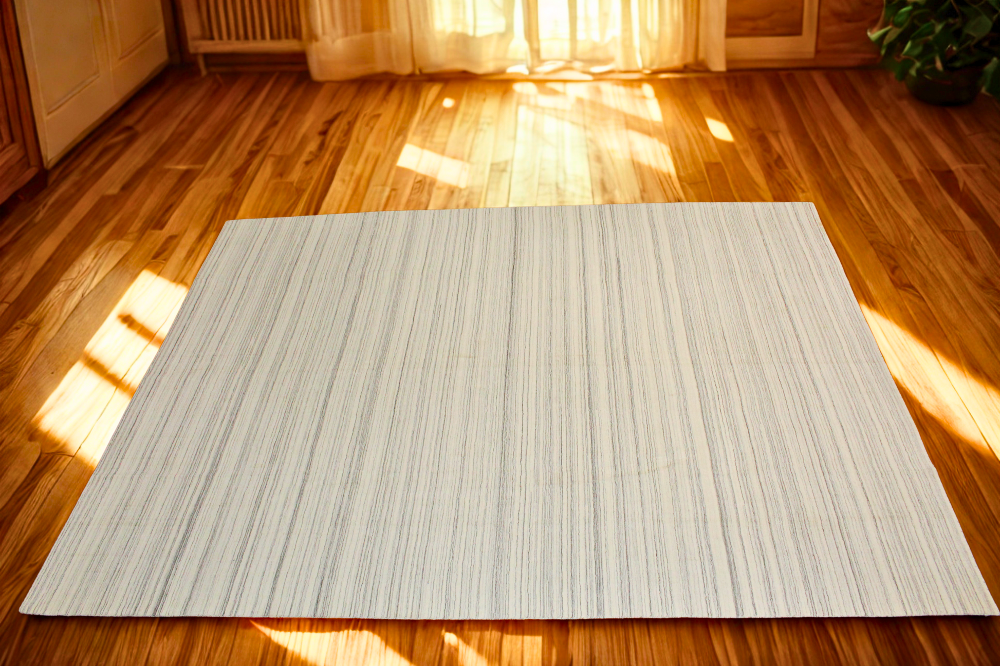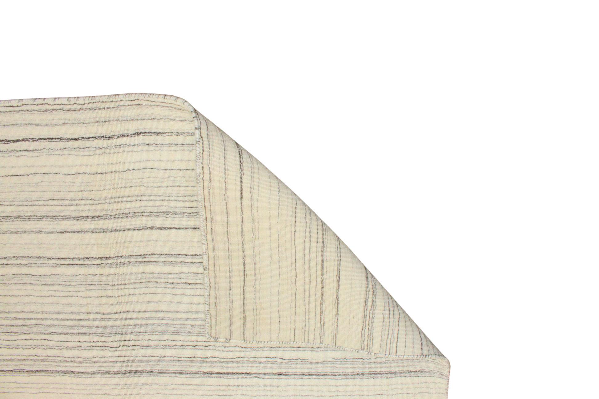 Minimalism meets warmth in this hand-knotted modern rug from Afghanistan (8.11 × 11.9 ft), where thin multicolored stripes quietly stretch across a creamy base. The lines—subtle blues, rusts, and soft greys—create a calm, balanced rhythm that reads both contemporary and timeless.