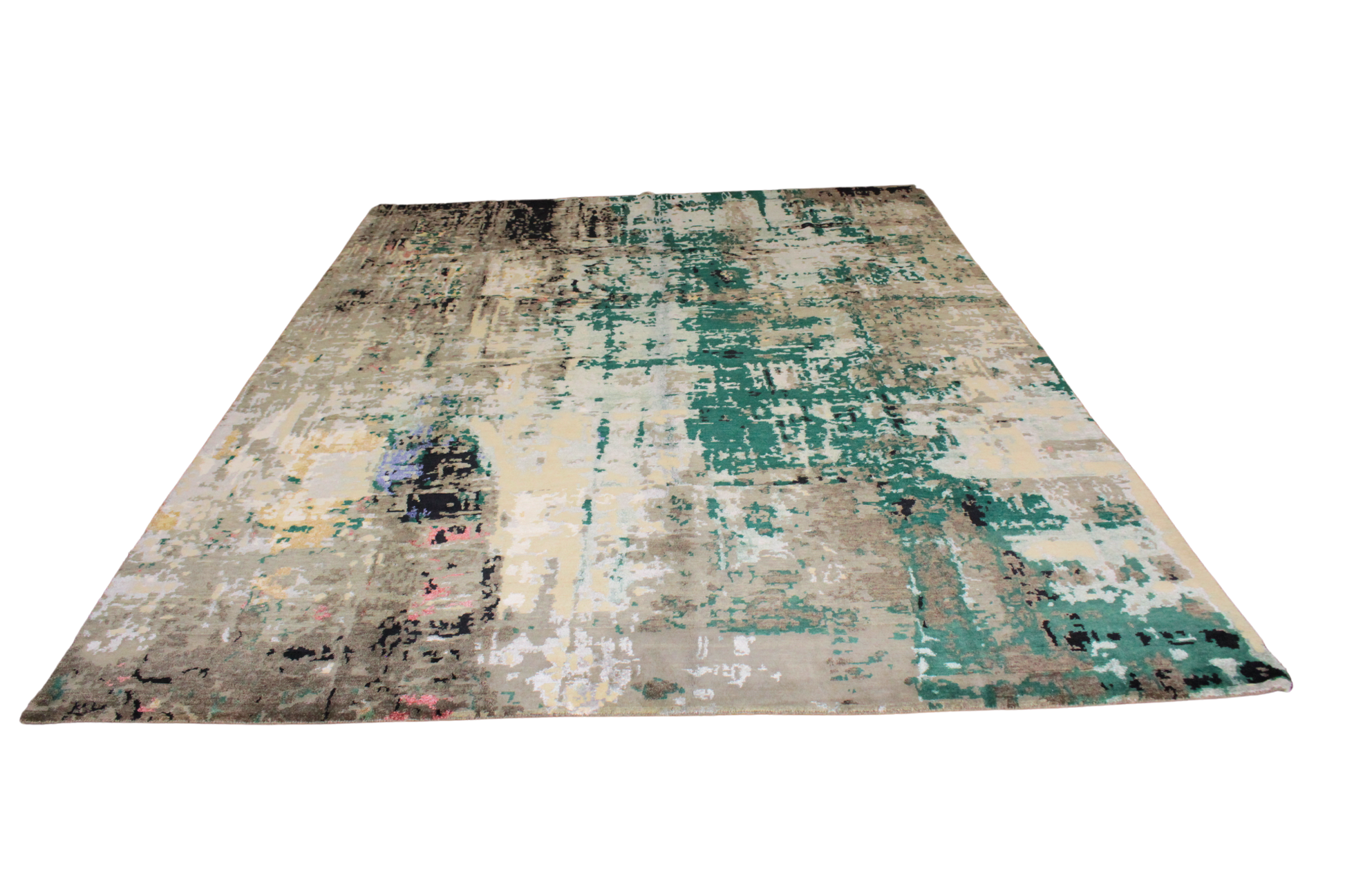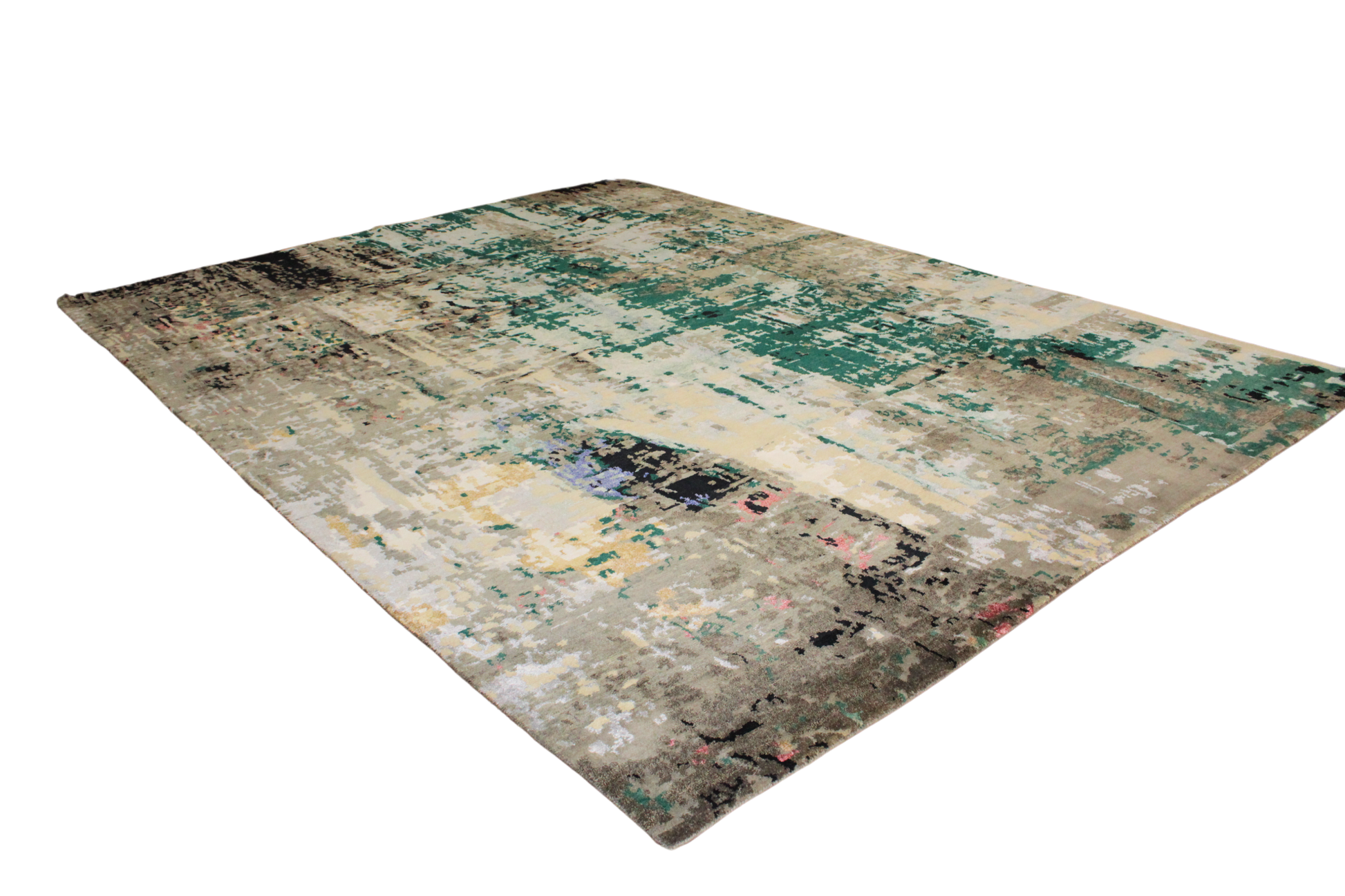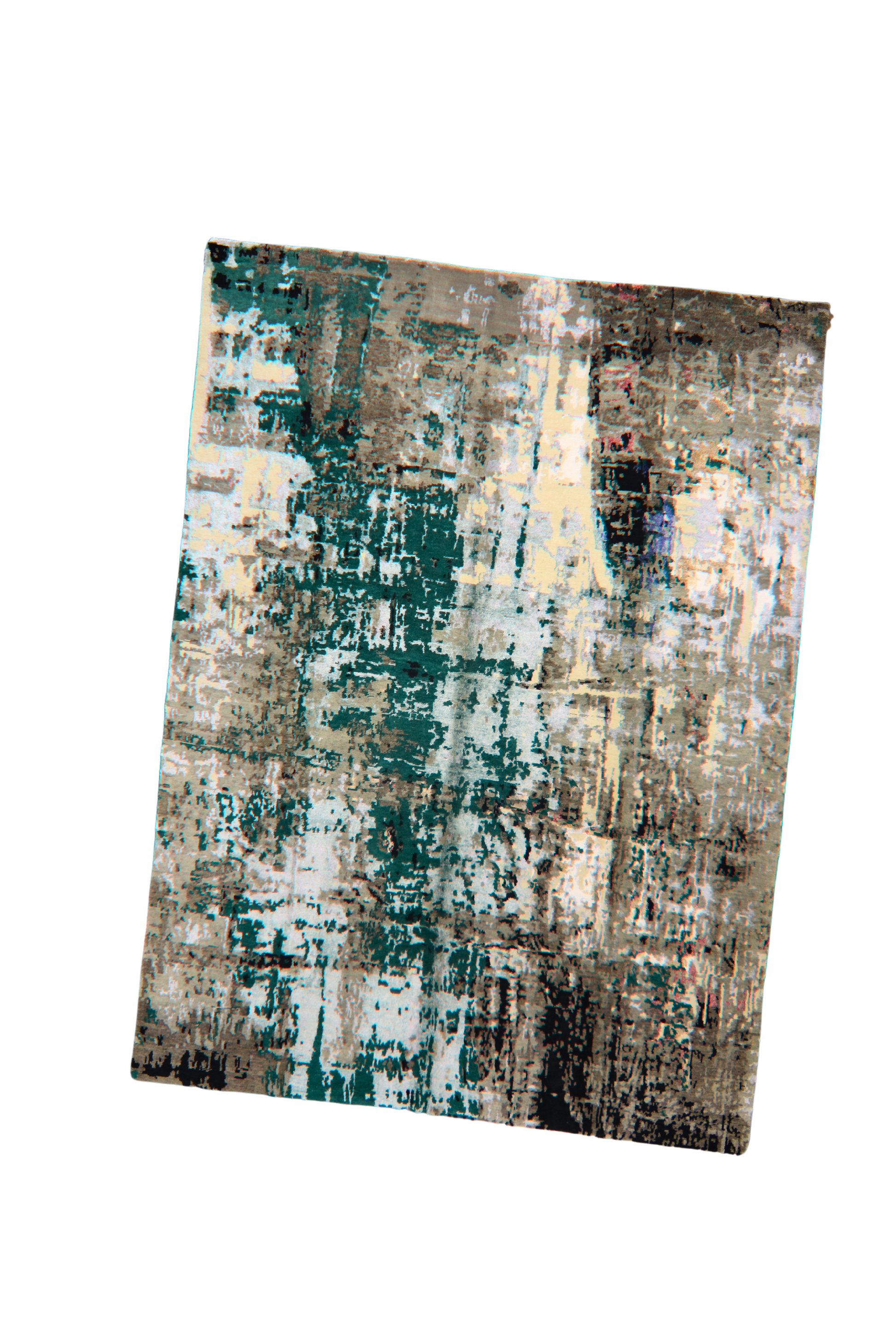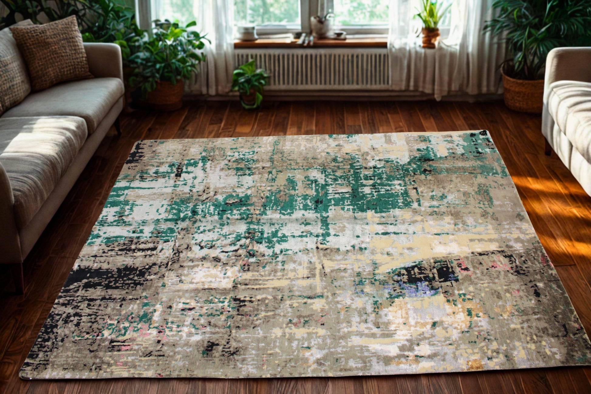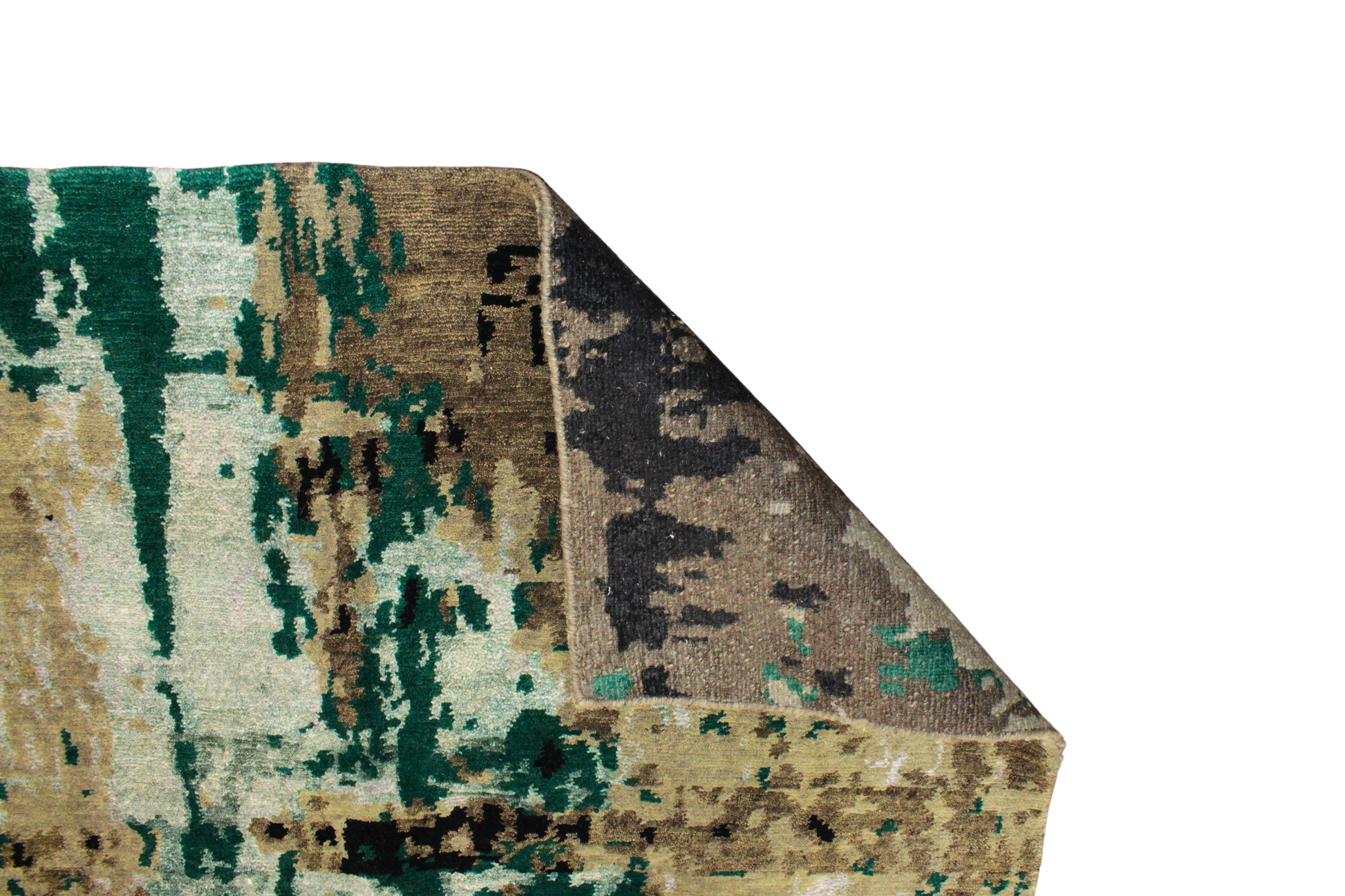 This striking modern rug from Nepal (10 × 14 ft) commands attention with its moody palette and bold abstract composition. A rich interplay of forest green, ivory, charcoal, and taupe mimics the look of weathered surfaces—like moss creeping across old concrete or sunlit stone textures.