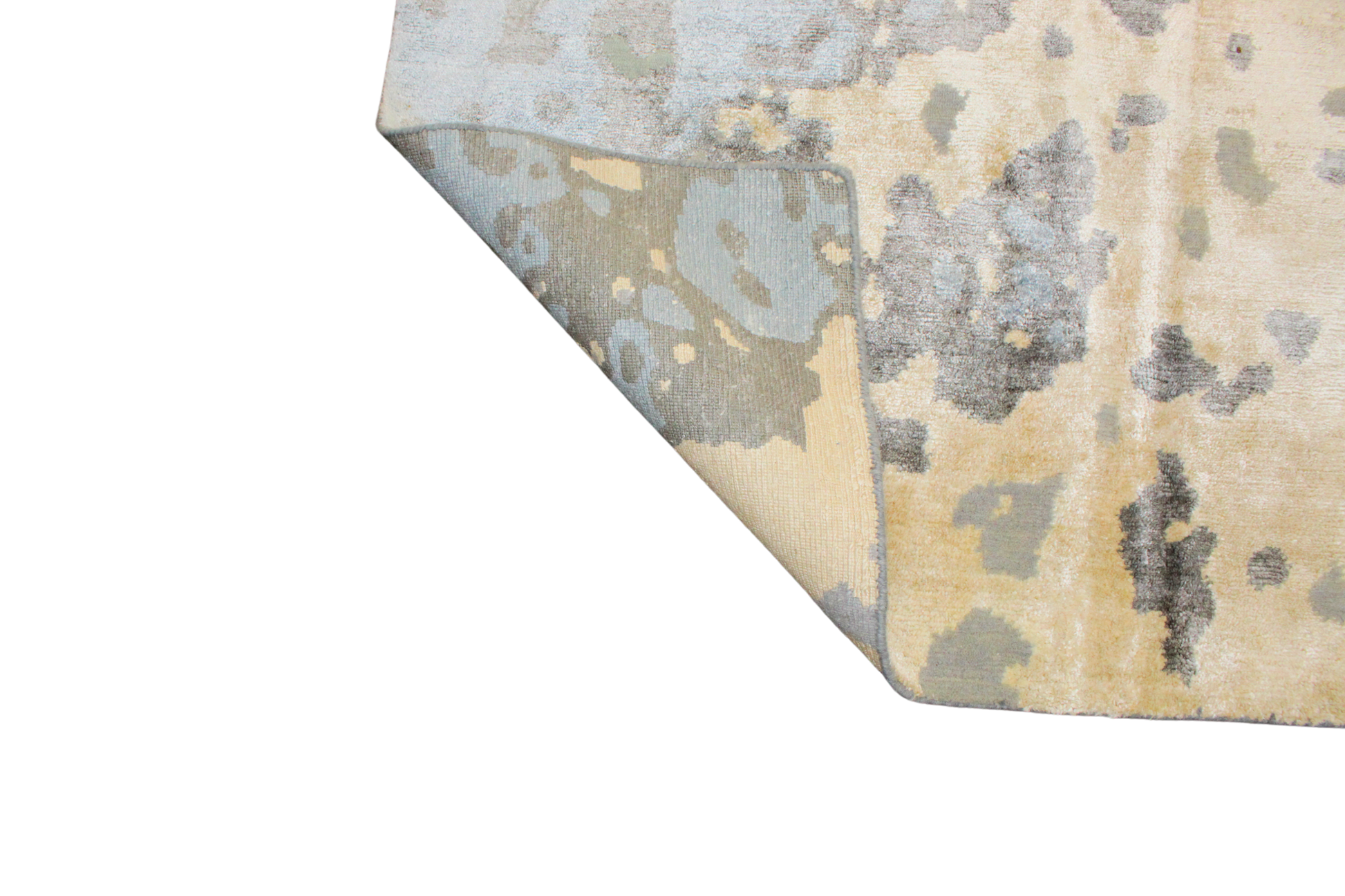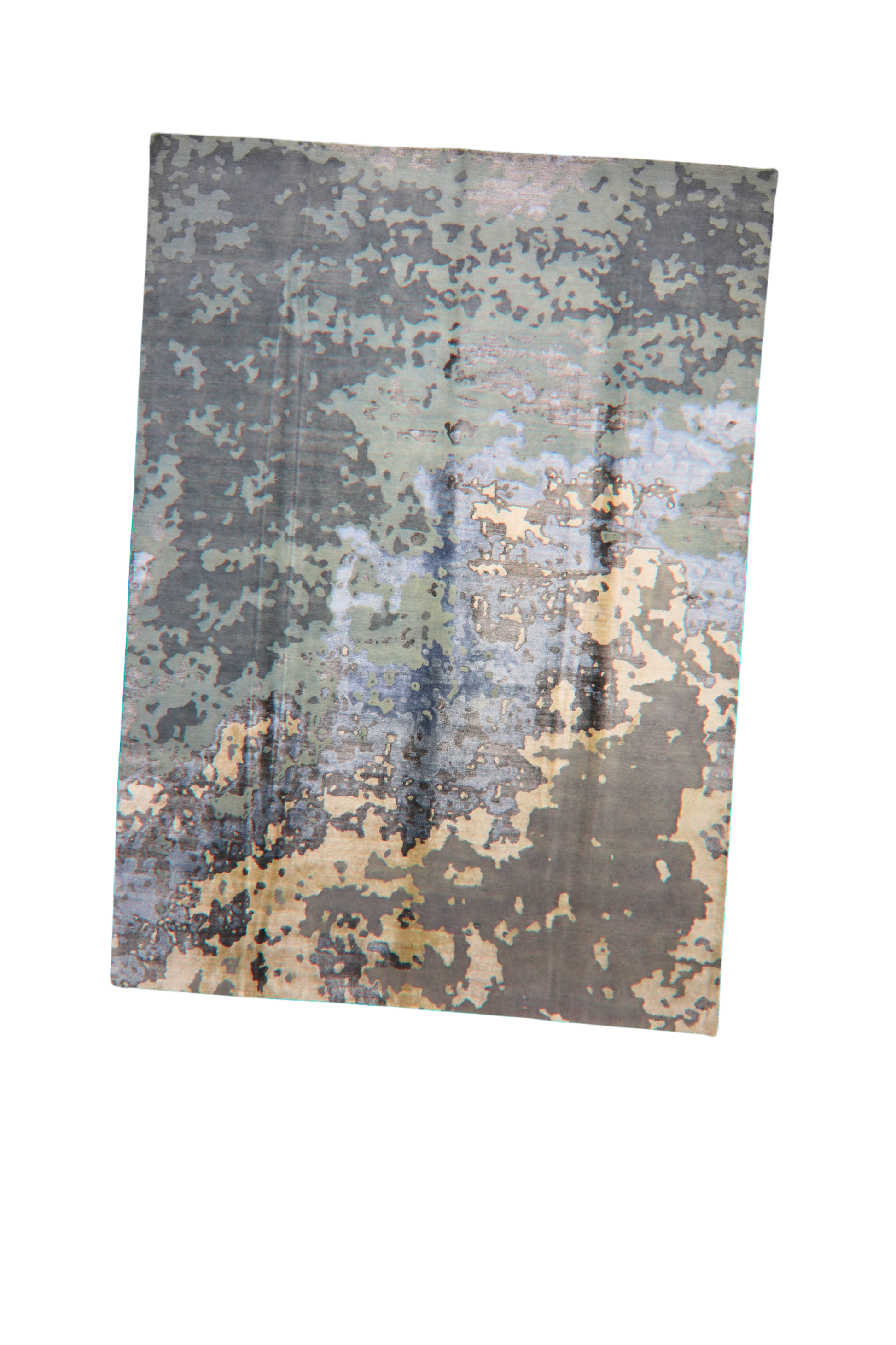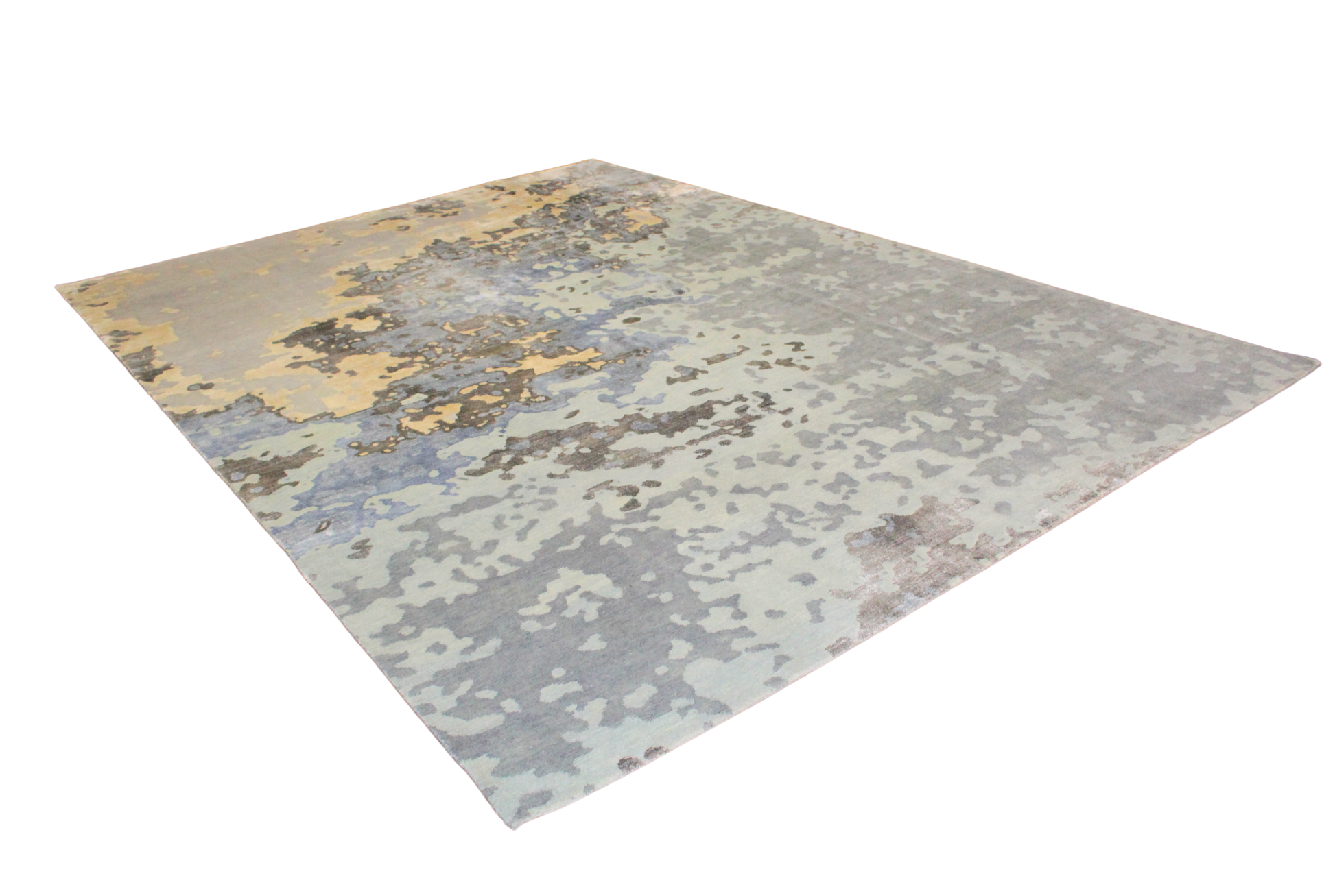 This calming modern rug from Nepal (9.10 × 13.8 ft) channels the look of natural landscapes viewed through a soft-focus lens. Washed shades of slate green, silvery blue, and cream blend together like a misty forest canopy or mountain fog. The effect is subtle and serene, with abstract, cloudlike transitions throughout the piece.