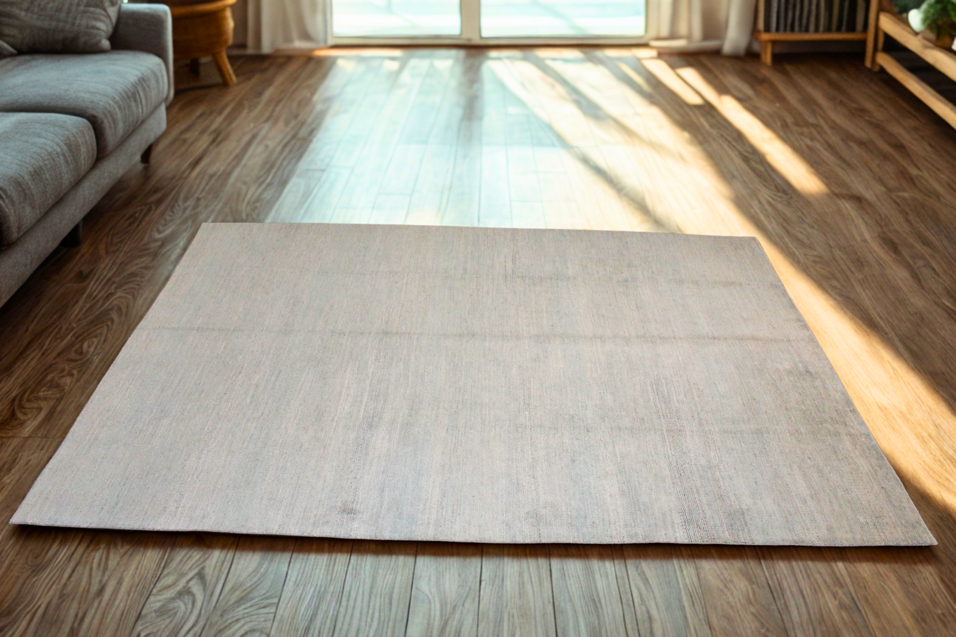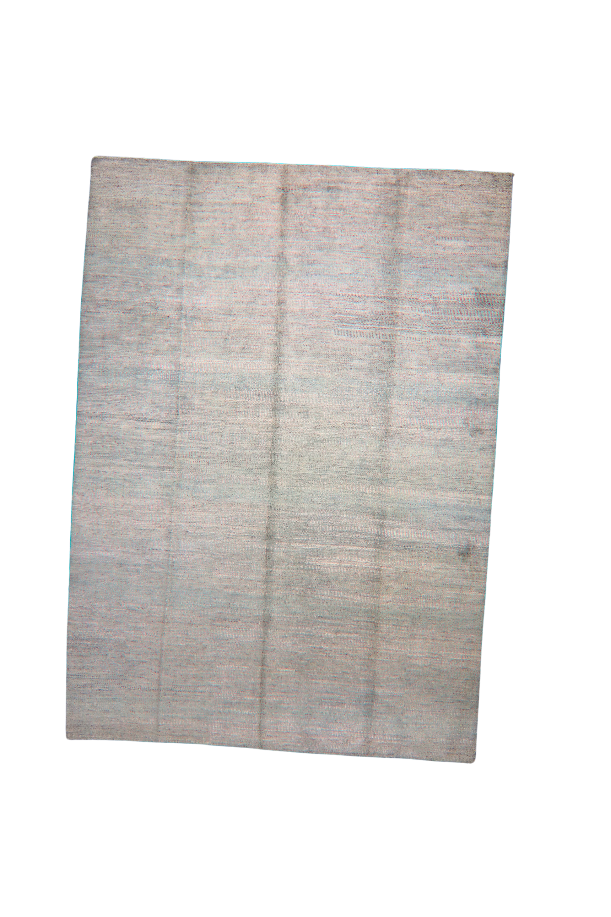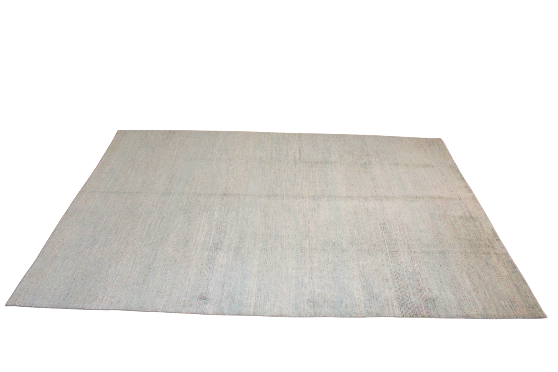 A study in refined restraint, this hand-knotted Afghan rug (9.10 × 14 ft) exudes modern calm with its soft, misty aqua tones and near-solid field. Barely-there striations ripple across the surface, giving it the quiet texture of a watercolor wash or woven silk. Its simplicity makes it endlessly versatile — a grounding element for both bold and neutral interiors.