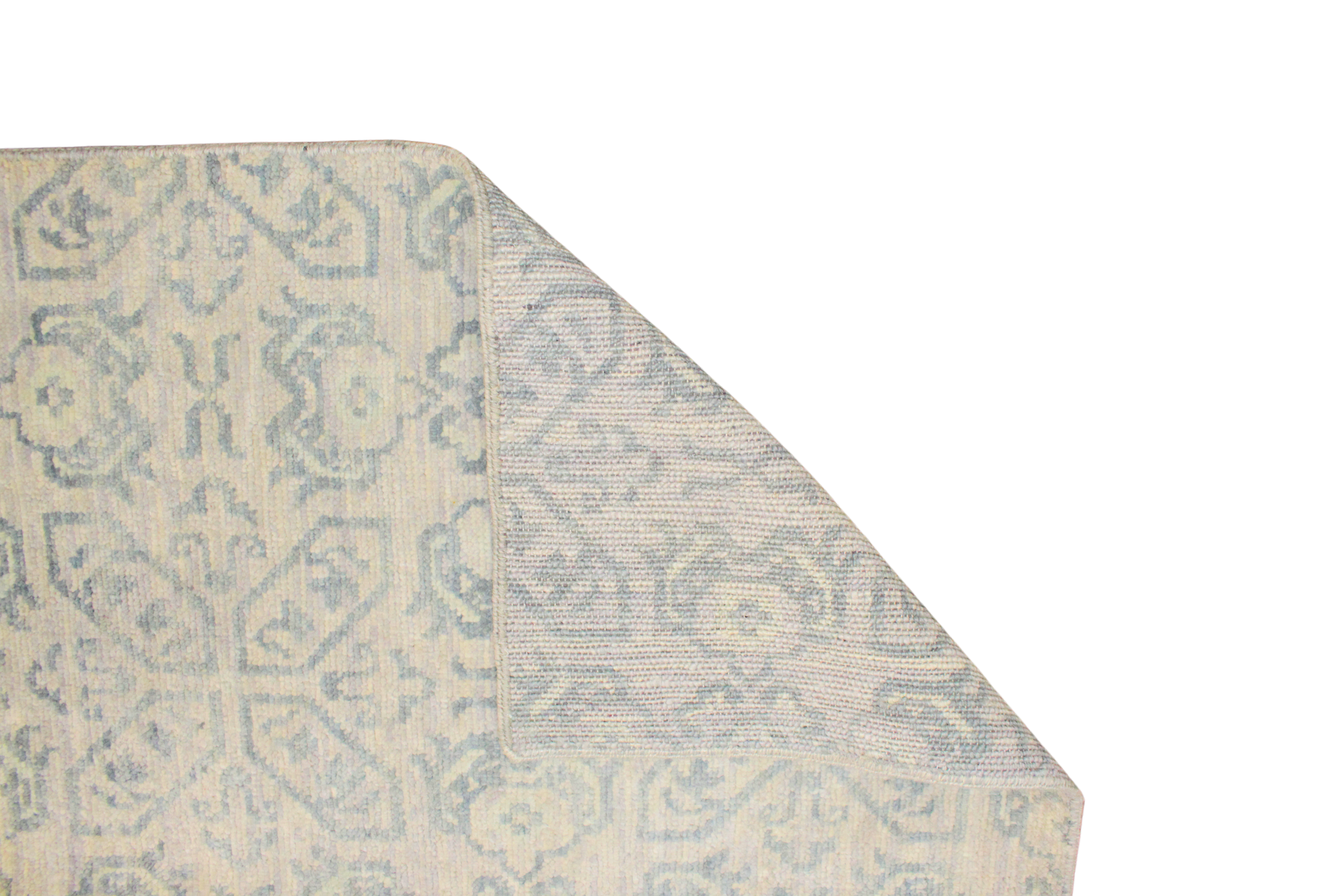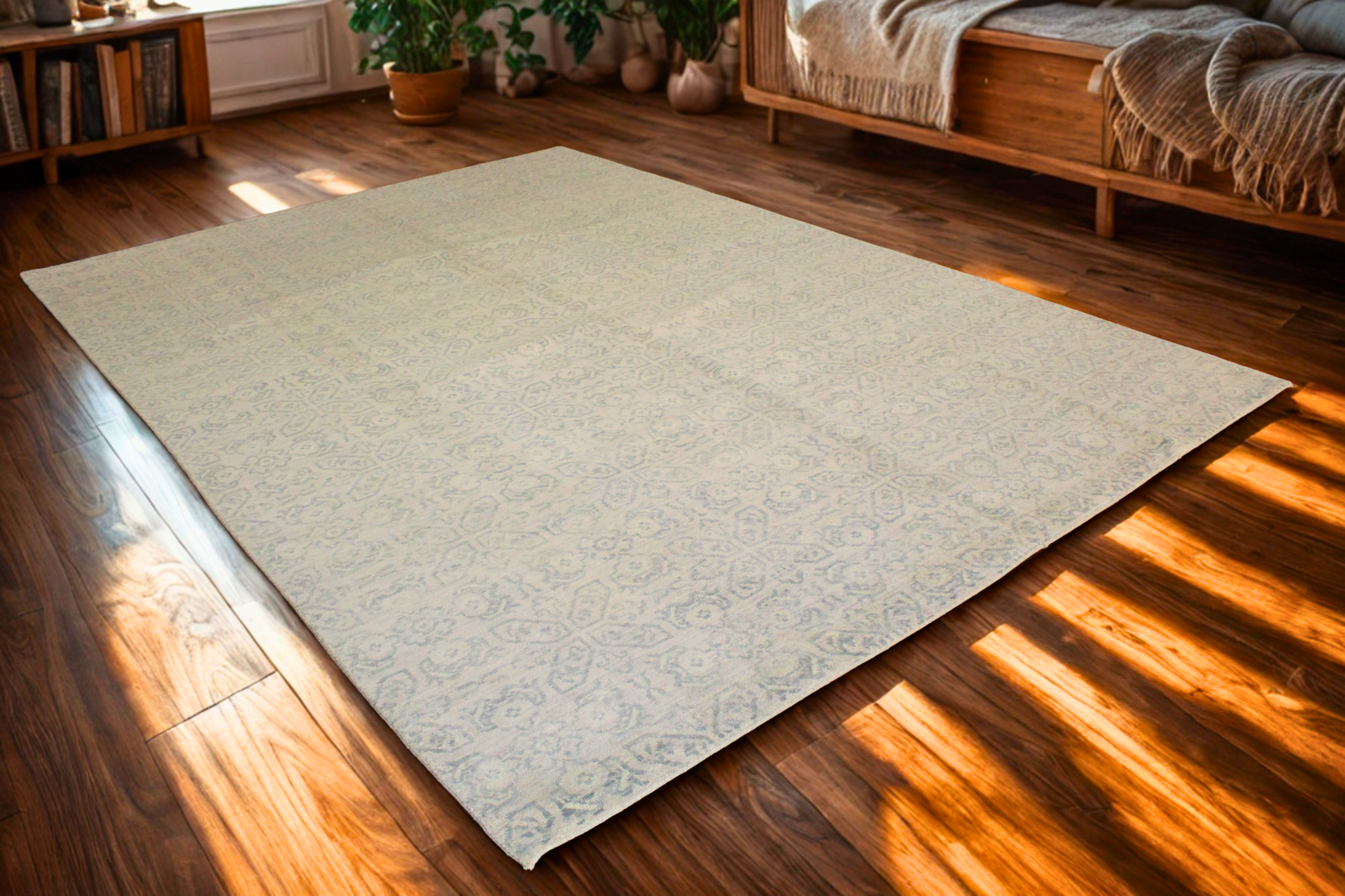 Delicate yet impactful, this 9.9 × 14 ft modern Afghan rug reimagines traditional floral motifs in a whisper-soft palette of pale sky blue and faded ivory. The allover pattern features a tiled layout of stylized blossoms and vines, gently distressed for a timeworn, almost antique effect — though crafted with entirely modern sensibilities.