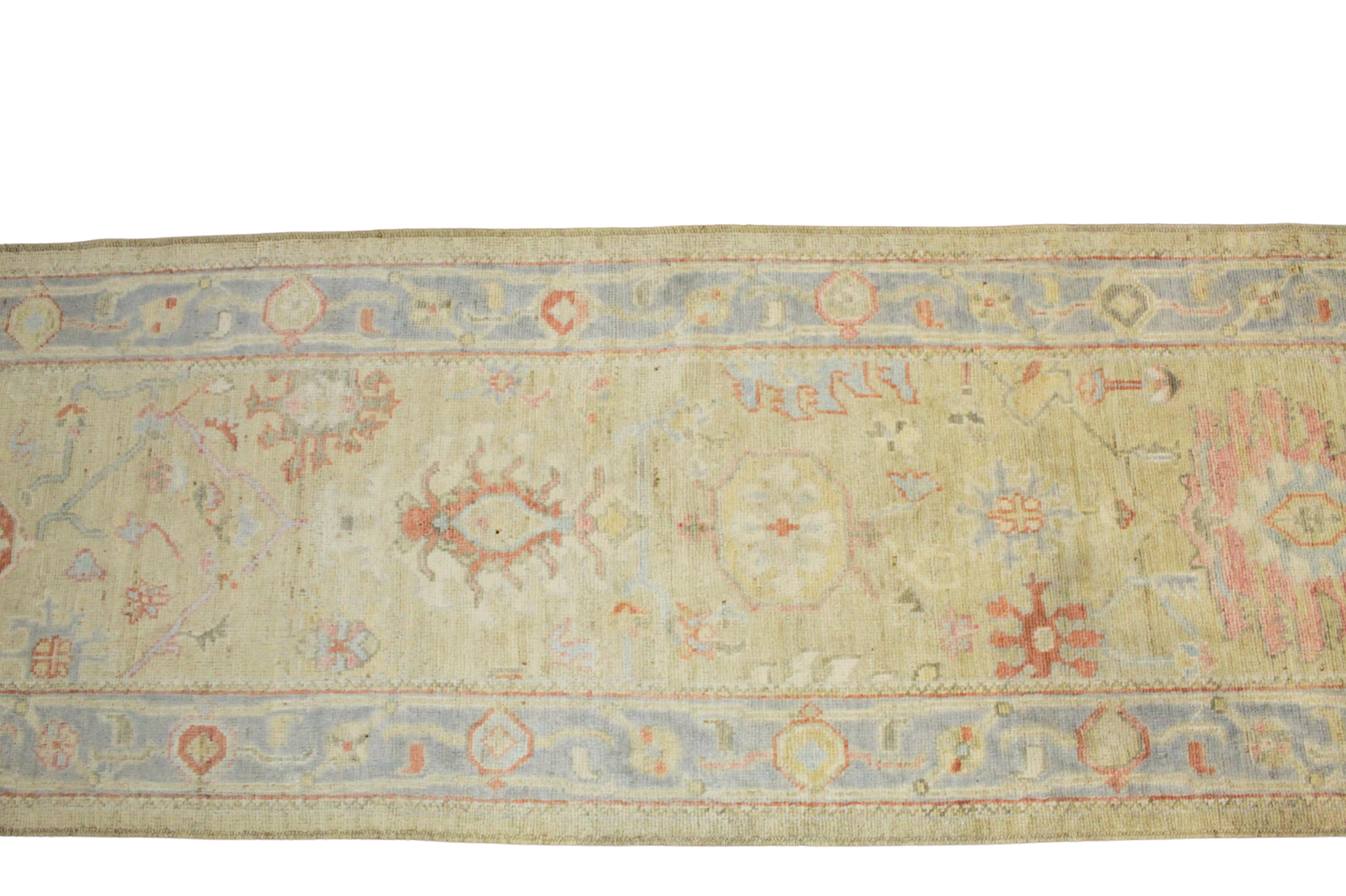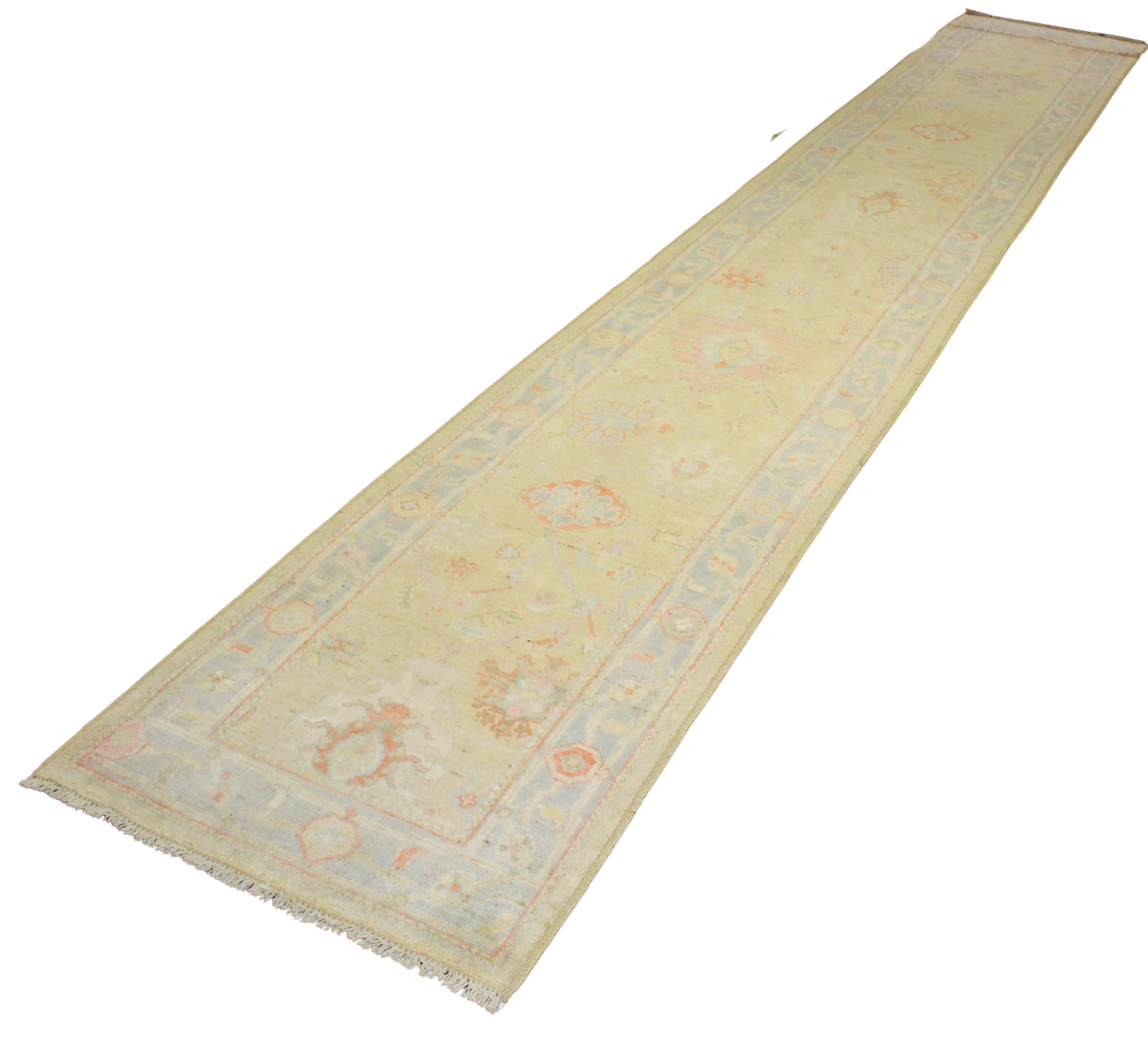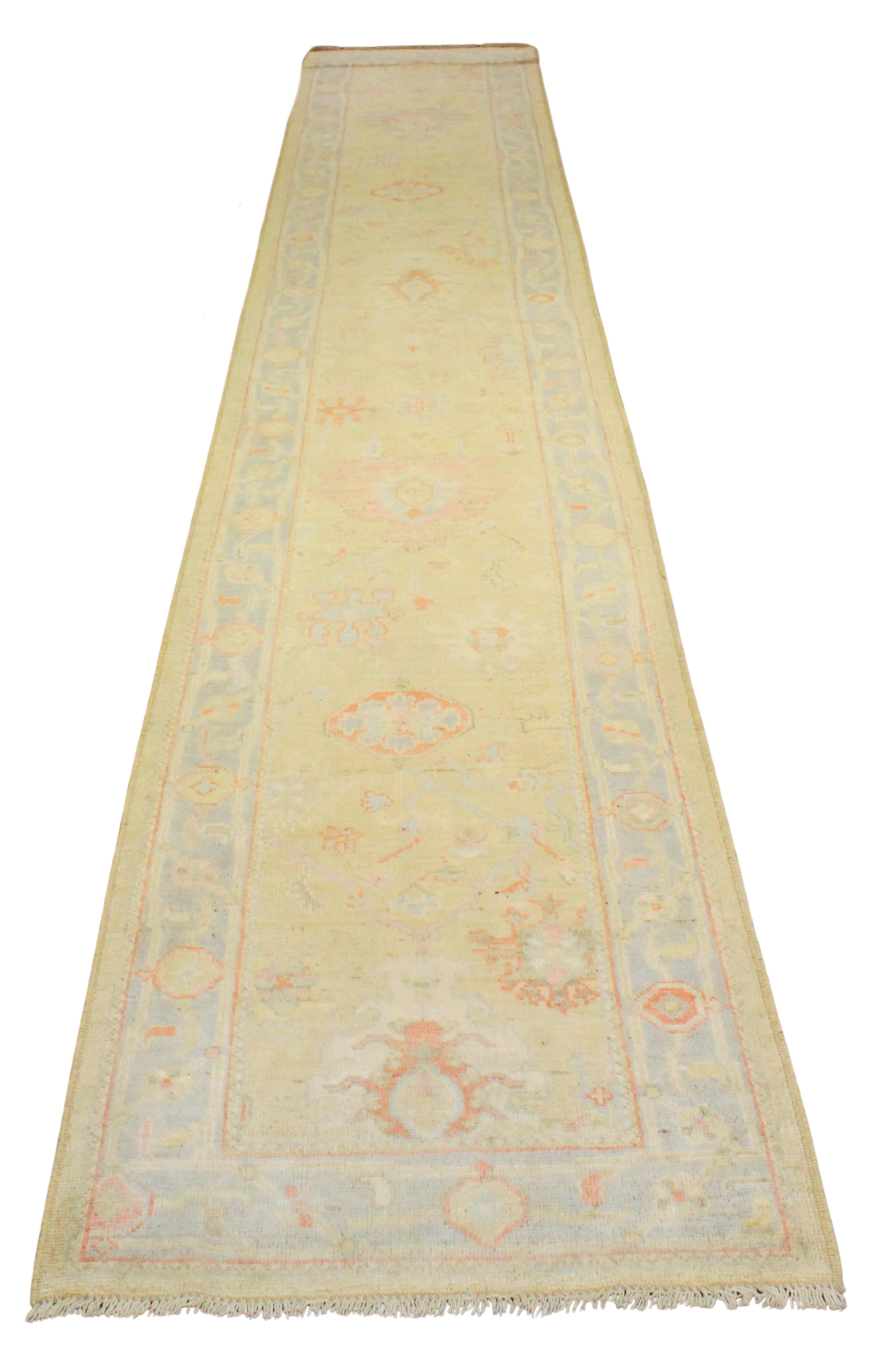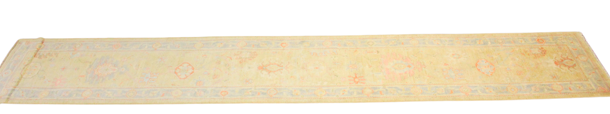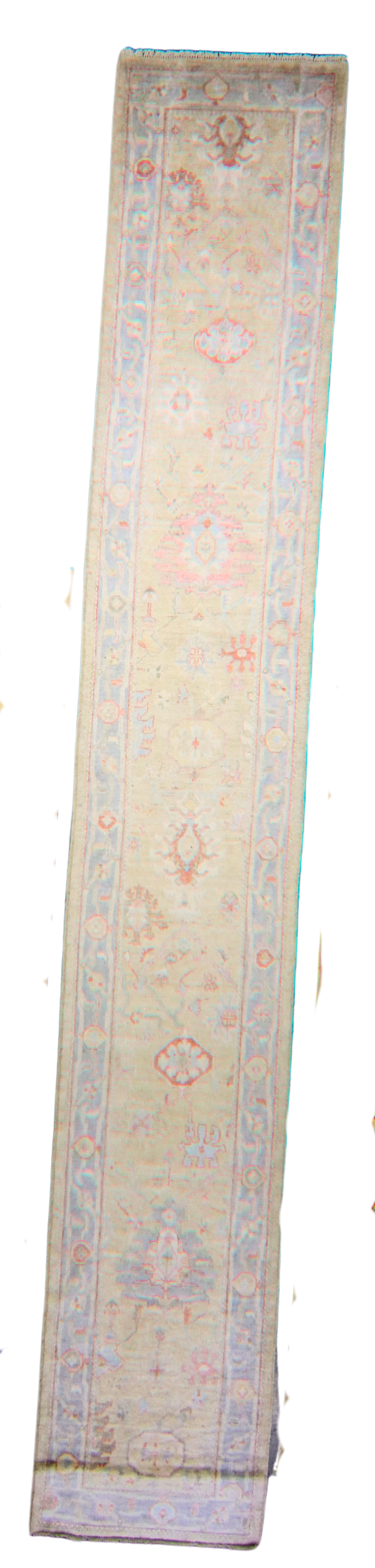 This exceptionally long Afghan Mahal runner evokes the delicacy of a watercolored dream. Faint blush, lavender, and soft sky blue tones emerge through a pale ivory ground, creating a washed and ethereal look that exudes softness and sophistication. Stylized palmettes, rosettes, and tribal motifs drift organically along its extended body, making it feel like a hand-painted mural stretching across your hallway.