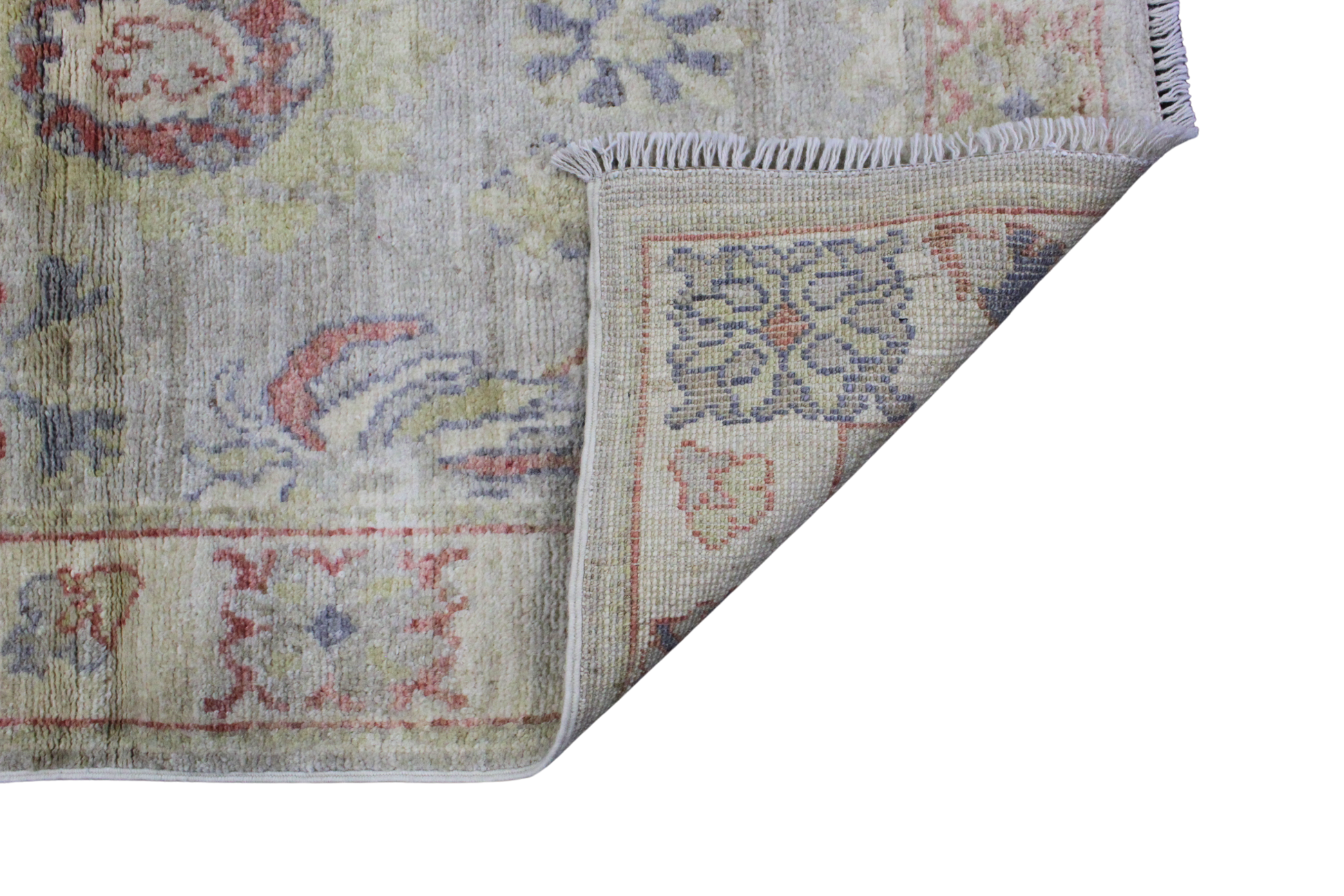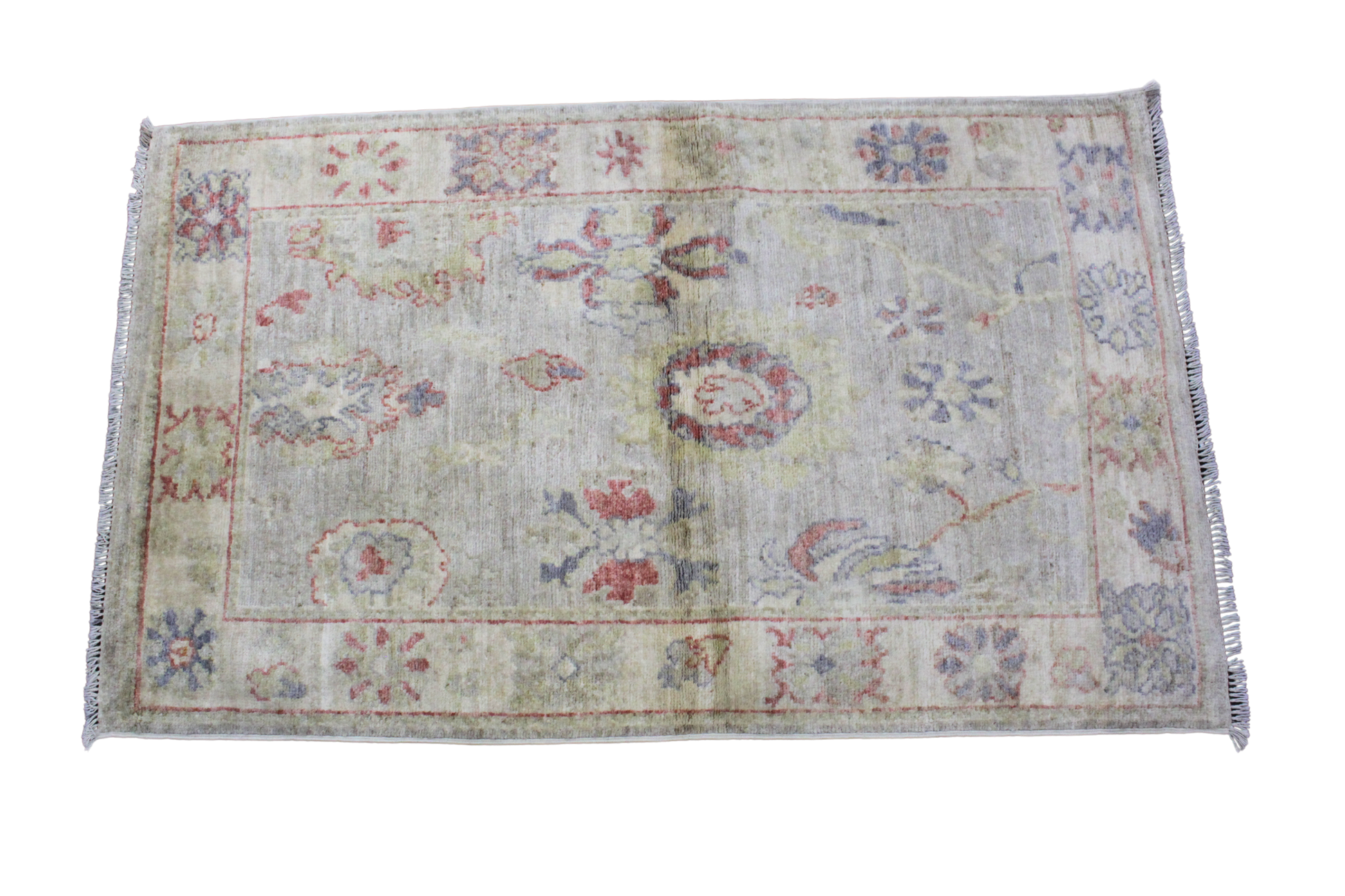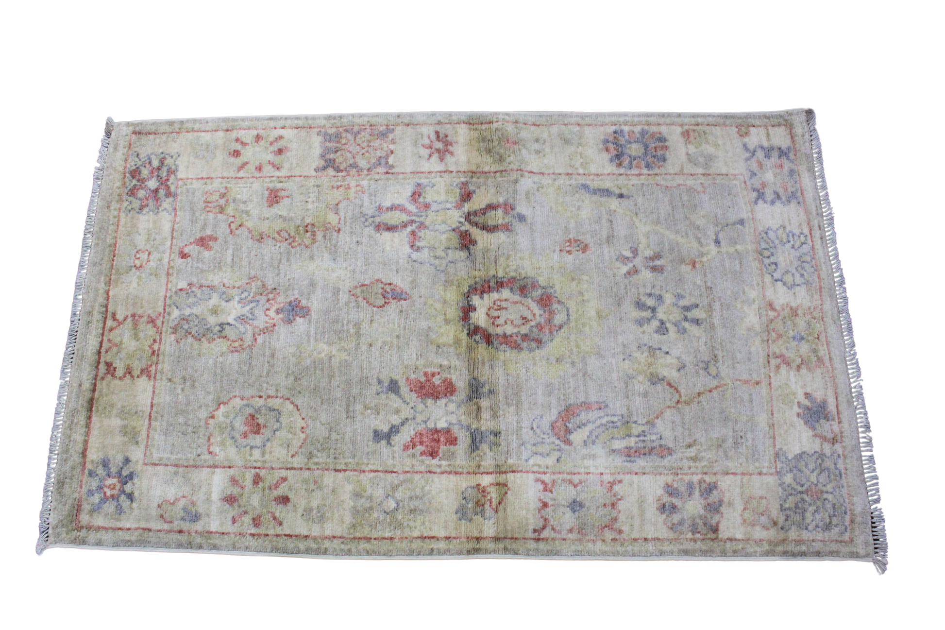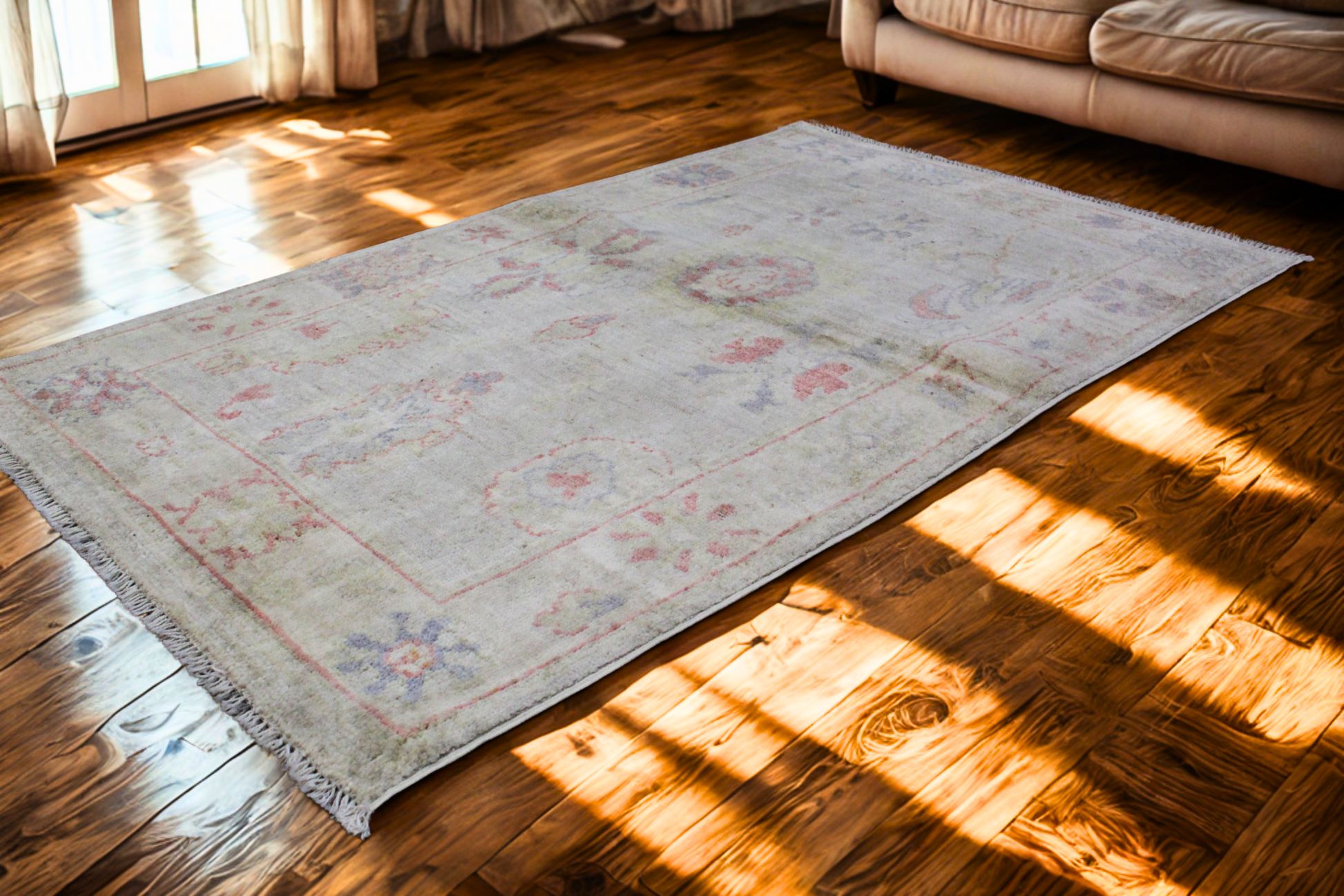 Sized at 3' x 5', this hand-knotted Afghan Oushak rug showcases a delicate balance of soft pastels and whimsical motifs. Subdued shades of faded sage, rose, powder blue, and ivory create a soothing, vintage-inspired palette that feels both fresh and timeless. The classic Oushak floral pattern is dispersed organically, framed by a light border adorned with simple rosettes and geometric forms.