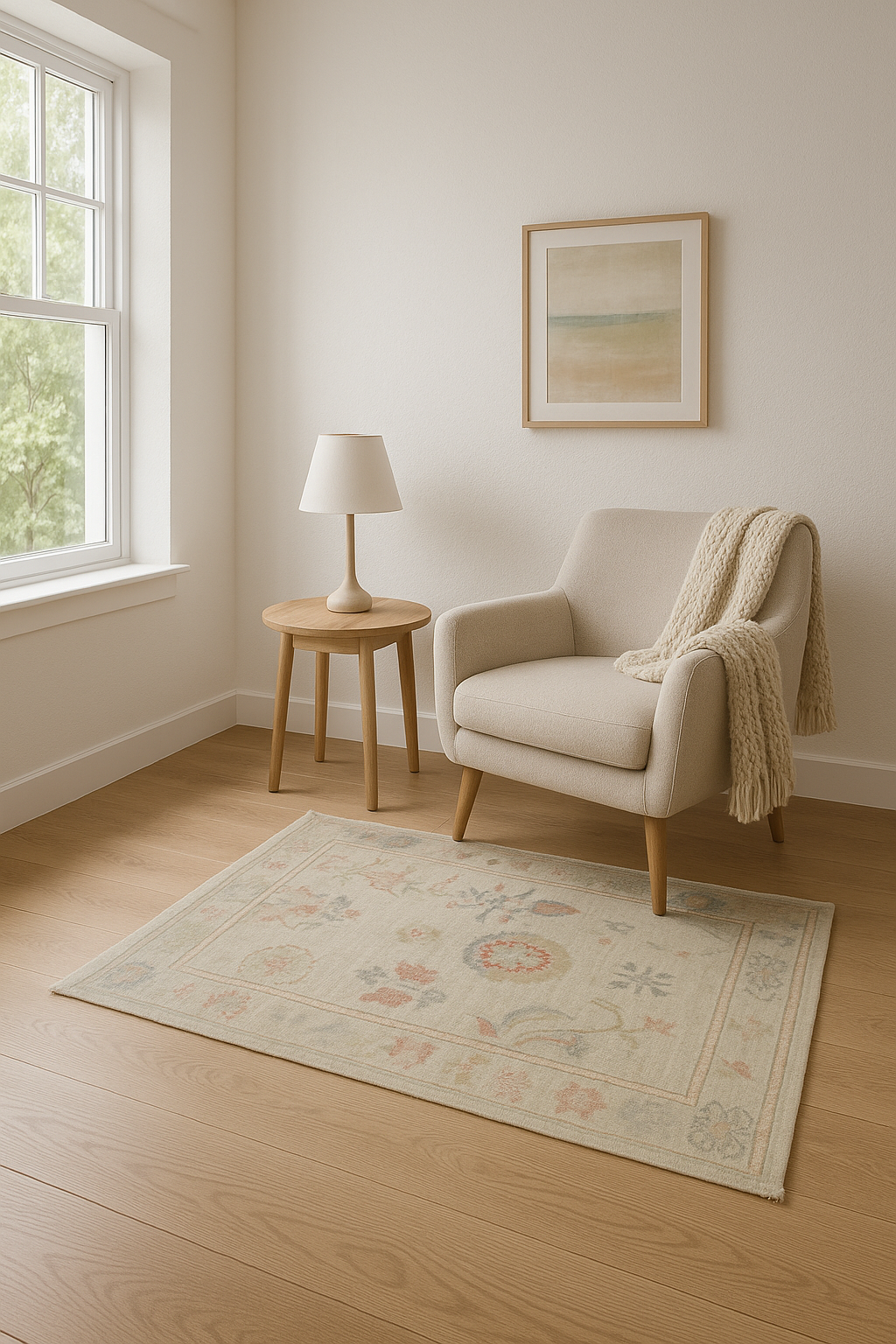 A graceful blend of tradition, craftsmanship, and timeless appeal—this Oushak rug will elevate the atmosphere of any room with its quiet grandeur.